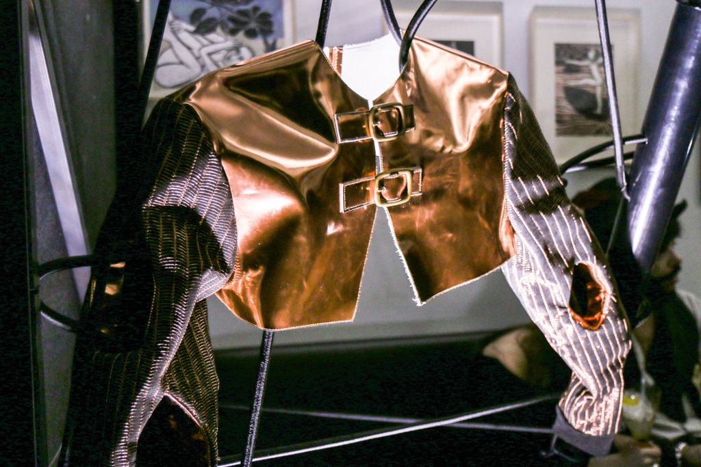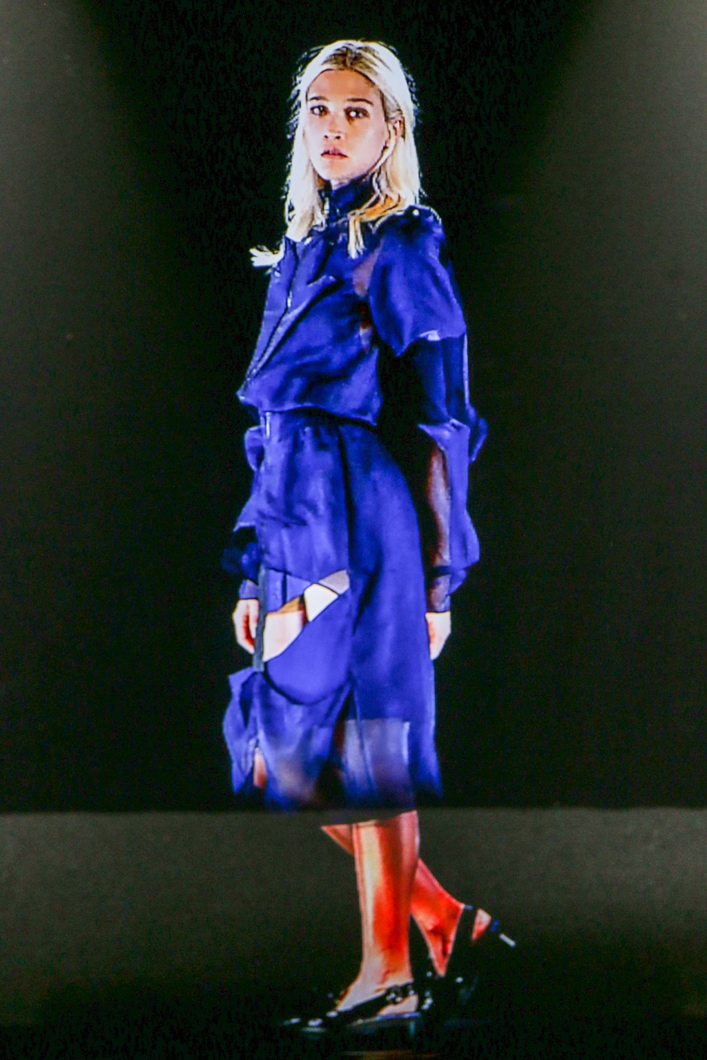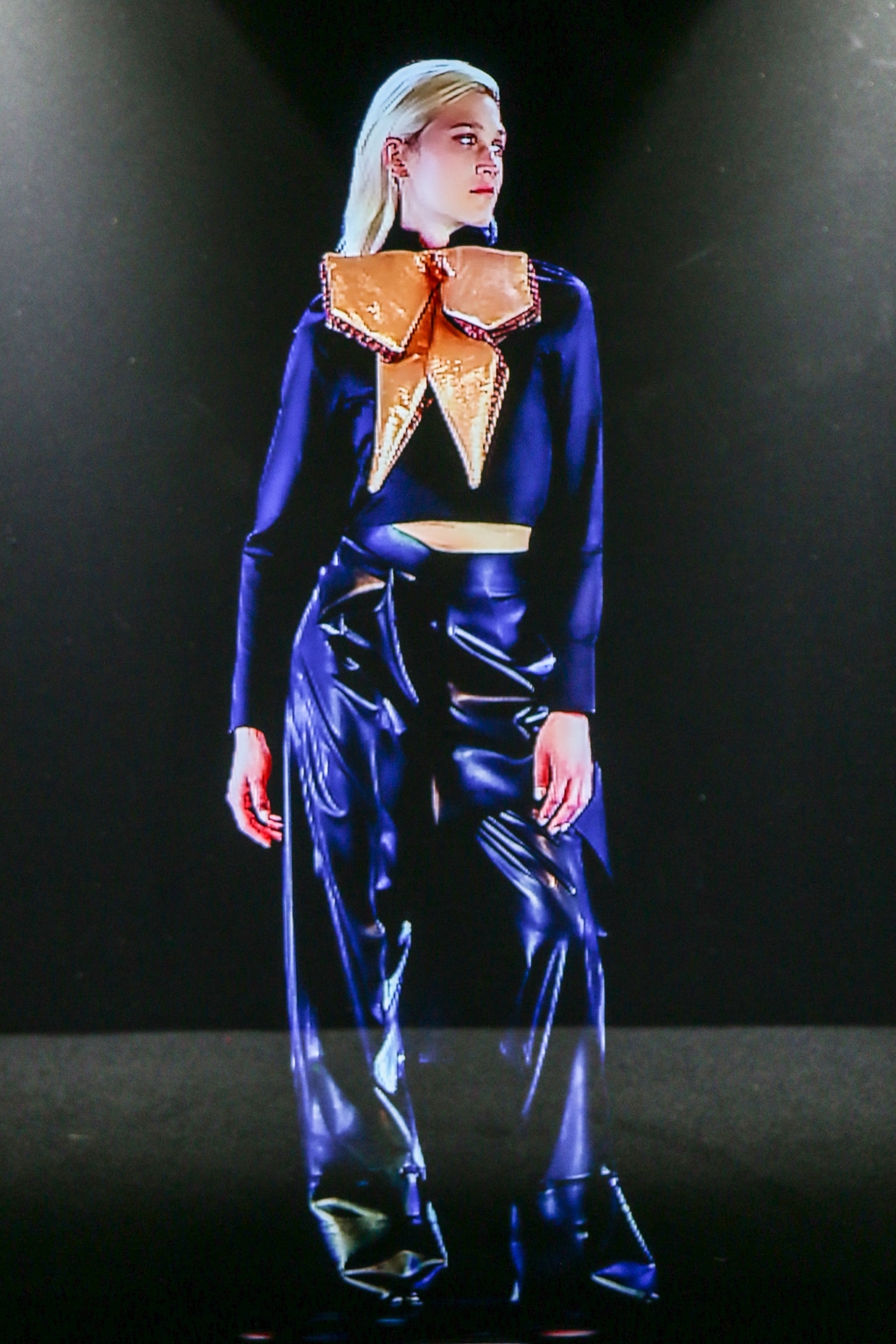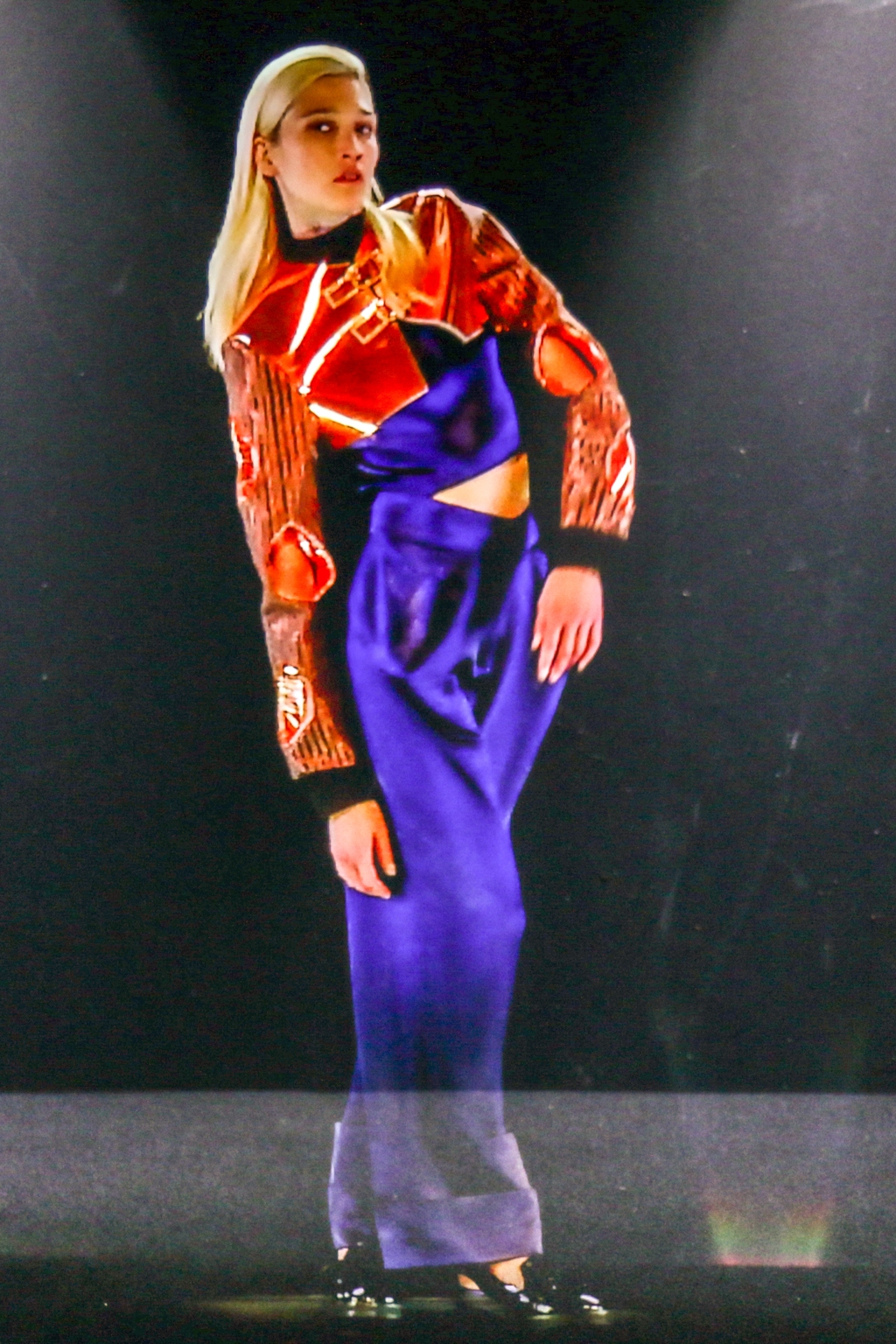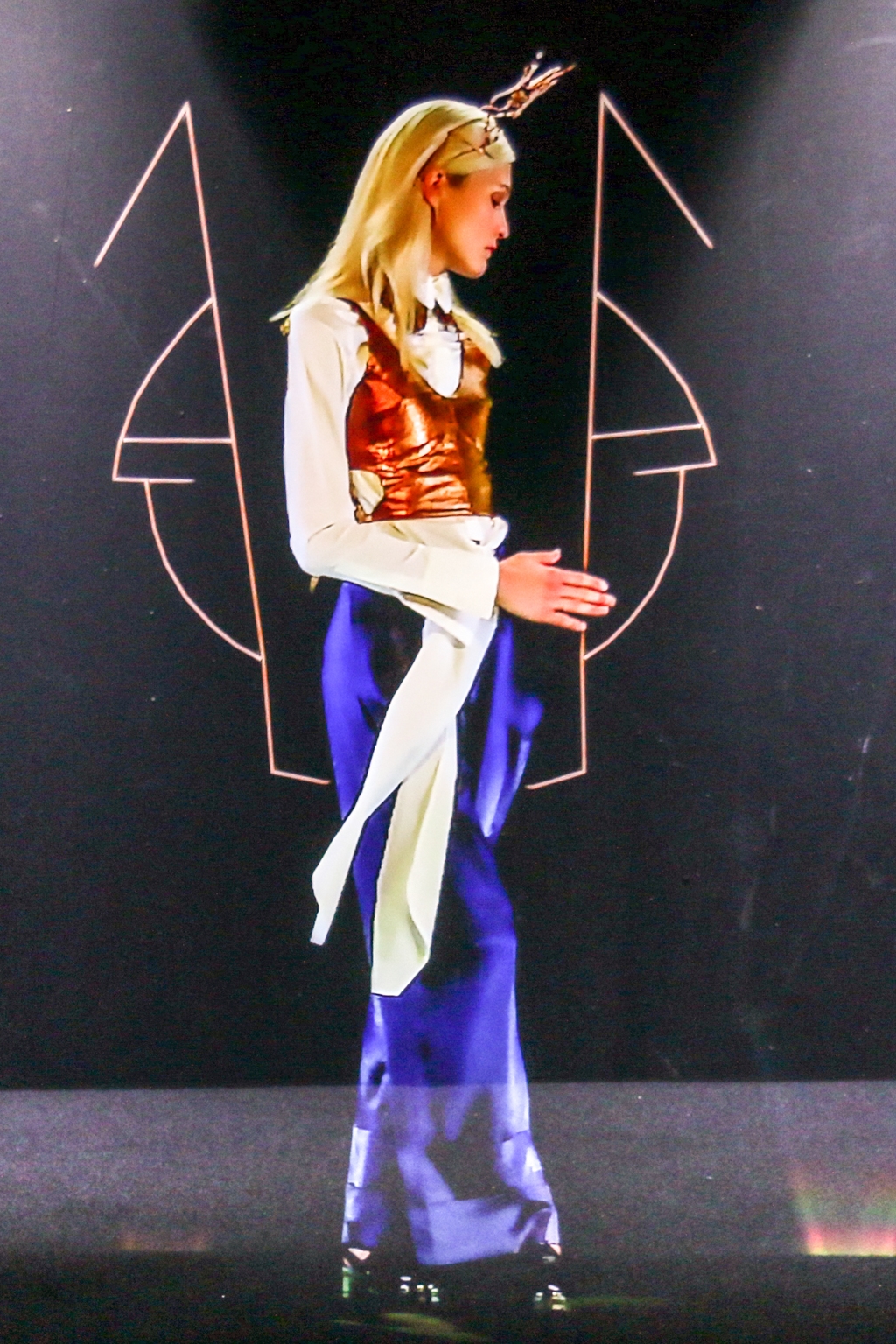 Progressing from light to dark metallic colour schemes interspersed with holograms modelling her collection, the theme of experimentalism cognizant of the fashion industry’s shift to industrial chic was evident in her pieces. Using her signature copper, silver, blue and white as the main palette features, embossed textured bomber jackets and a boiler suit in midnight blue indicated Clayton’s flair for incorporating classic fashion staples with postmodern statement pieces.