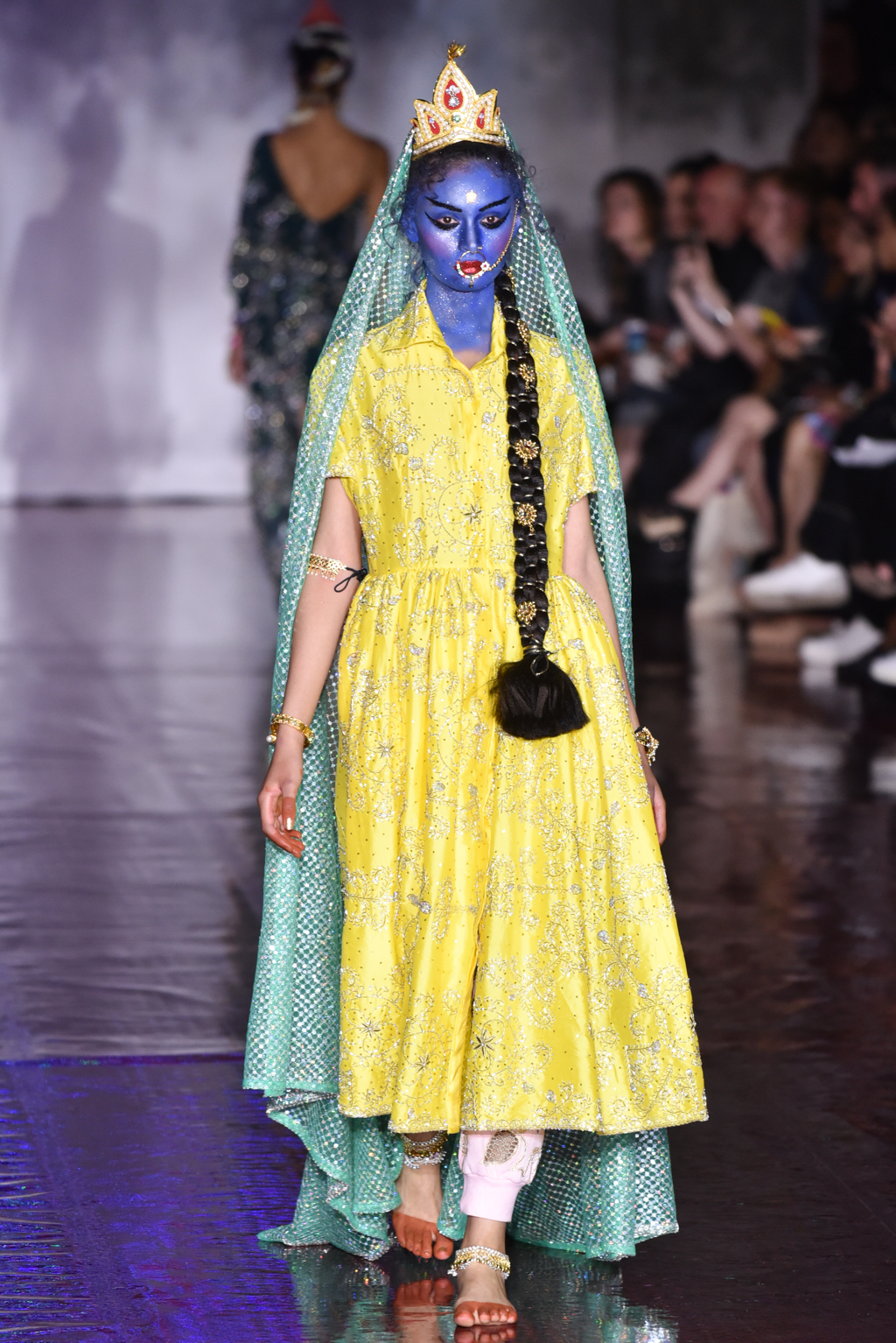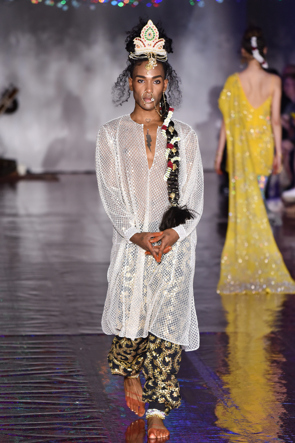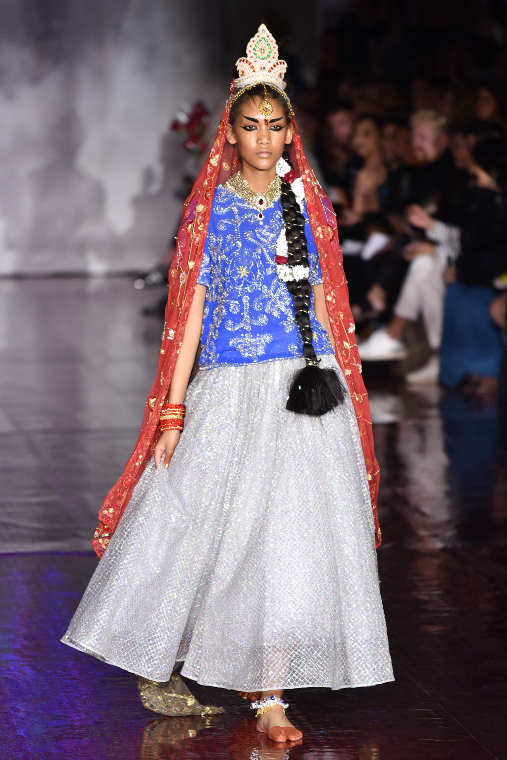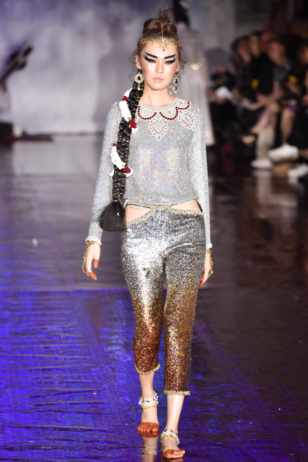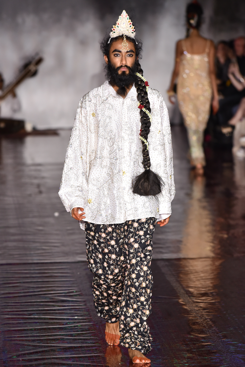 As someone who frequently takes inspiration from his own cultural heritage, Ashish’s focus this season was on Bollywood pop culture combined with more traditional elements. Each look was gender fluid, with both male and female models walking the catwalk – some with live snakes wrapped around their necks.