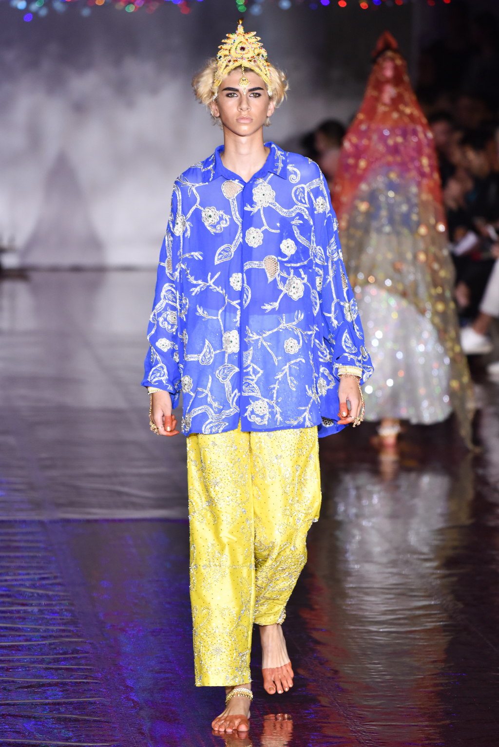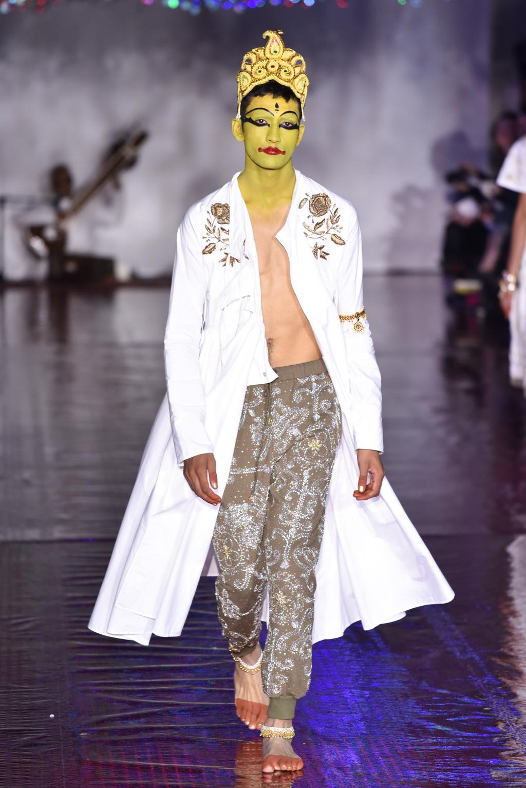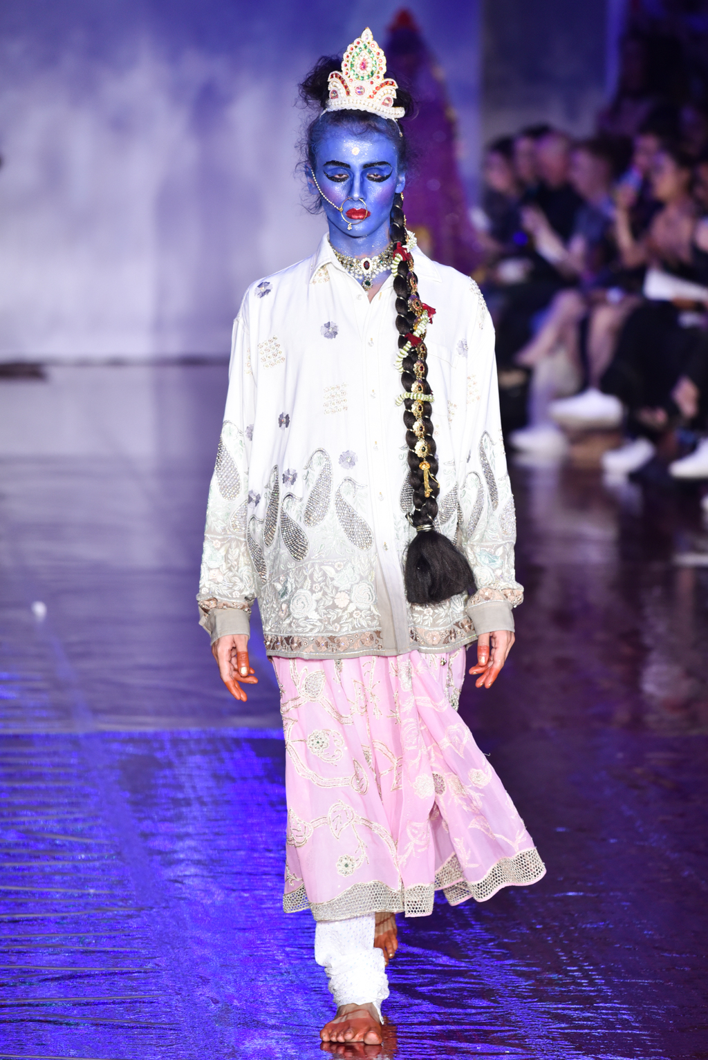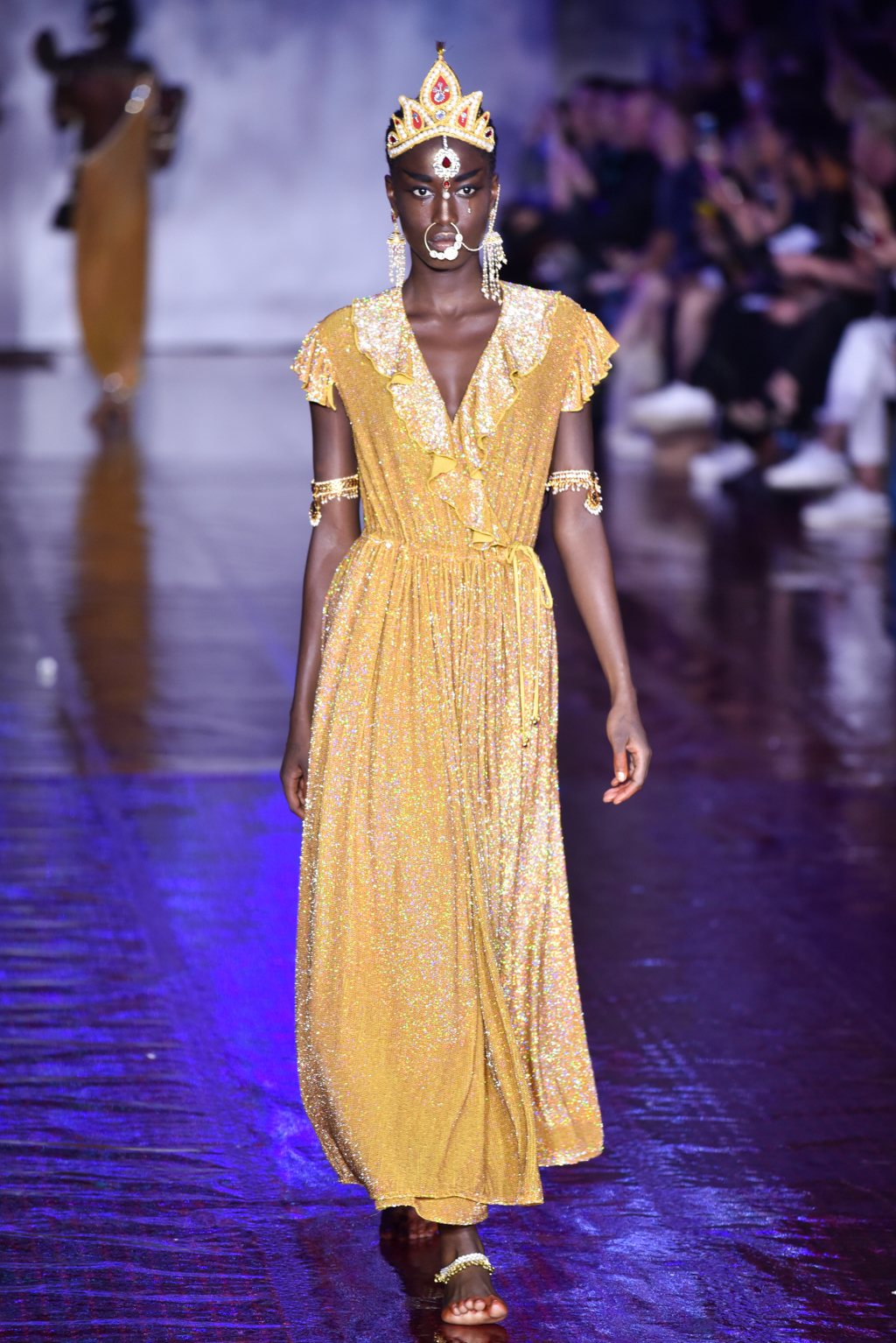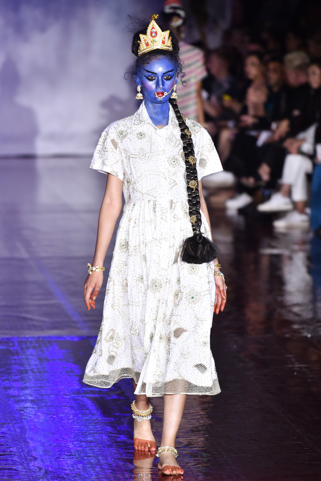 As someone who frequently takes inspiration from his own cultural heritage, Ashish’s focus this season was on Bollywood pop culture combined with more traditional elements. Each look was gender fluid, with both male and female models walking the catwalk – some with live snakes wrapped around their necks.
