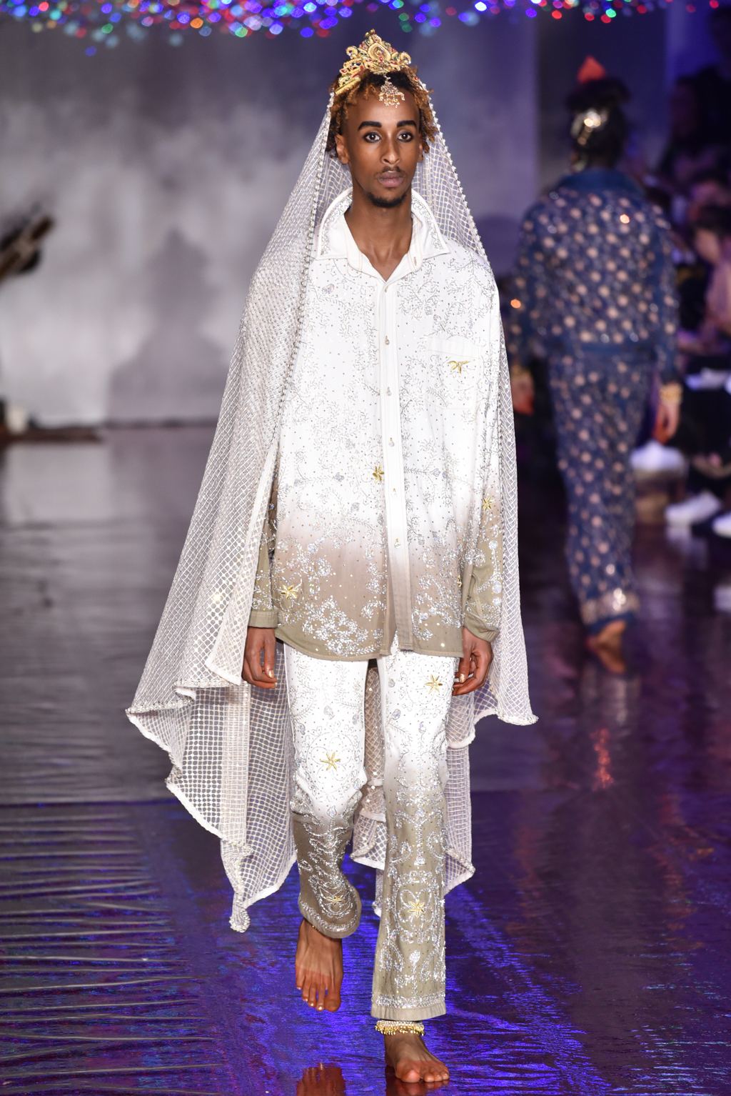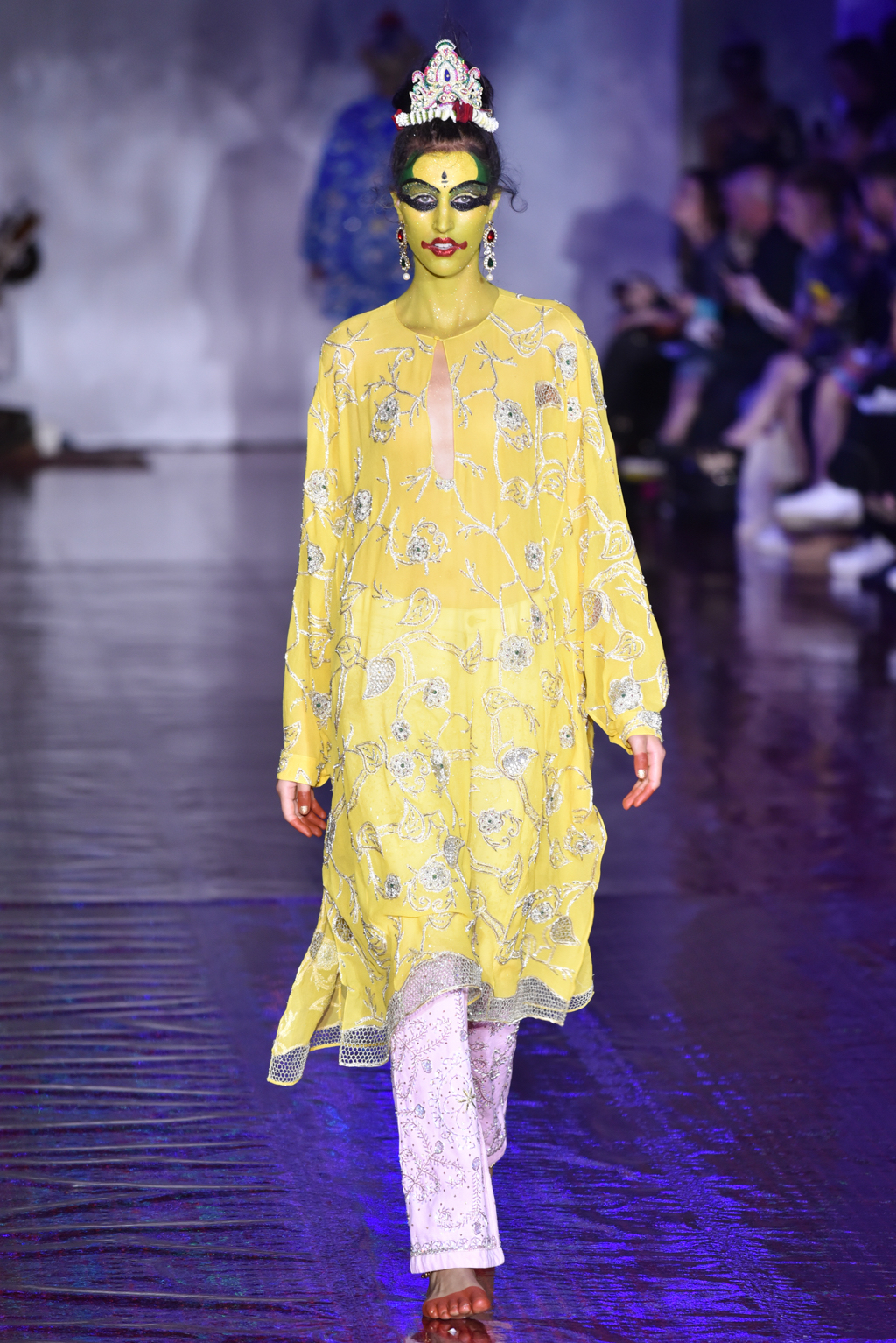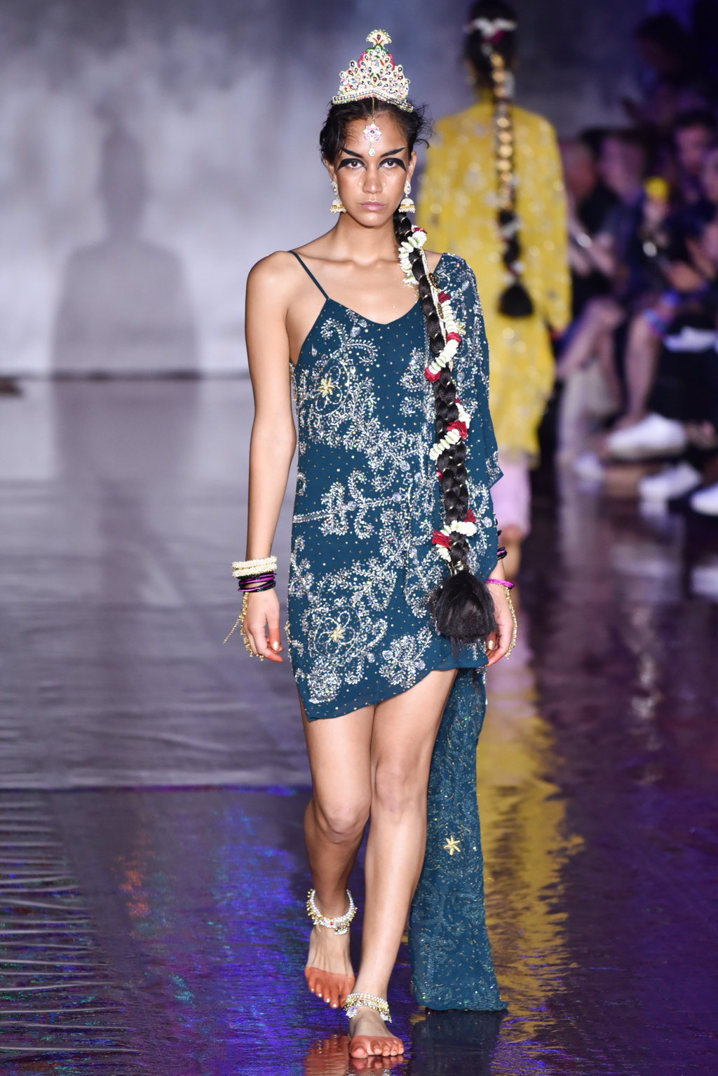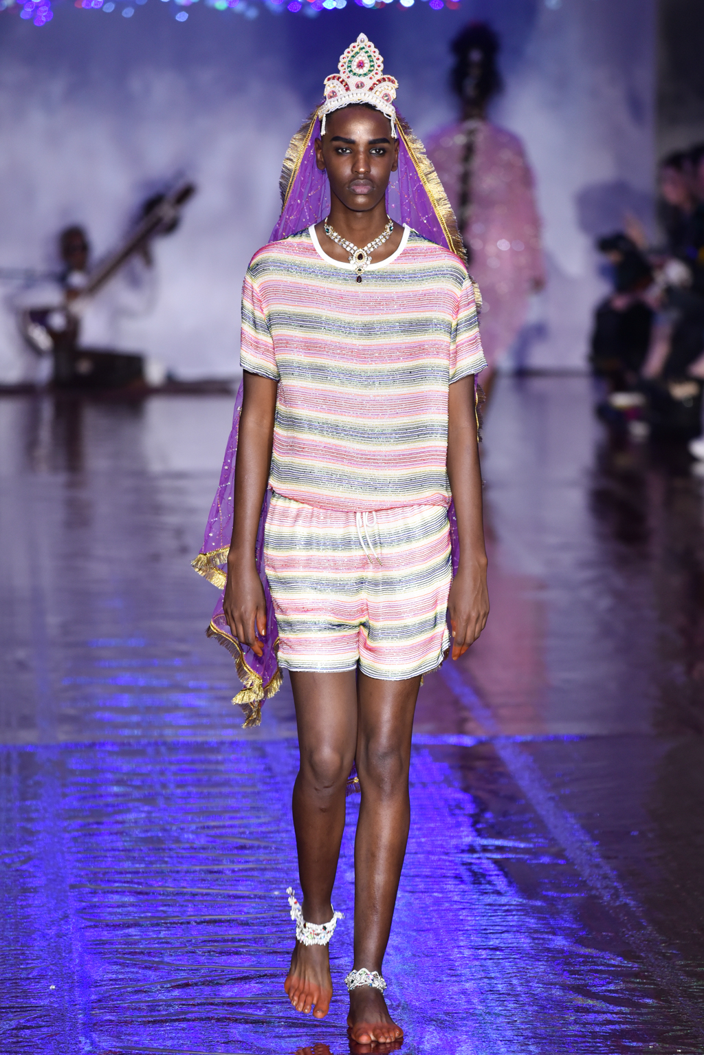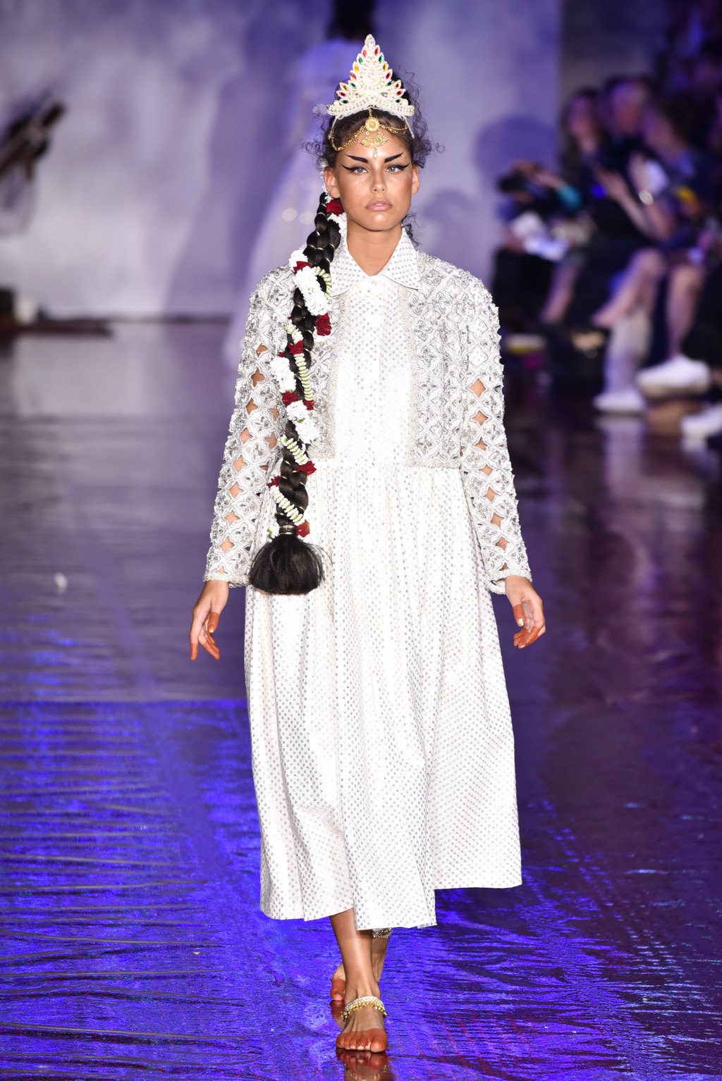 As someone who frequently takes inspiration from his own cultural heritage, Ashish’s focus this season was on Bollywood pop culture combined with more traditional elements. Each look was gender fluid, with both male and female models walking the catwalk – some with live snakes wrapped around their necks.