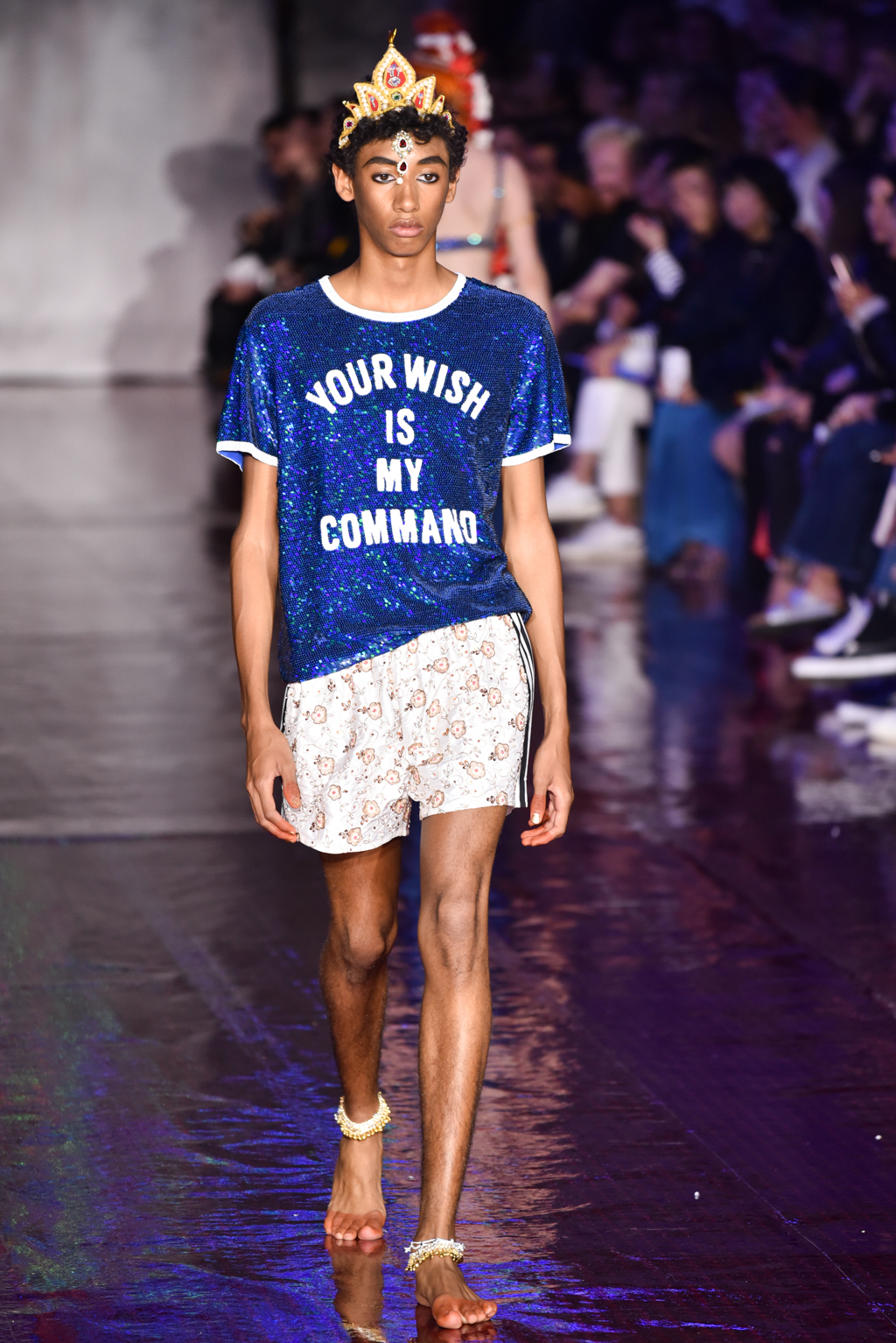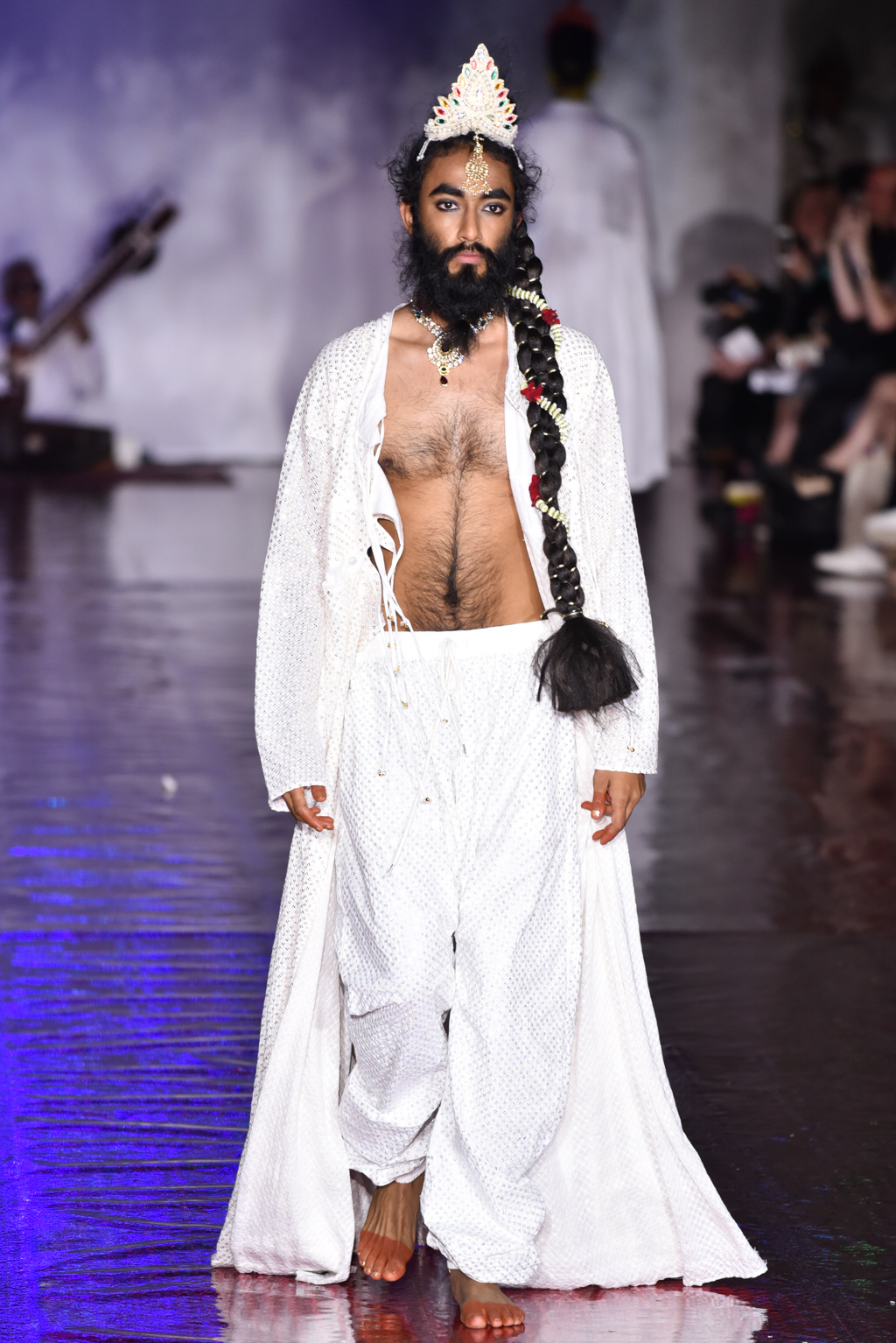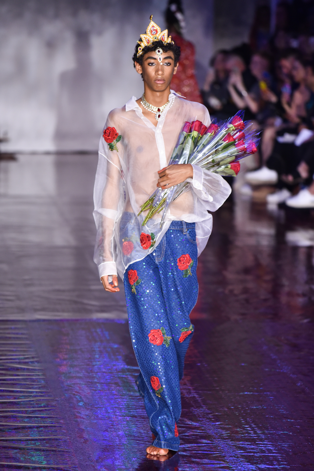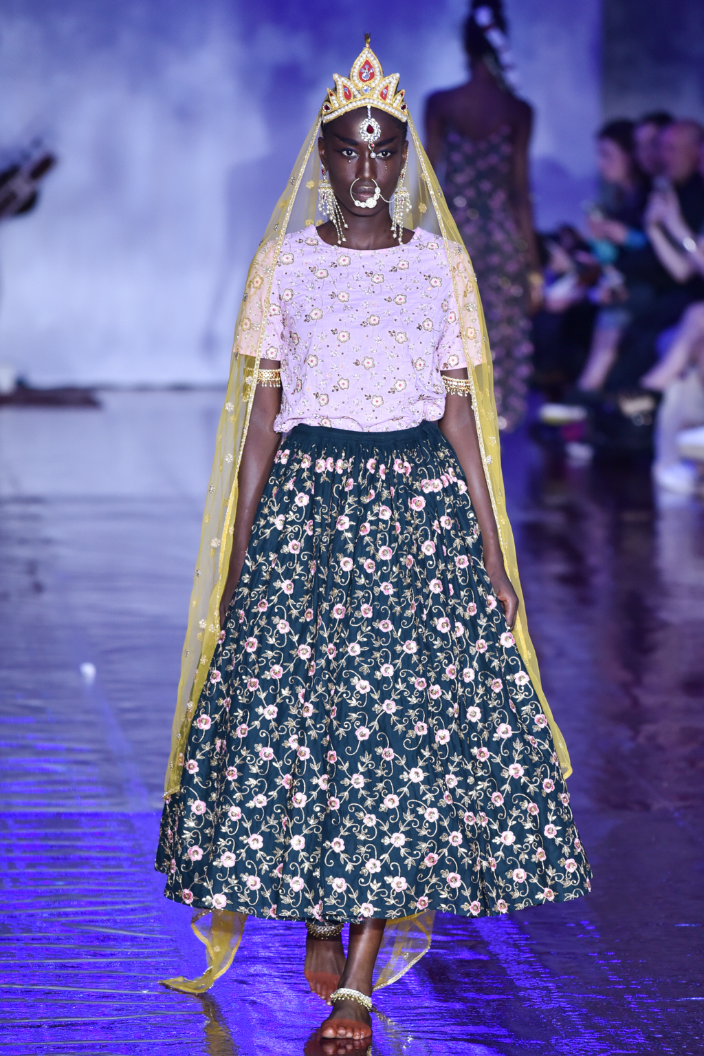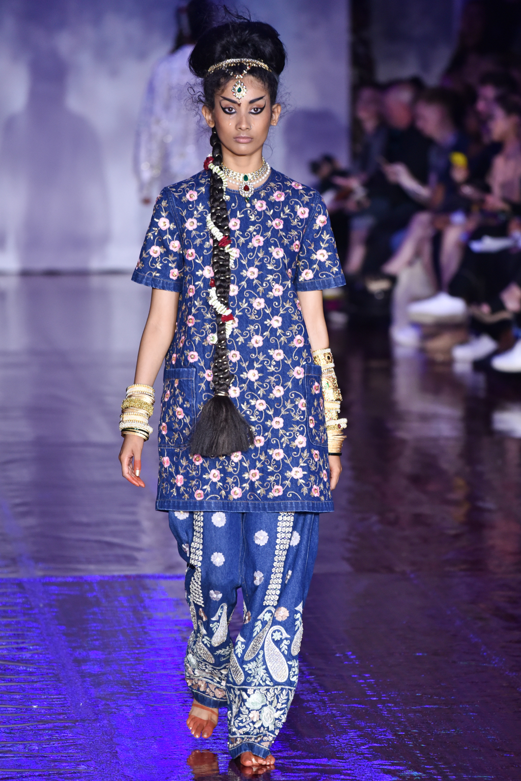 As someone who frequently takes inspiration from his own cultural heritage, Ashish’s focus this season was on Bollywood pop culture combined with more traditional elements. Each look was gender fluid, with both male and female models walking the catwalk – some with live snakes wrapped around their necks.