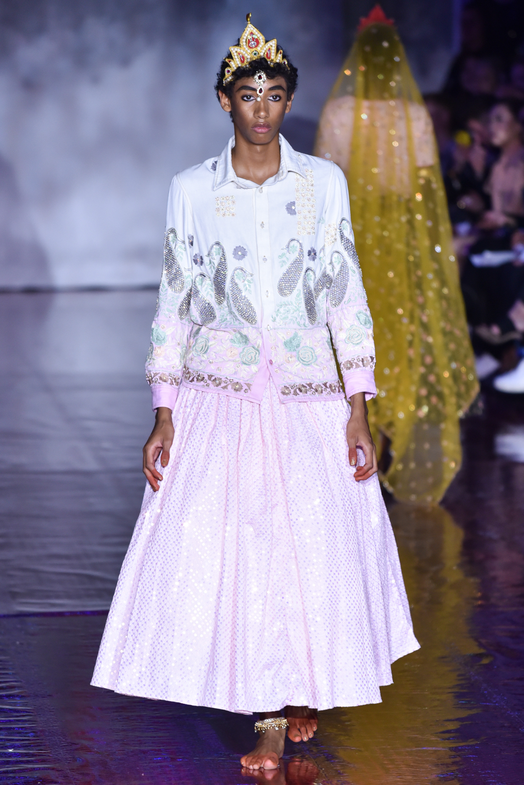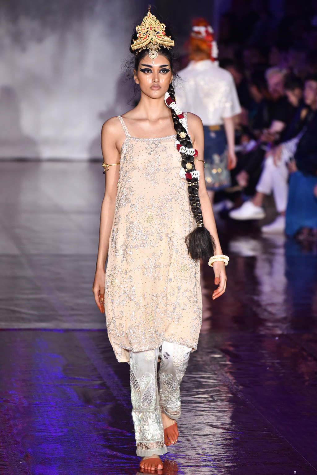 Beneath a sparkling cloud of fairy lights, model Neelam Gill opened Ashish’s spring 2017 show in a diamante-embellished pale pink tunic-and-trouser combo. It was a richly elaborate, dramatic first look that was to set the tone for a collection that reflected the Delhi-born designer’s love of all things sequined.
