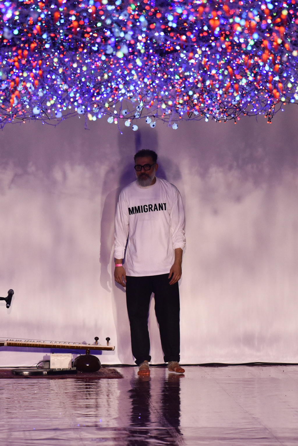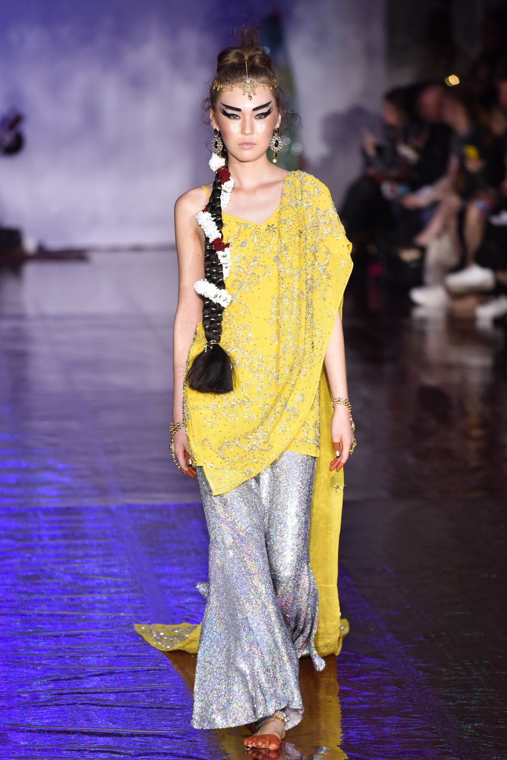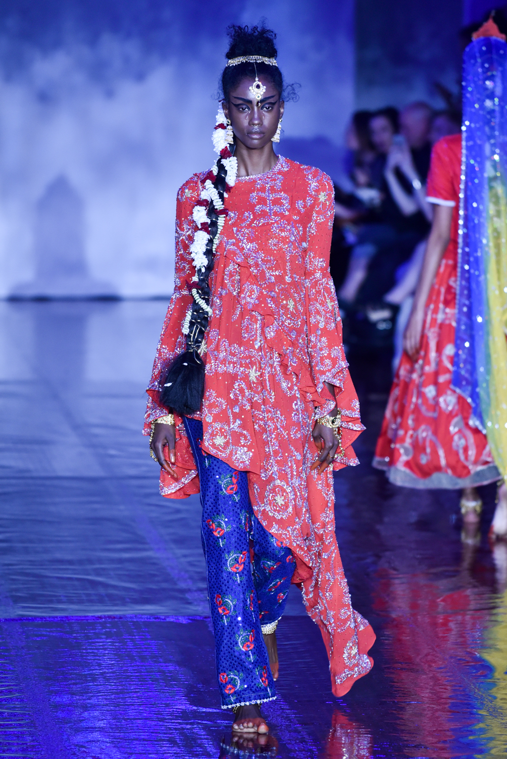 Throughout the show there were rich colours, intricate embroideries and – of course – sequins. Loose-fitting, longline tunics seemed to echo the silhouette of the traditional kurta, whilst sweeping beaded veils evoked a bridal mood. Elsewhere, vibrant tops were finished with sweeping folds of fabric that draped across one shoulder and trailed behind the wearer; Ashish’s reimagining of the traditional sari, perhaps.