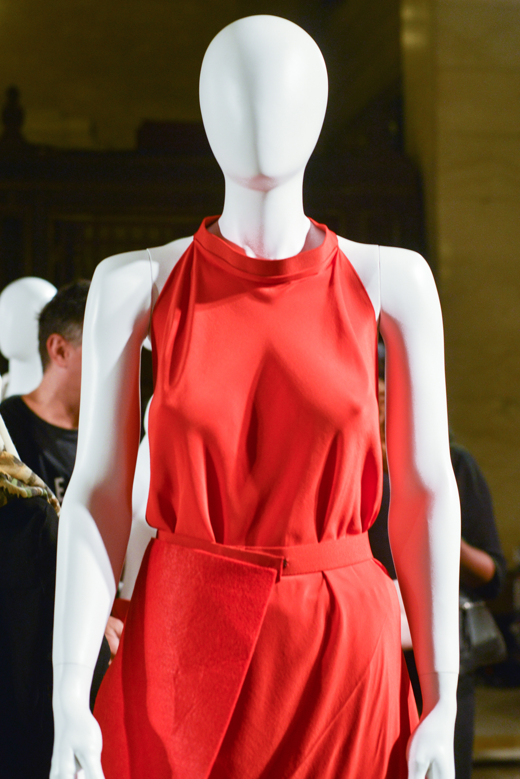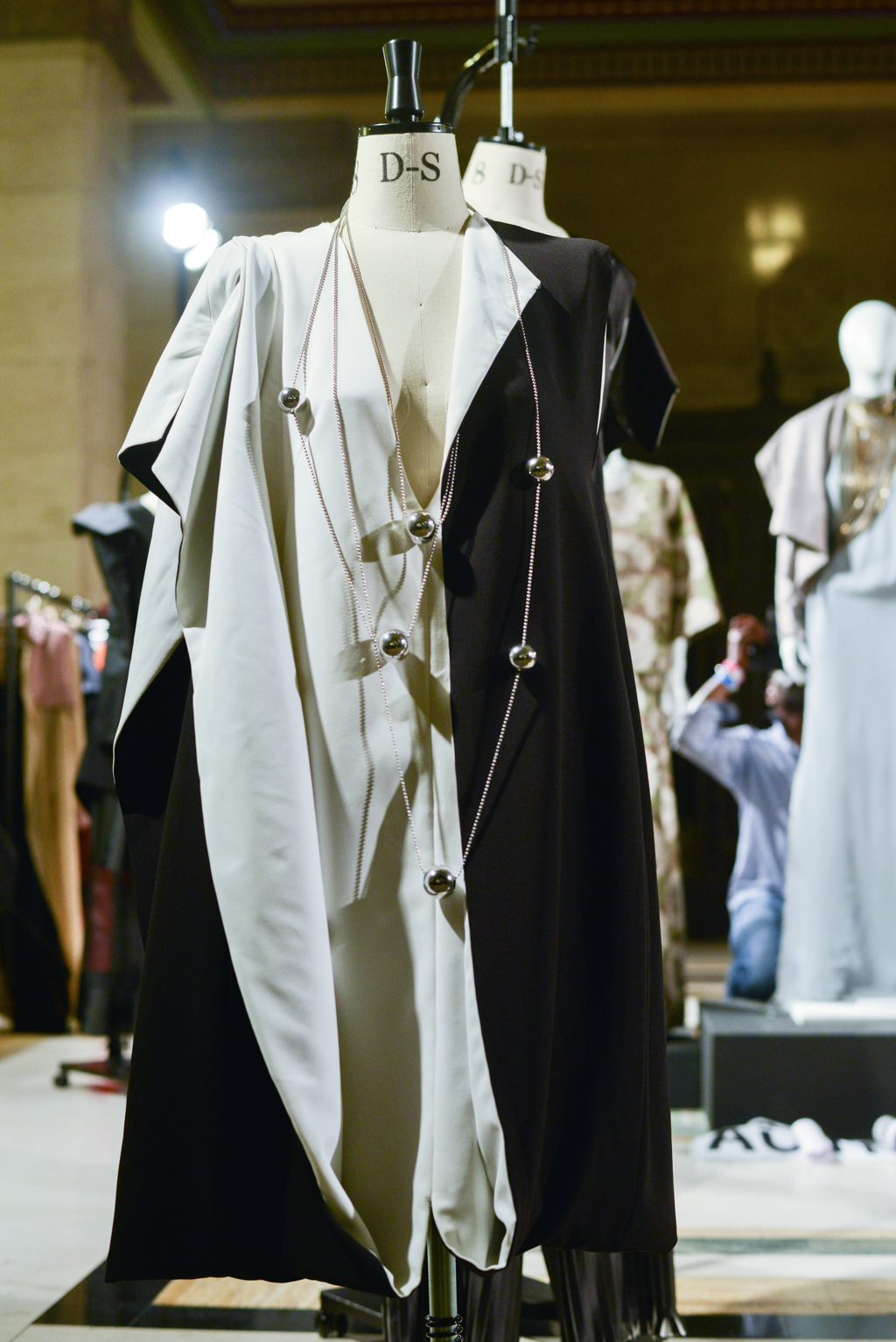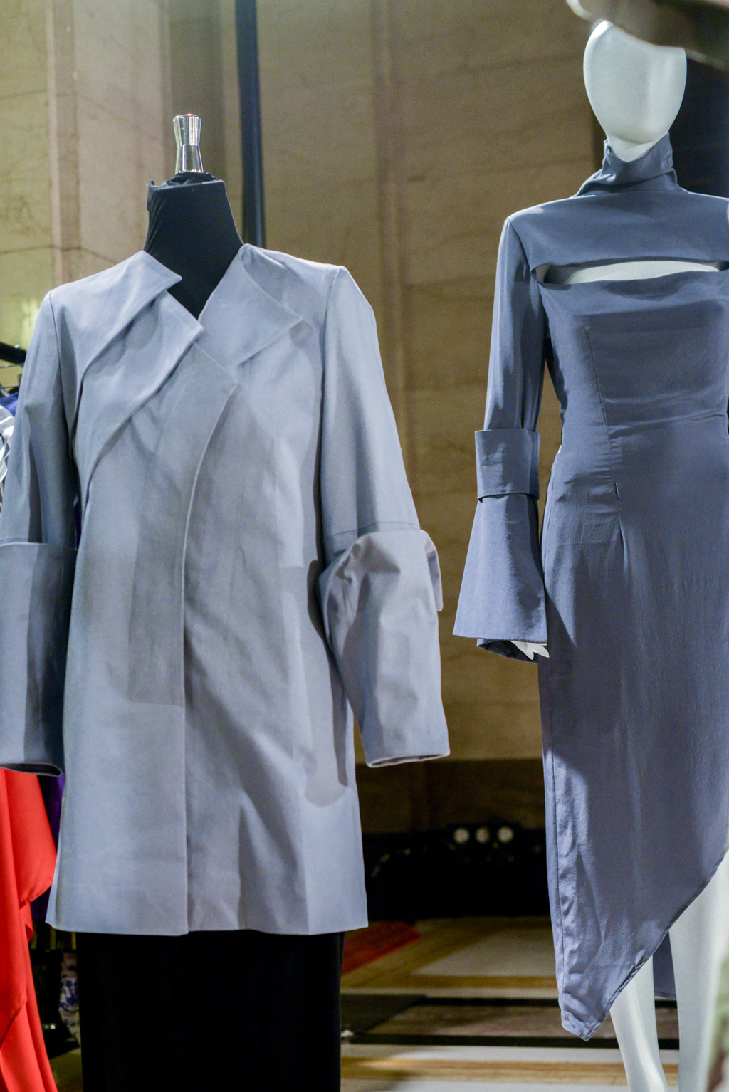 Han Wen’s collection was designed with the theme of women empowerment. This was conveyed through the use of elegant feminine shapes and colours detailed with harsh metal rings and studs used to hold together sections of fabric. The overall effect of this gave a strong, edgy appearance to the designs which correlated with Wen’s thesis; to express a defiant yet romantic female.