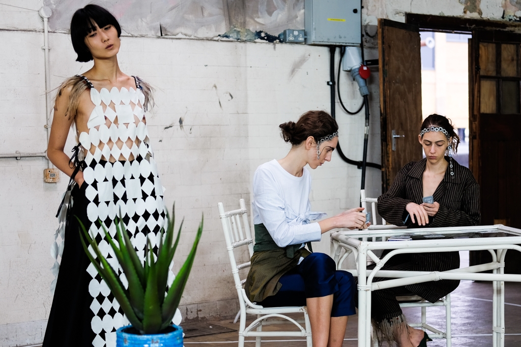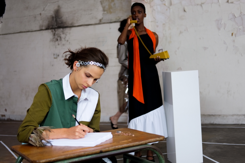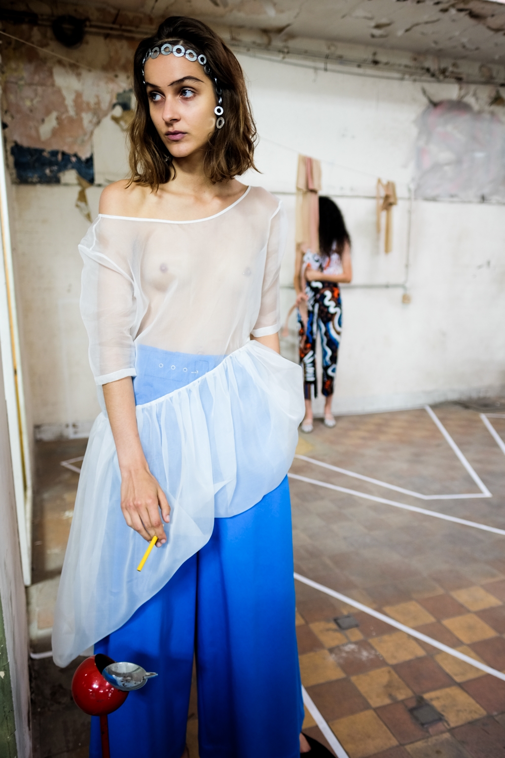 On the top floor of the abandoned Old Truman Brewery in Shoreditch, something strange is taking place. The floor is divided into squares using white tape, inside each of which a scene is being played out. A trio of girls plait each others’ hair, another hangs stockings on a washing line, a fifth lounges on a deckchair, lazily jiggling her zebra kitten-heeled foot. It’s rather like a living doll house has been deconstructed and the scenes from each room placed in the same loft space – although on repeat, as though there is only a minute’s footage of each scene. This is the Isa Arfen SS17 presentation.