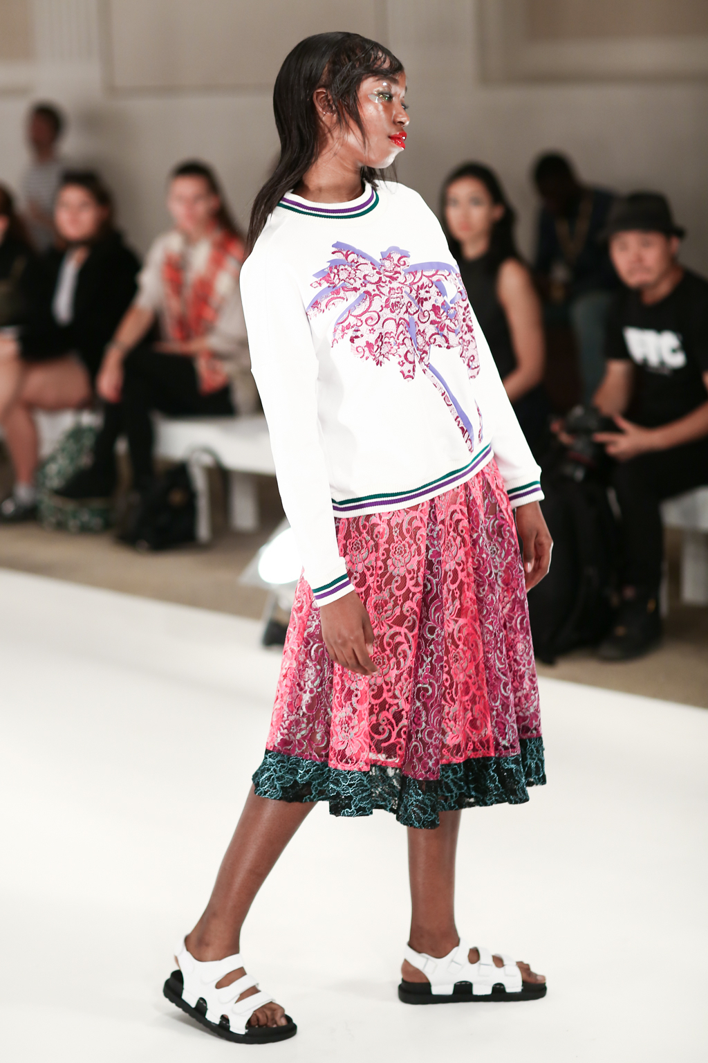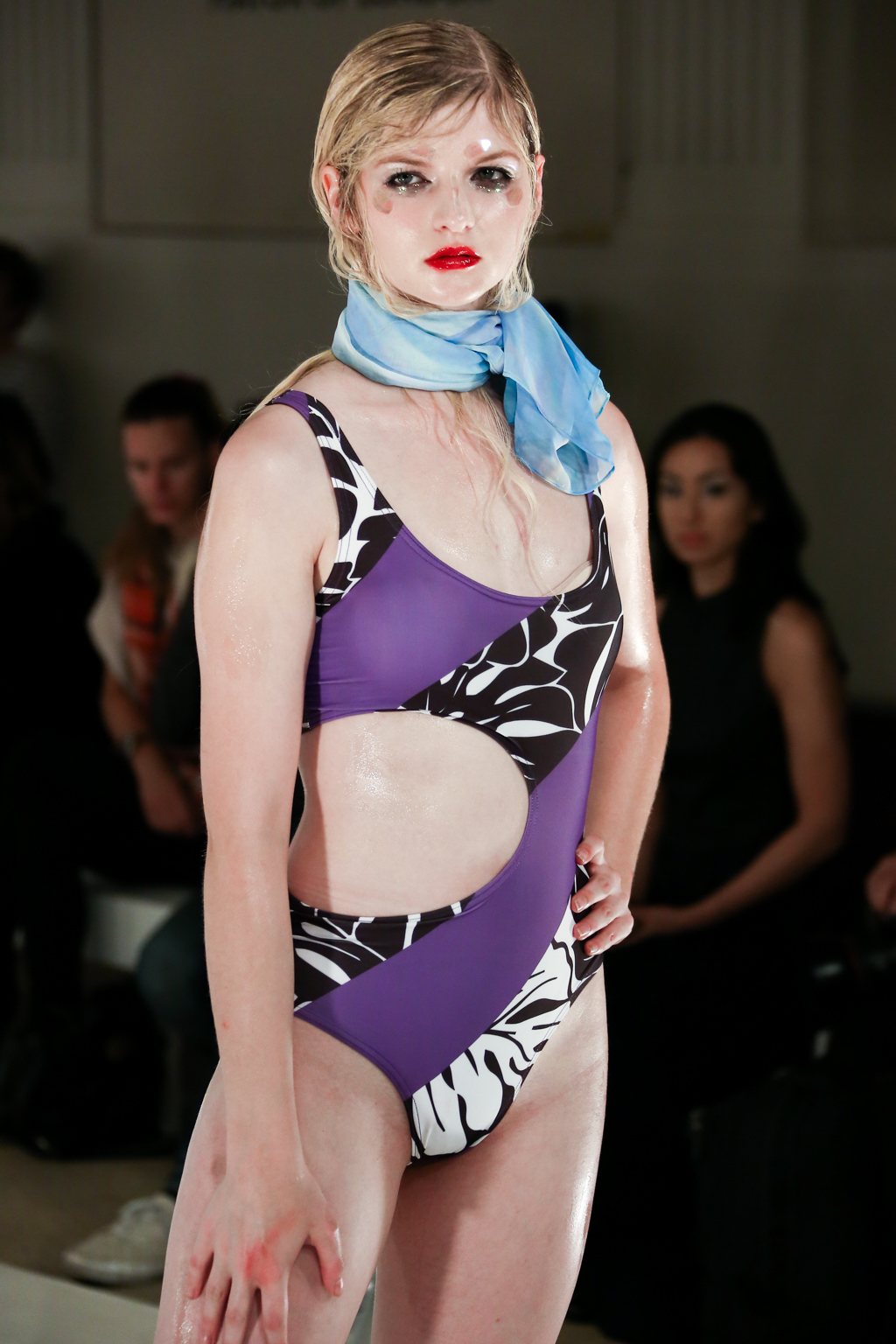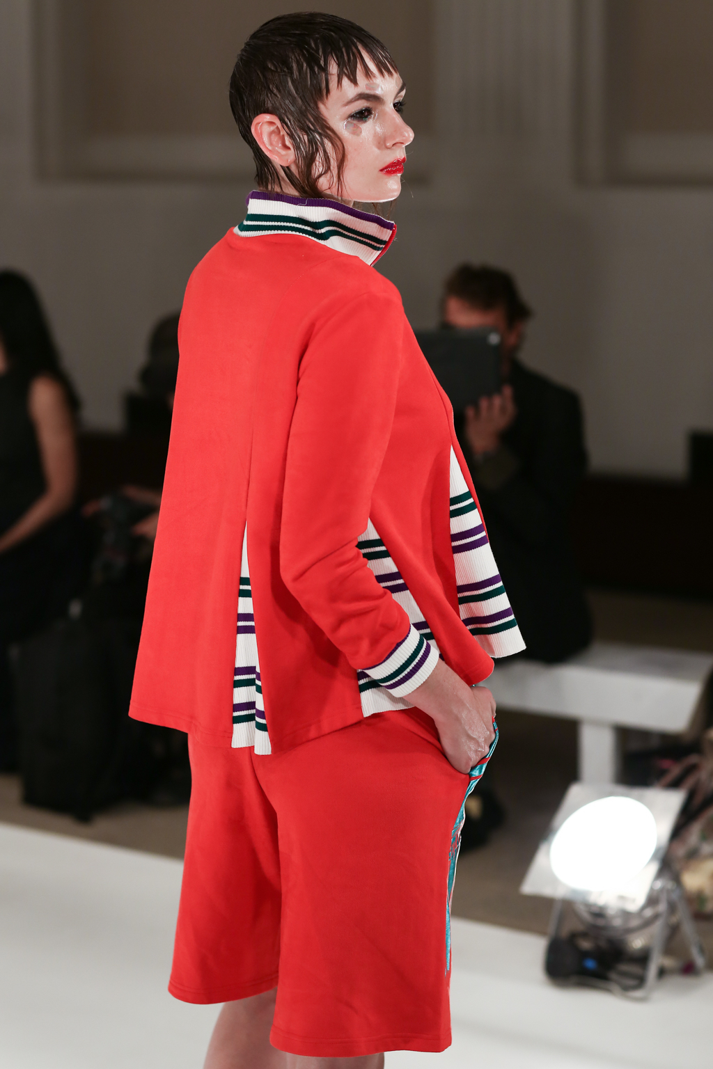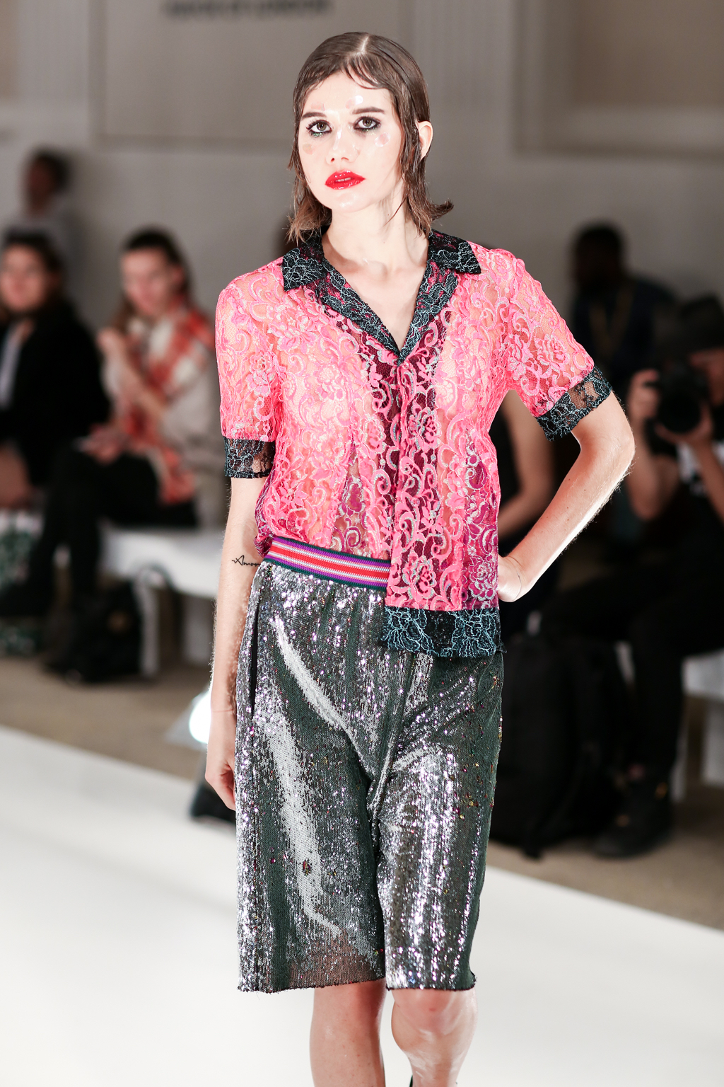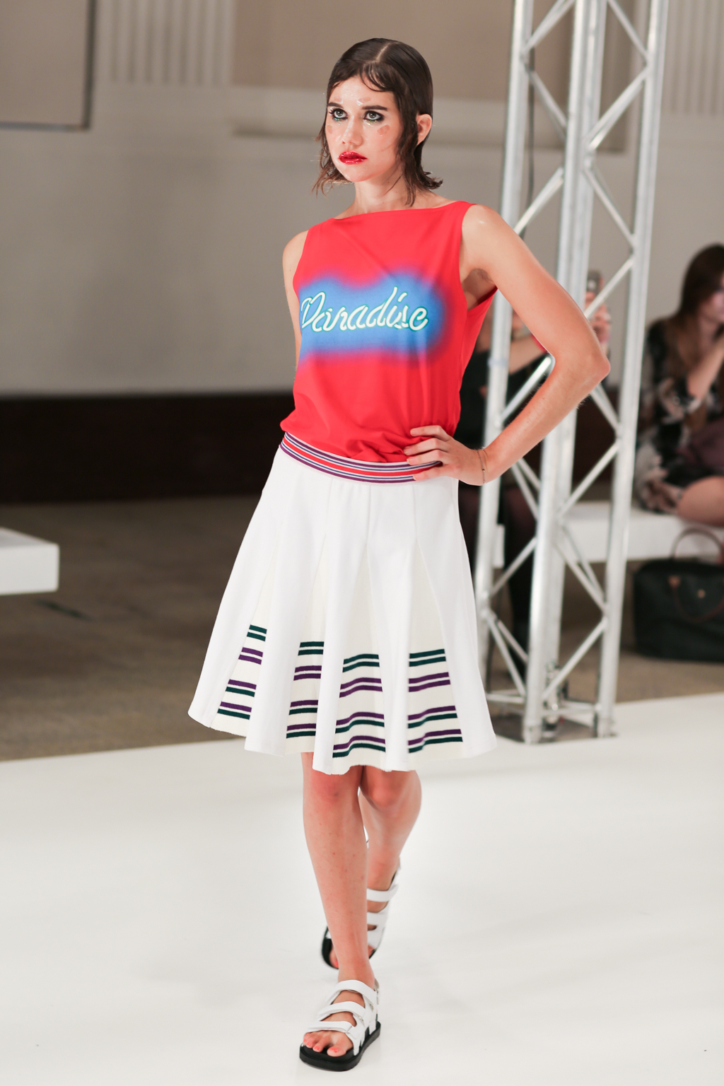 The London-based design duo behind PointBlank._ used a wider variety of fabrics, printing techniques and details in this season’s collection than ever before. One such print was based on the type of neon sign you might expect to find outside a motel somewhere in the middle of the American nowhere, glowing letters transformed into a slogan on a sleeveless T-shirt.