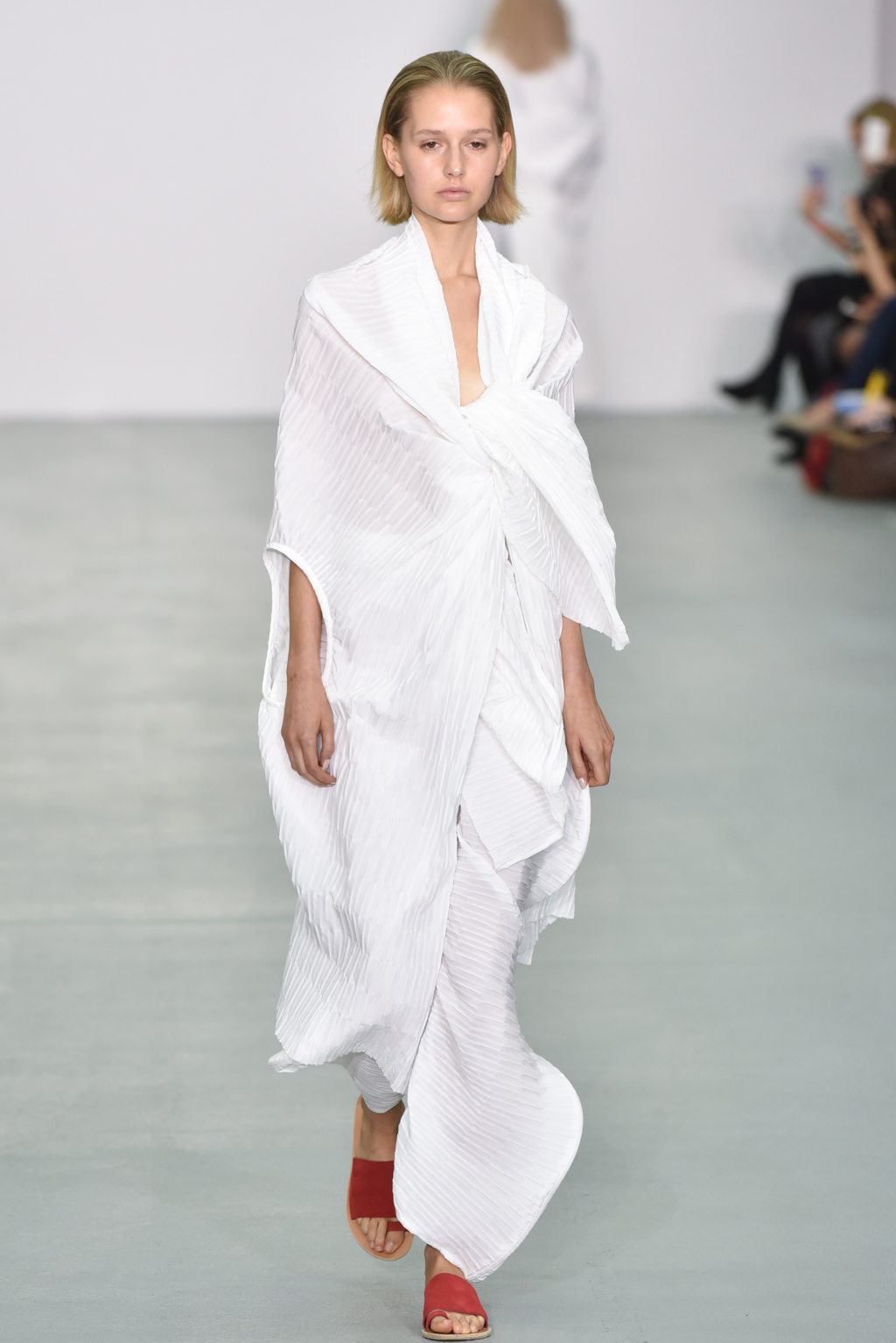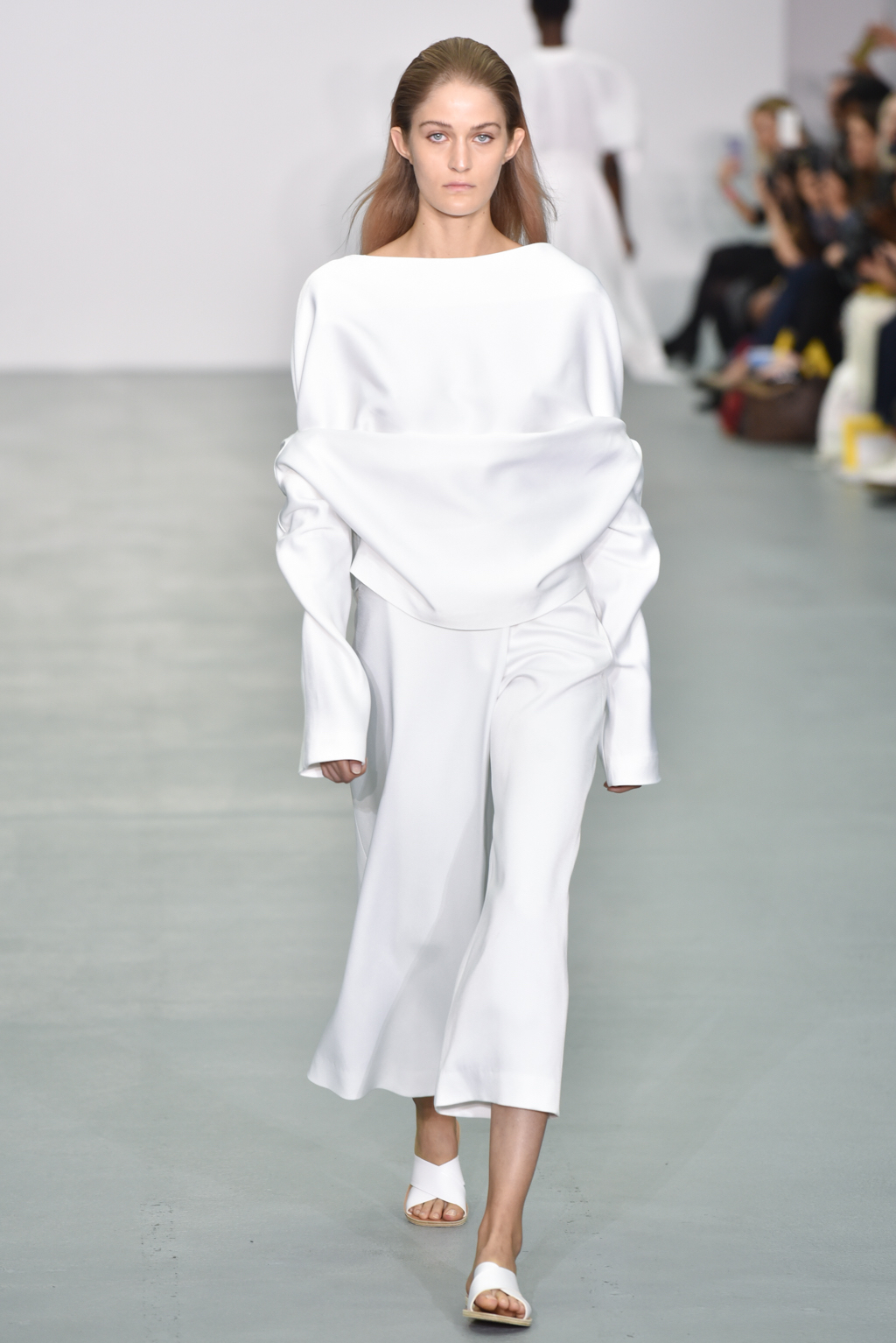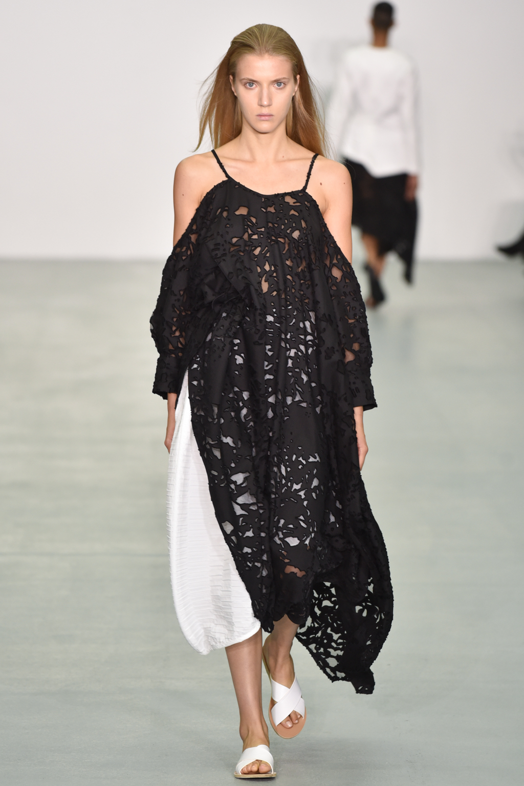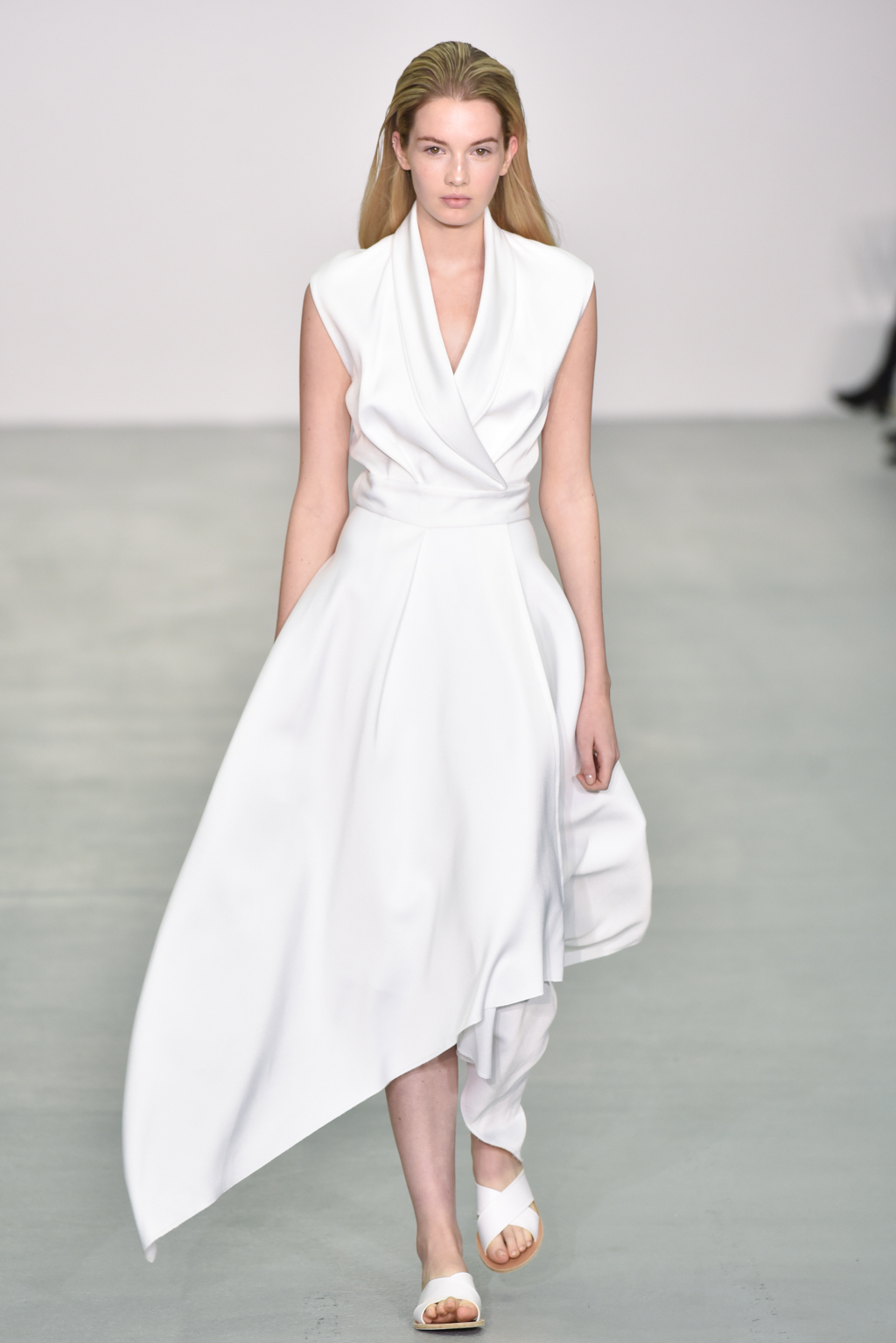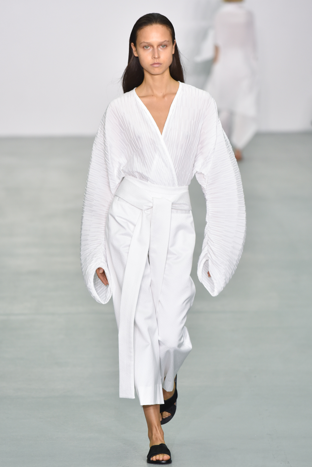 There were however a number of items that did meet the “less is more” criteria. One brilliant white dress with a round neck also included long, moderately flared sleeves; rather than incorporating anything additional, Neigum simply included a slit from the shoulder to the wrist, giving the dress yet more movement and a particularly fluid silhouette.