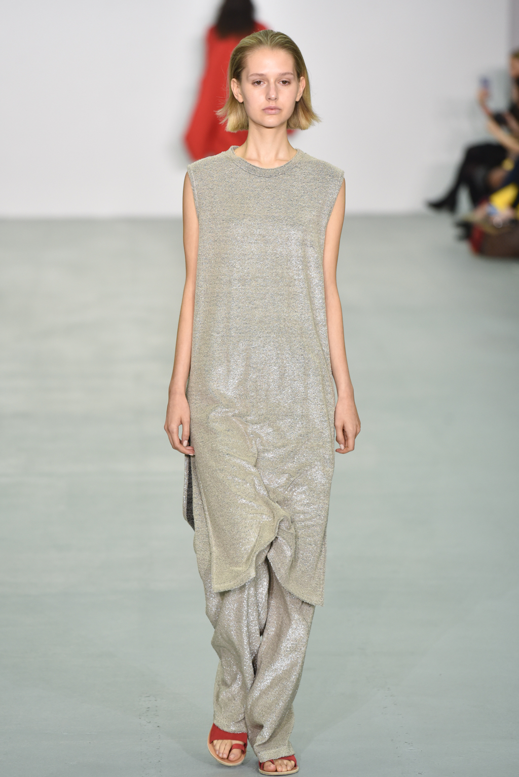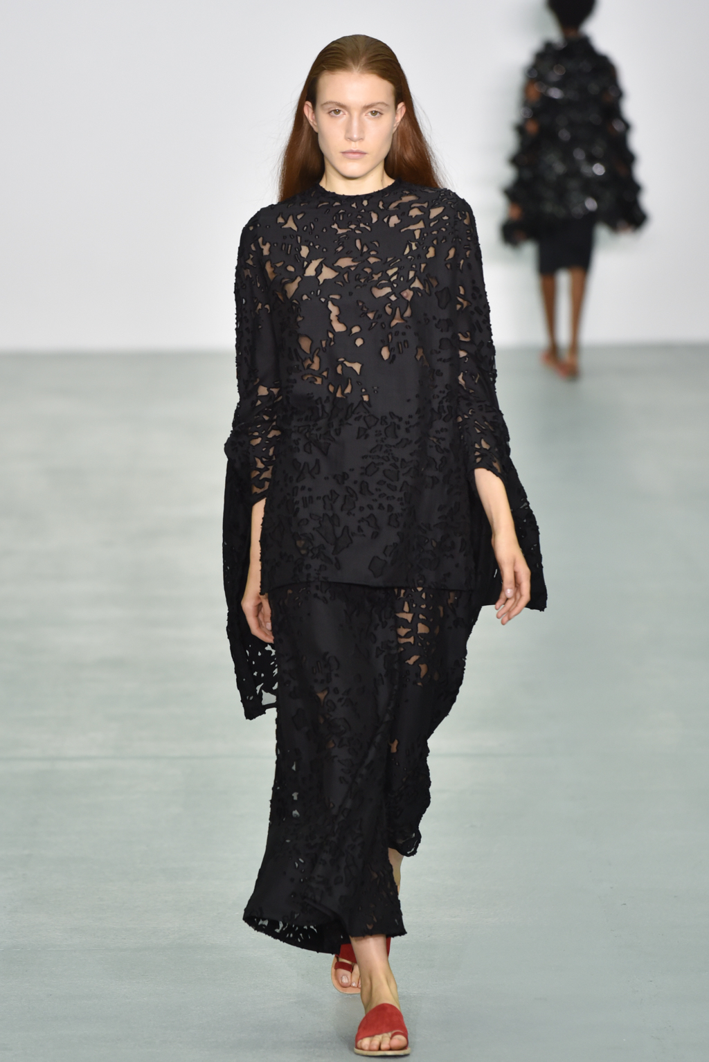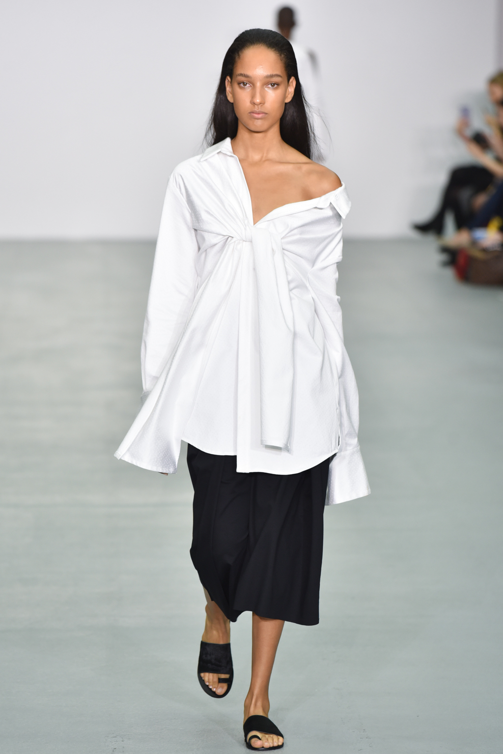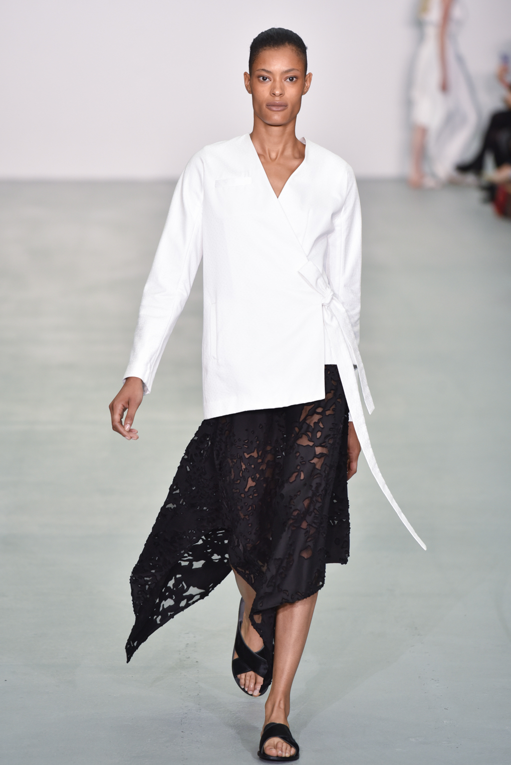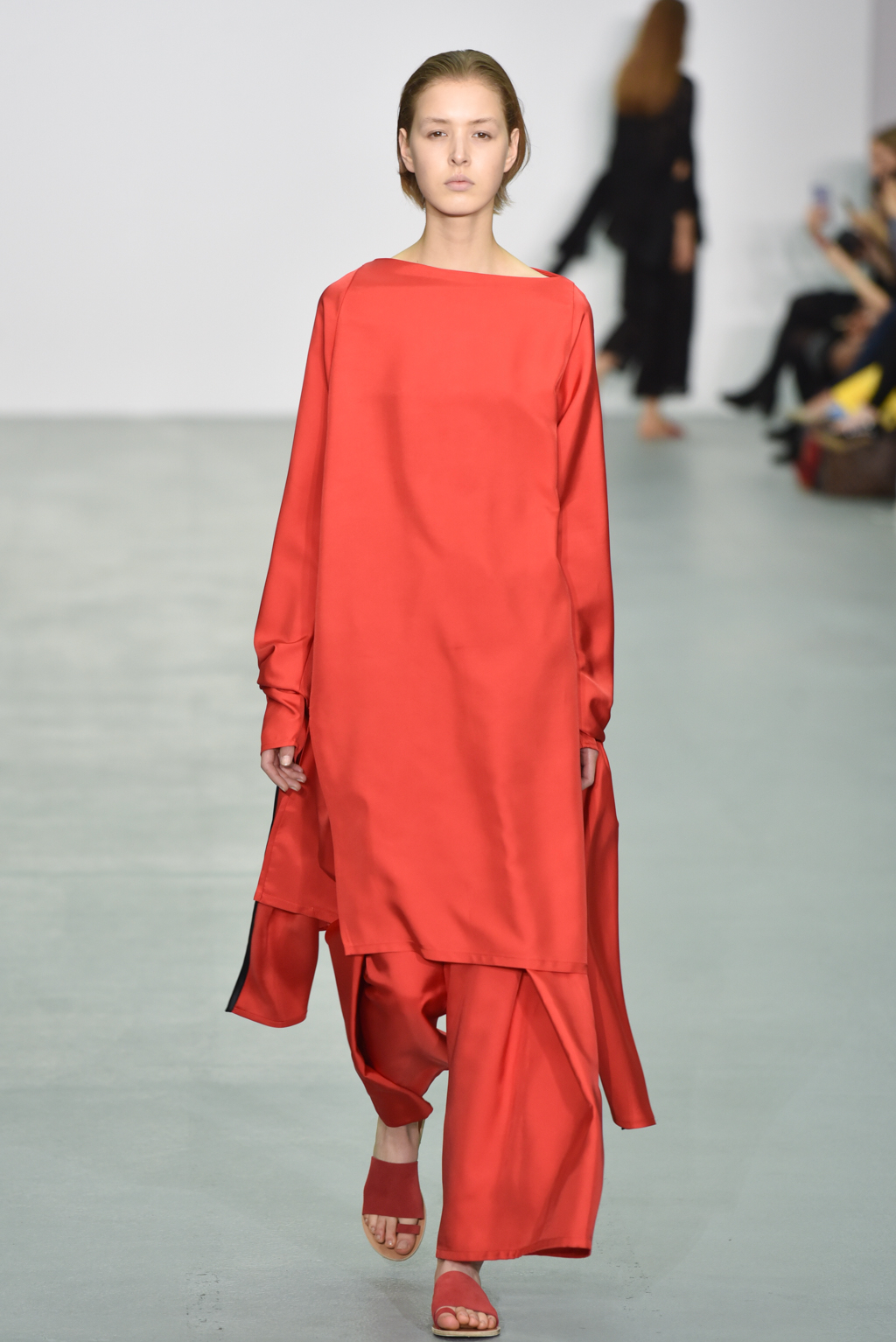 There were however a number of items that did meet the “less is more” criteria. One brilliant white dress with a round neck also included long, moderately flared sleeves; rather than incorporating anything additional, Neigum simply included a slit from the shoulder to the wrist, giving the dress yet more movement and a particularly fluid silhouette.