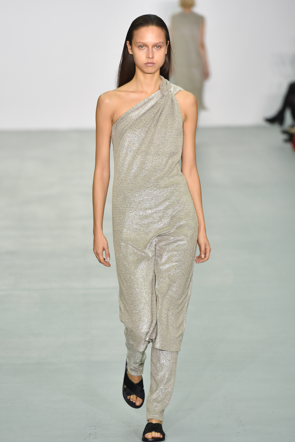 The real issue with the above statement came with Neigum’s patterns, which were beautiful and elegant but certainly not so minimal as to warrant the label “less”. Draping and fabric manipulation featured heavily in this collection and it certainly made an impact from the word go. The first look on the runway included semicircle shapes, about the size of a dinner plate, incorporated into the sleeves of a lightweight tunic top; the second included a jacket with overly long sleeves and draping across the elbow/waist plane that smacked of a straight jacket.