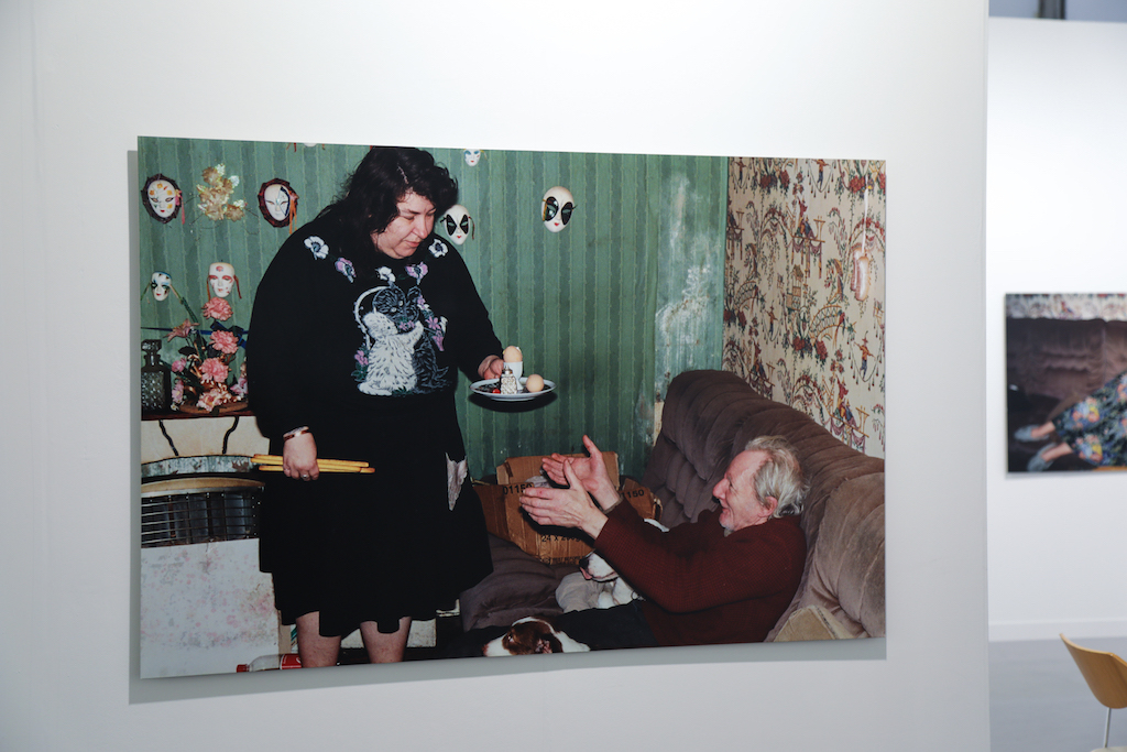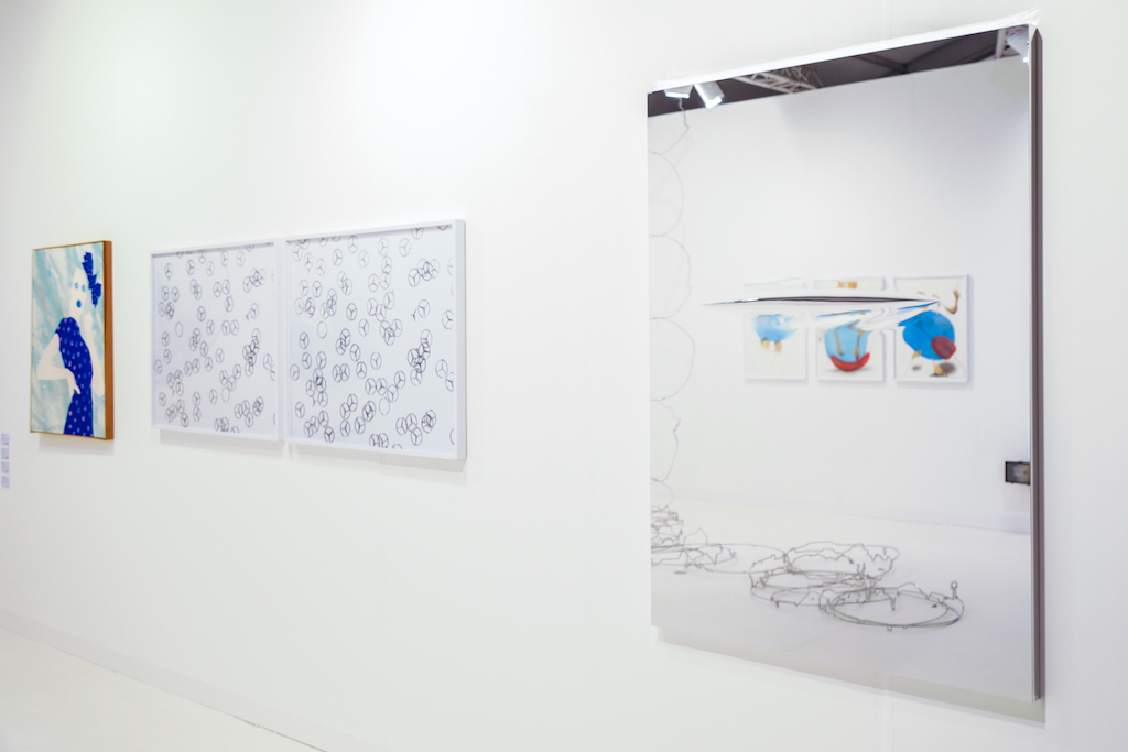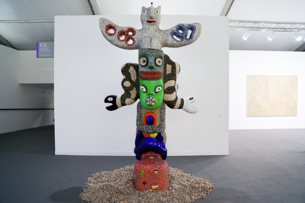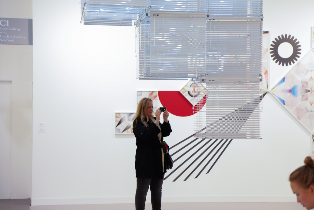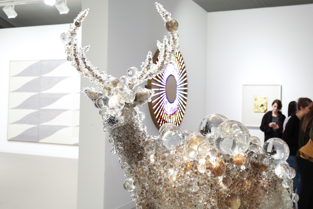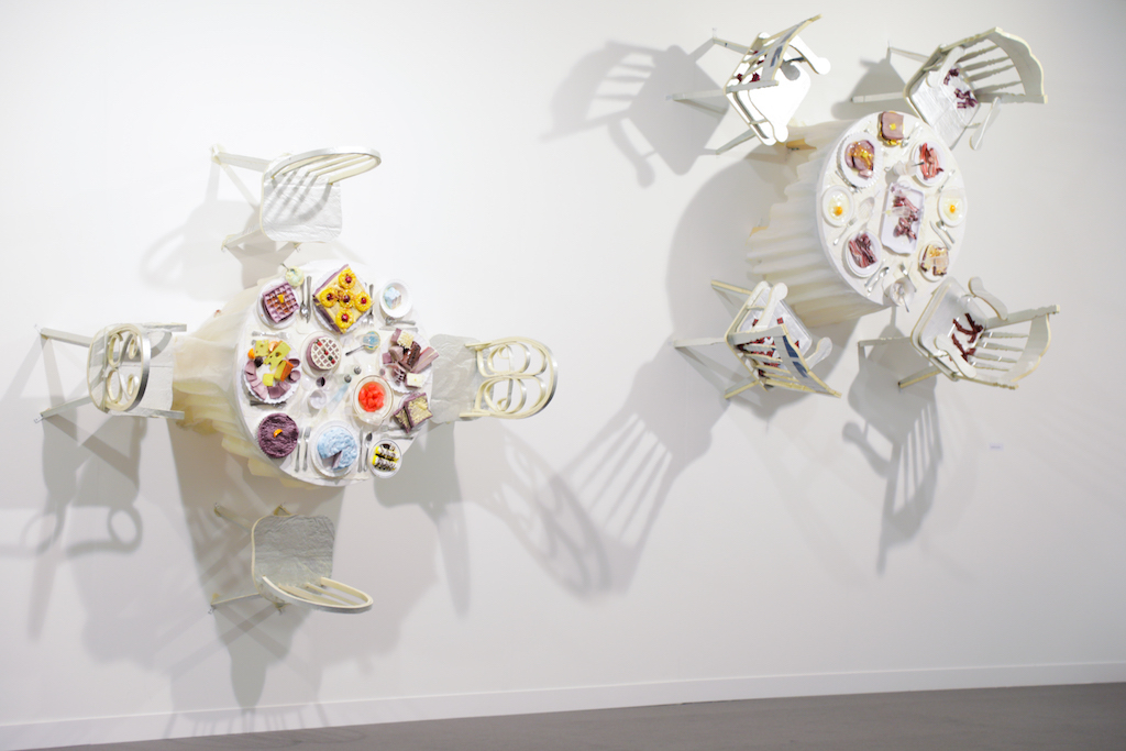 Highlights include the Marianne Boesky Gallery stand, which has been entirely taken over by Belgian artist Hans Op de Beeck. The room features bookcases, a painting and several sculptures of standing or reclining figures. Uniquely, however, everything has been painted a soft, dusty white. The effect is disconcerting, making the space feel both known and unknown, as figures in your peripheral vision appear to melt into the white background.