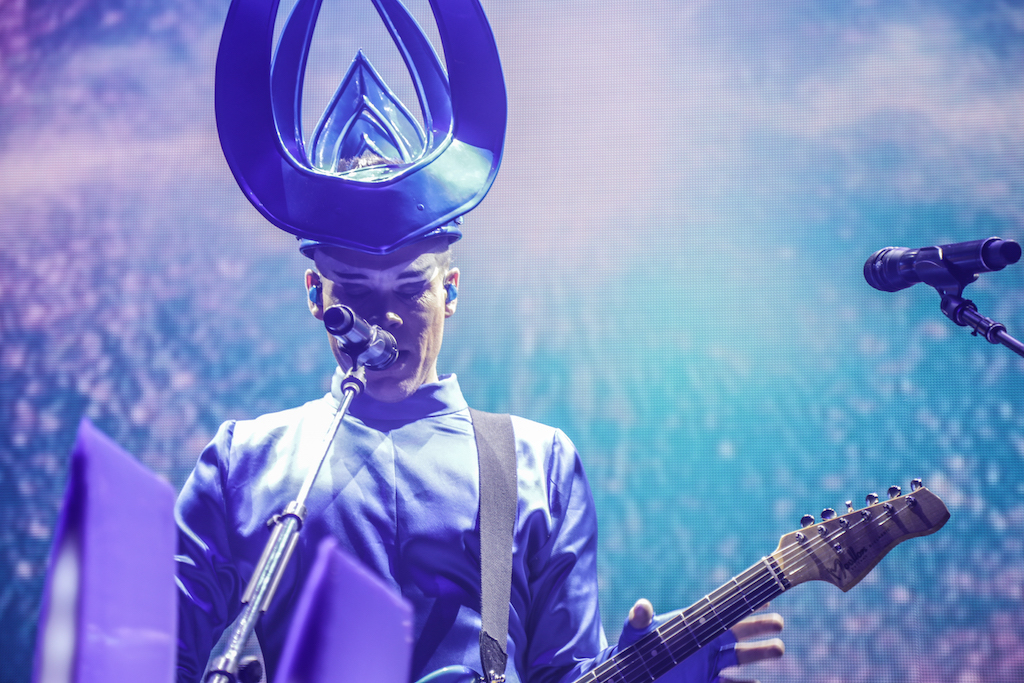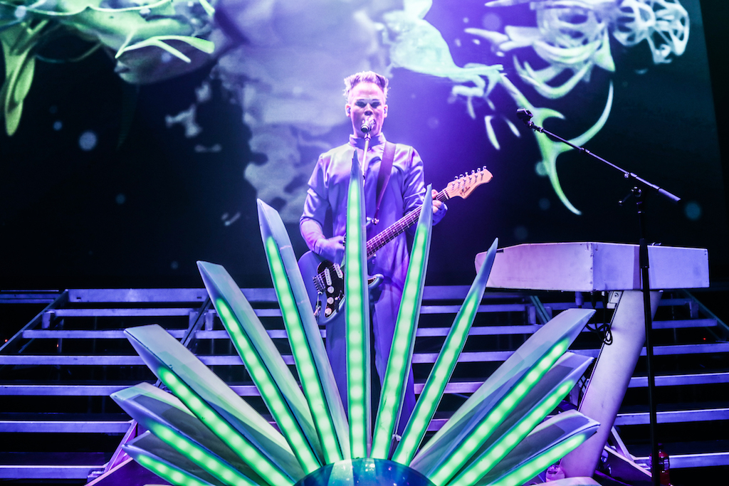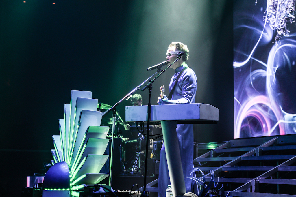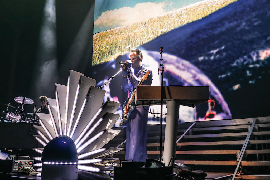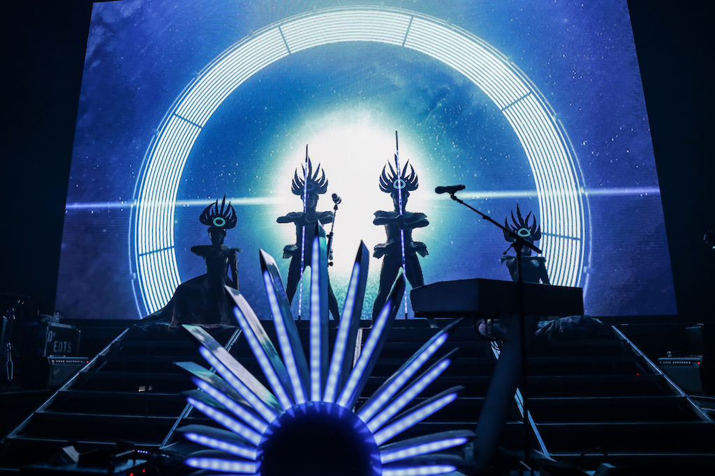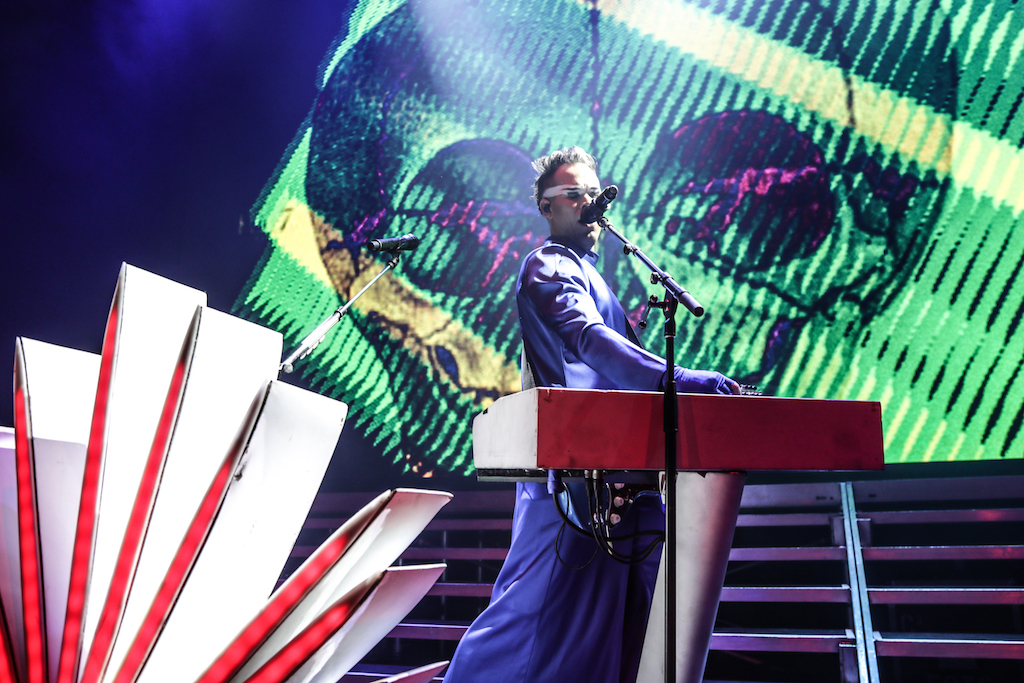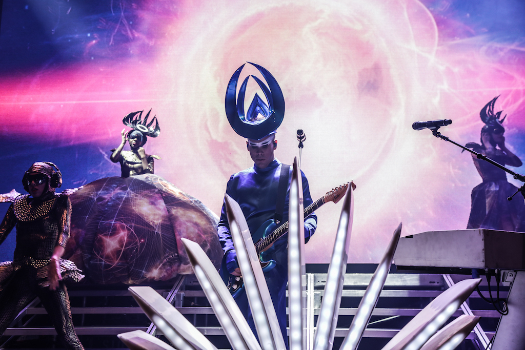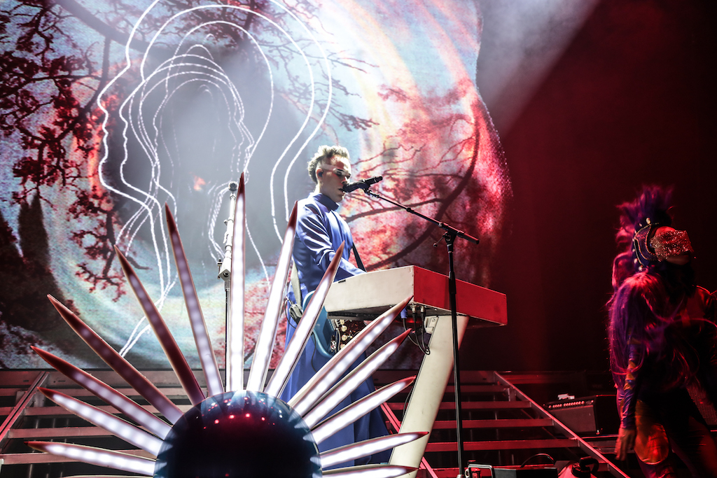 Empire of the Sun are all about their visuals, and this gig was no different. Steele, who is the live performer of the duo, comes out garbed in his illustrious album artwork headdress accompanied by four dancers, equally eccentrically attired in shiny gold intergalactic suits. Throughout the performance the dancers change into a variety of similarly stunning and bizarre costumes, their synced movements against a backdrop of swirling colours and pulsating tracks mesmerising the audience. It’s truly an acid trip like no other. For all the costume changes, stand outs have to be the all-white with papal hats, neon-lit guitar props and the translucent winged suits twirling to the flaring guitar notes.
