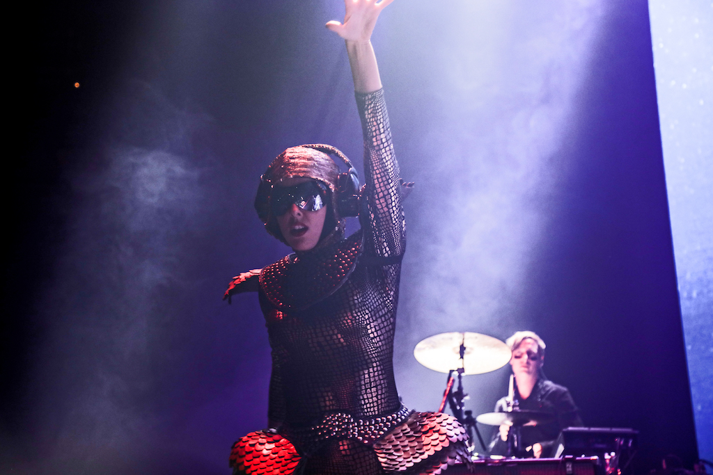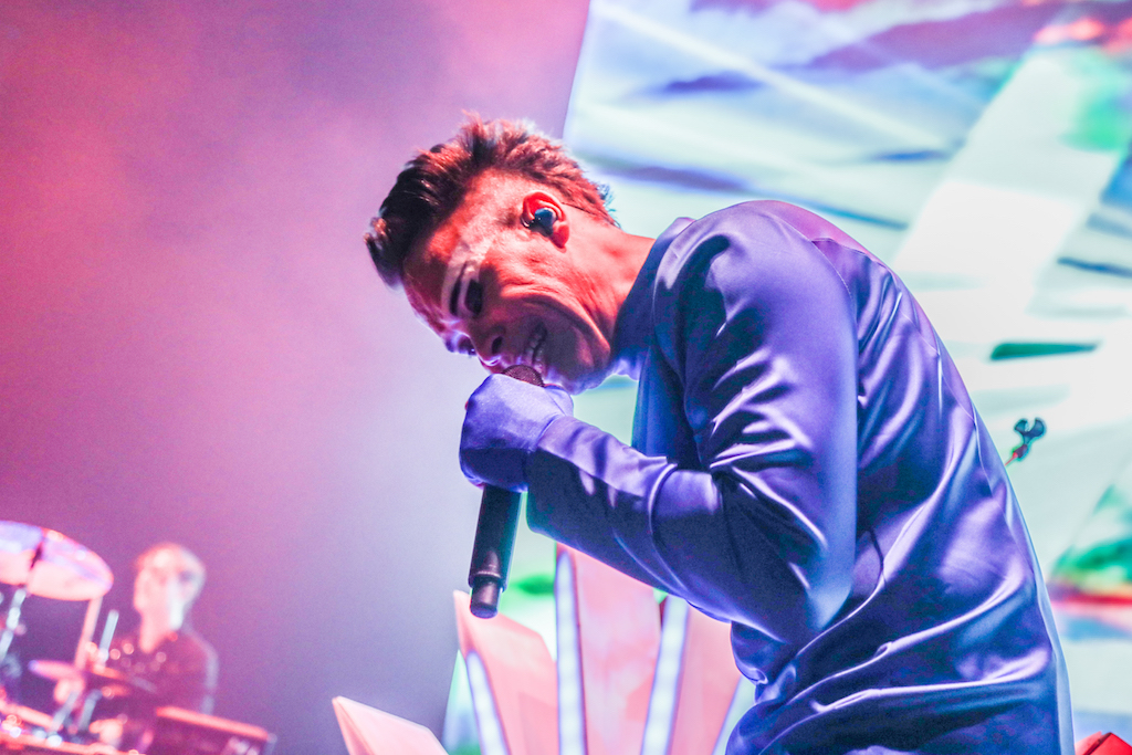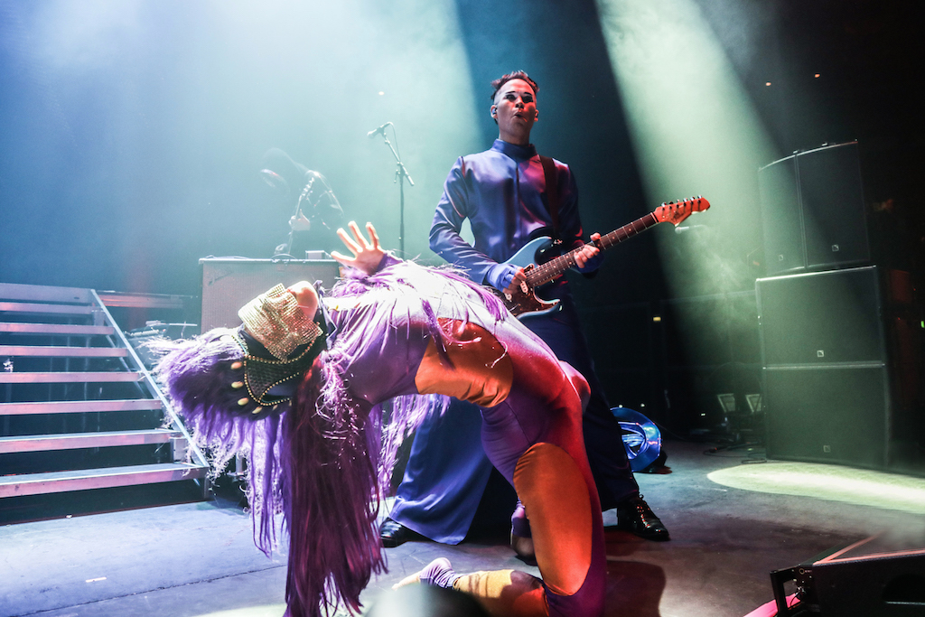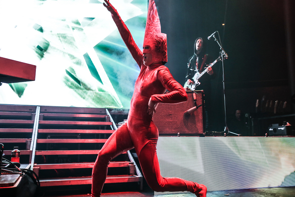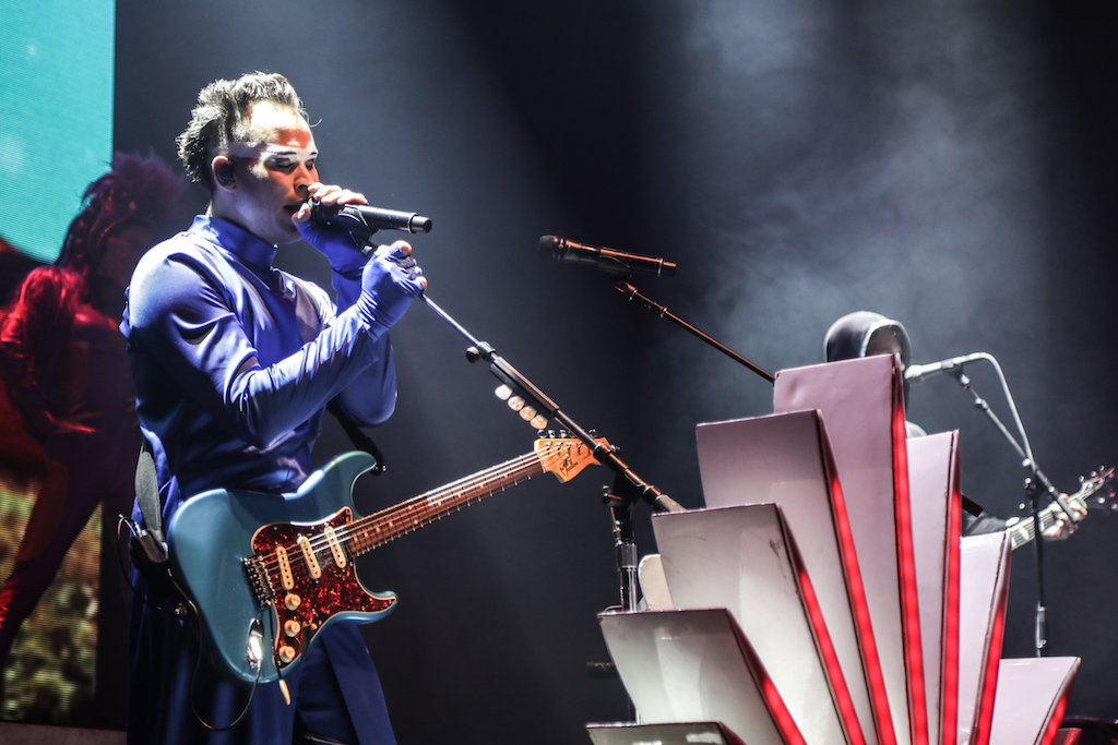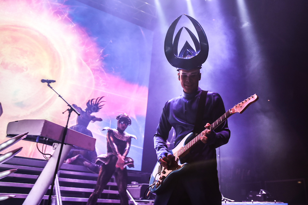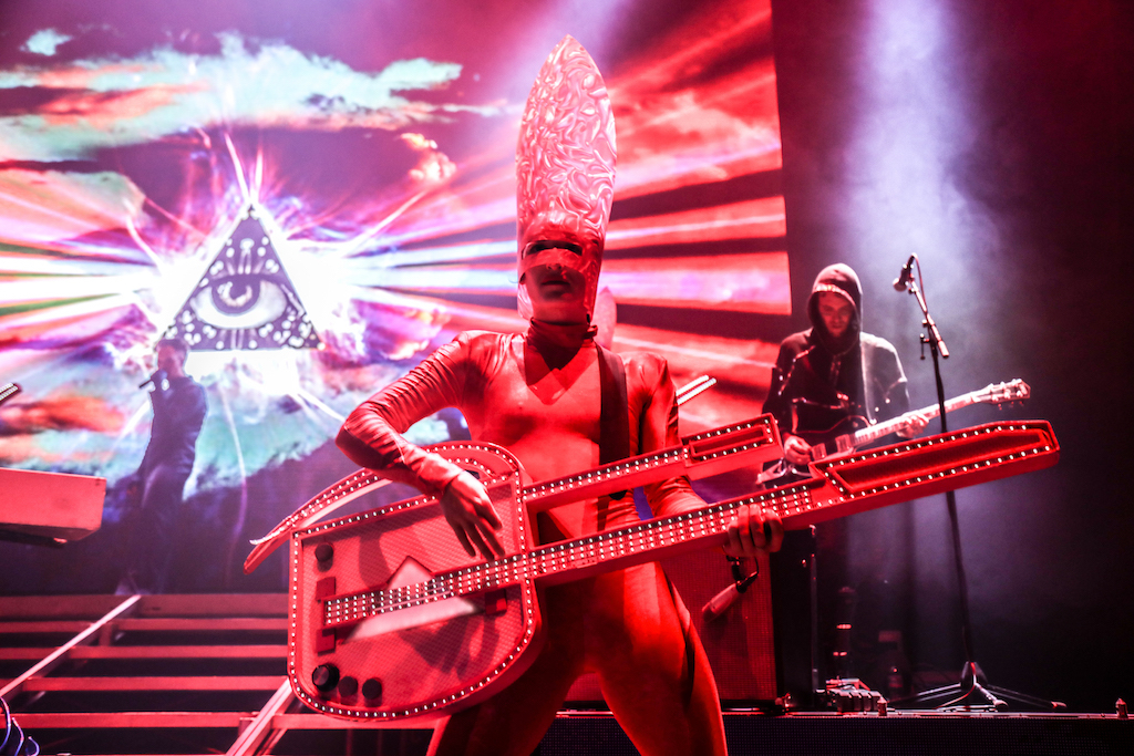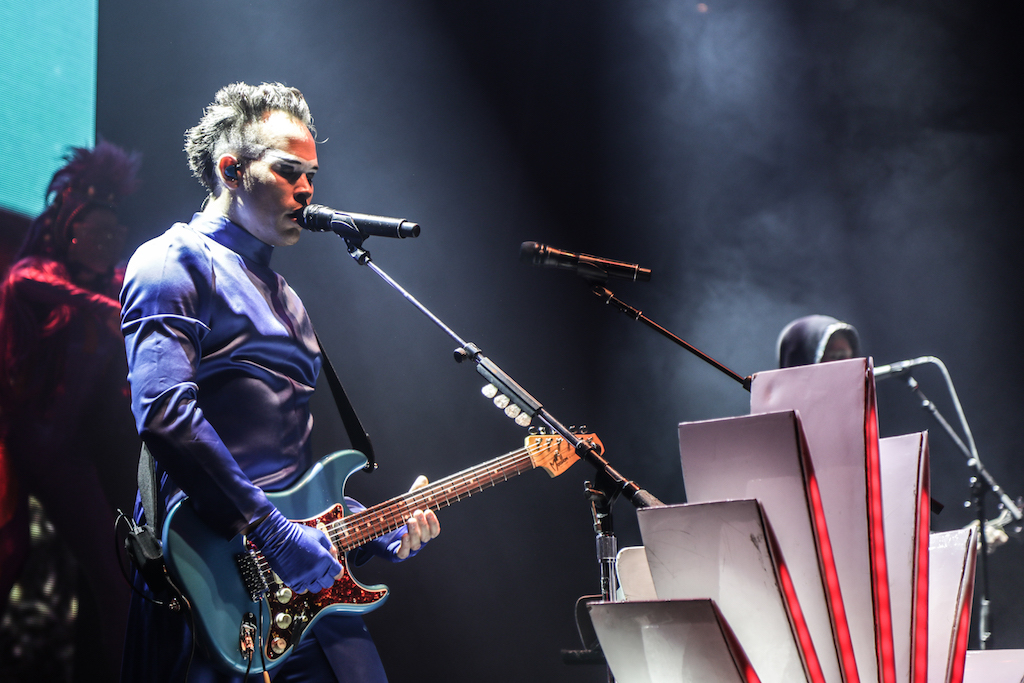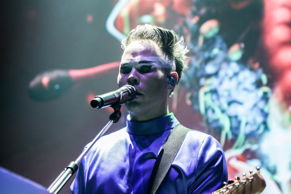 Empire of the Sun are all about their visuals, and this gig was no different. Steele, who is the live performer of the duo, comes out garbed in his illustrious album artwork headdress accompanied by four dancers, equally eccentrically attired in shiny gold intergalactic suits. Throughout the performance the dancers change into a variety of similarly stunning and bizarre costumes, their synced movements against a backdrop of swirling colours and pulsating tracks mesmerising the audience. It’s truly an acid trip like no other. For all the costume changes, stand outs have to be the all-white with papal hats, neon-lit guitar props and the translucent winged suits twirling to the flaring guitar notes.