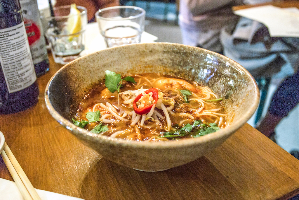 Moments from Shoreditch High Street station, Mama Lan is well located, if a little difficult to find at first. The small restaurant is tucked away in the corner of one of the many generic new-build apartment blocks in East London. Once inside, however, guests will find a remedy to the soullessness of the exterior; the space has plenty of character, with a stylish yet homely feel.