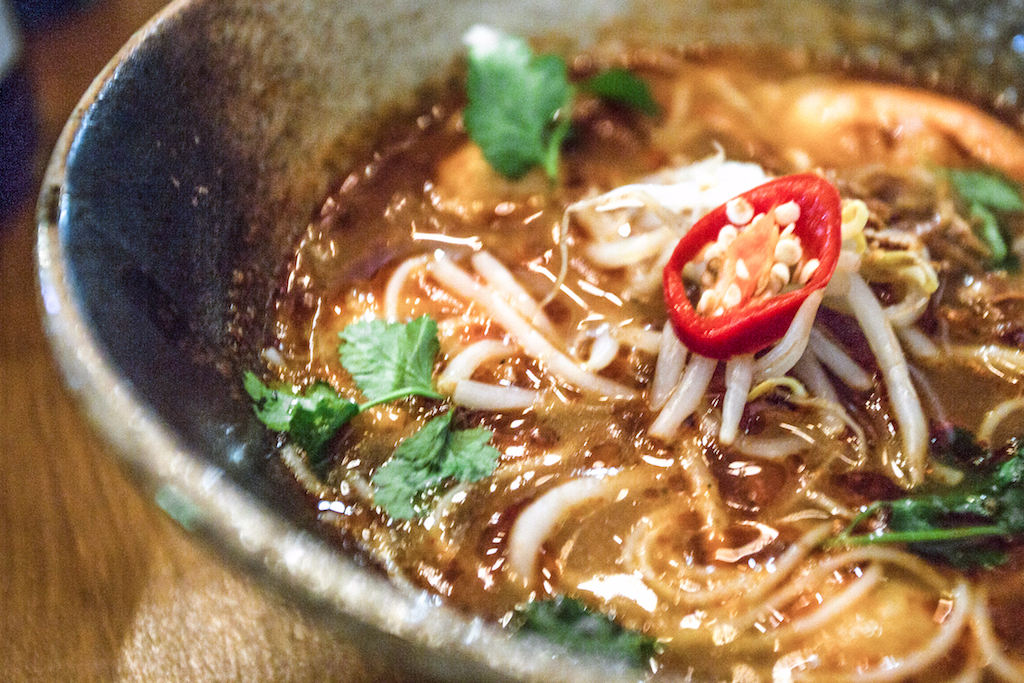 The small bowl of seaweed is a delightfully simple snack, squidgy with a slight crunch, and is a great accompaniment for the spicy chicken wings, which were a particular favourite. Encased in a layer of seasoning, the wings pack the punch of something that’s just the right amount of spicy.