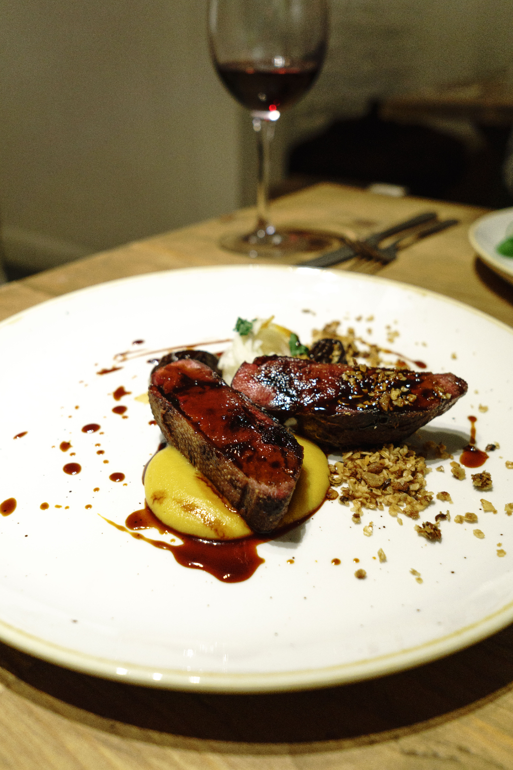 Its counterpart for the evening, the Wild Mallard is a greater success. Cooked pink and coated in a sticky glaze that has hints of aniseed flavour, it is well considered and texturally pleasing, with bite achieved from the roasted oatmeal crumb, and smoothness from its accompanying pumpkin purée.