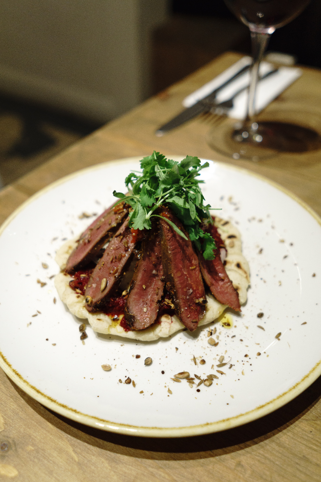 Wood Pigeon Kebab, a firm favourite on the Native menu, forms our second starter of the evening. Built up high on the plate, thin slithers of ultra tender, still-pink-in-the-middle pigeon are served with a pitta and a beetroot hummus. Aromatic hints of cumin are assertive in the dish, complementing the earthy, sweet flavour of the root vegetable, while pickled cabbage brings a welcome fresh and crunchy element. Despite the slightly tough bread, which overpowers the tenderness of the bird, the flavours are spot on, with a lovely connection between sweet and savoury.