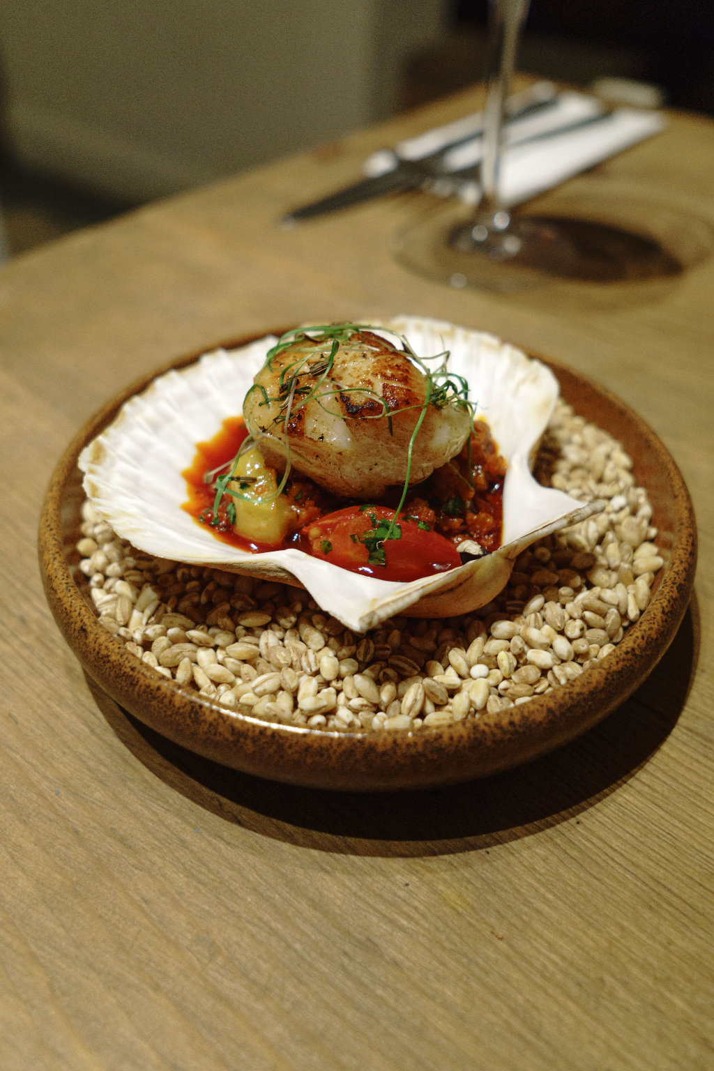 We begin the evening with a glass of Bolney Pinot Noir and our starters. Plated in its own shell, the Lyme Bay Scallop, Trealy Farm Sobrasada, IOW Tomatoes, Wild Fennel catches the eye instantly as a thing of humble beauty, with a plump, seared scallop sitting atop a gleaming red sobrasada and tomato sauce. The scallop itself is just cooked and satisfyingly soft to eat, with each mouthful coated in the tangy, cured sausage, which leaves behind a lingering warmth from its bold spices.