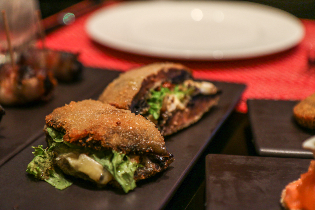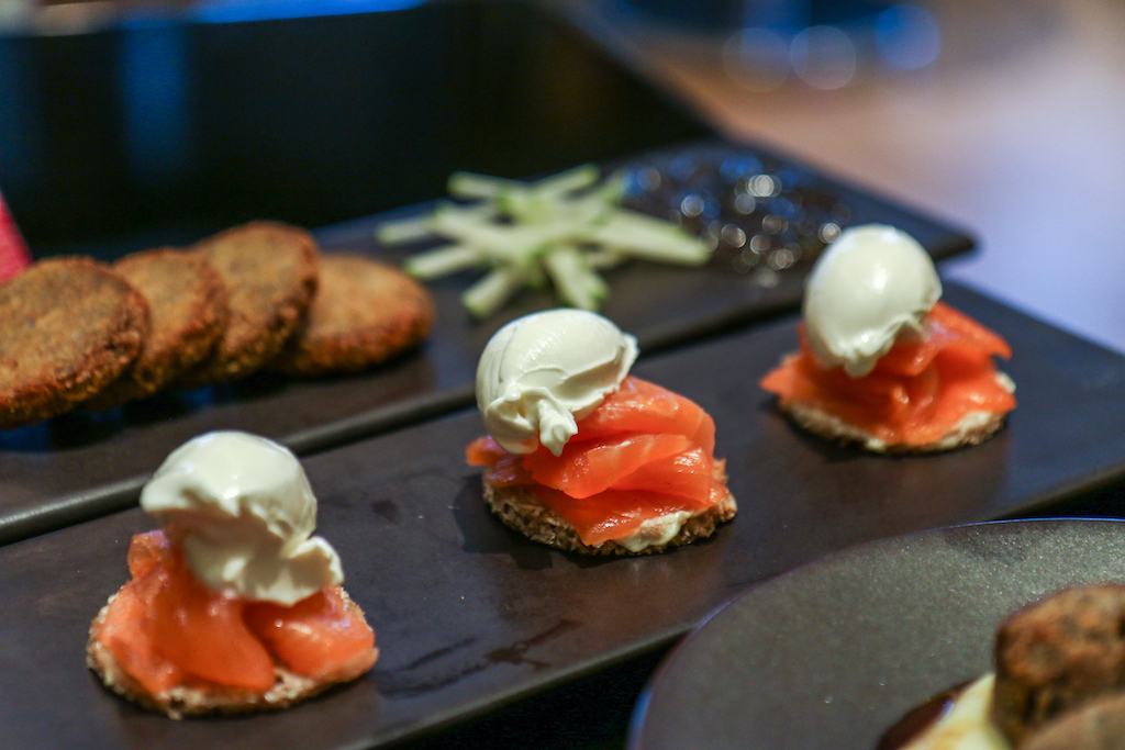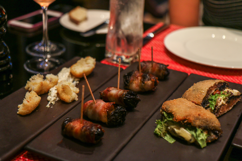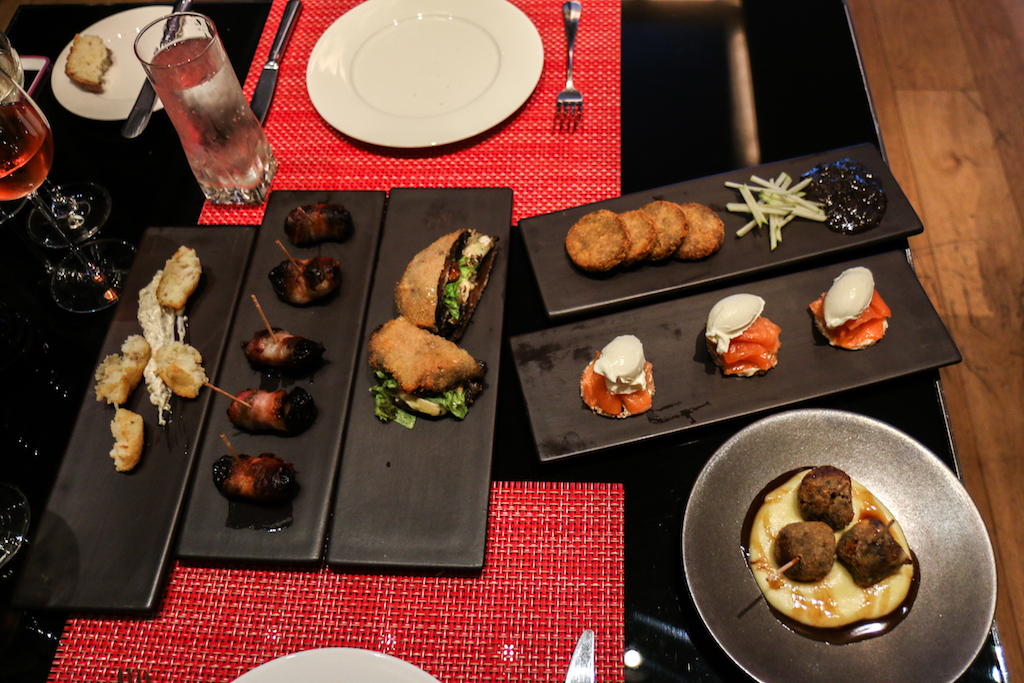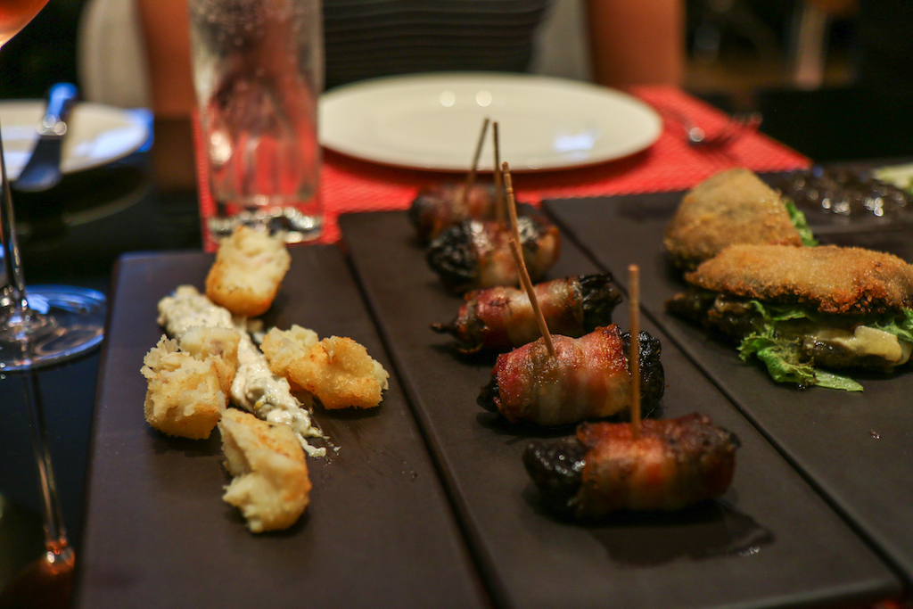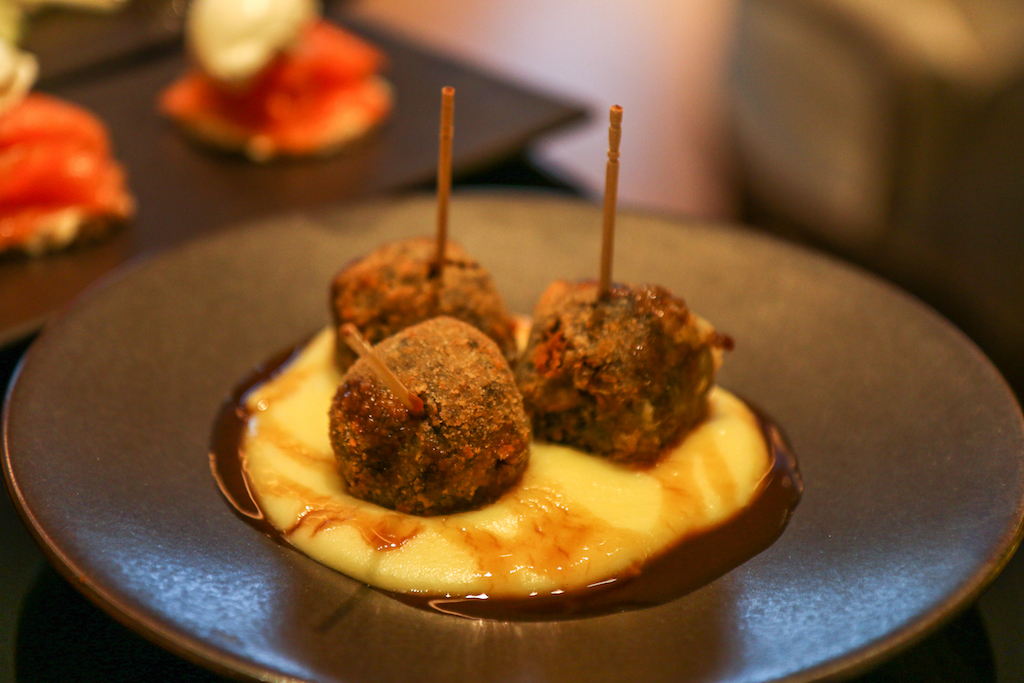 We begin with Prunes Stuffed with Apple Wrapped in Crispy Bacon, Smoked Haddock Fish Cakes and Tartare Sauce and Tunworth and Mushroom Slider with Walnuts and Truffle Dressing. There’s a clear standout dish in this first round, and it’s actually the one that on the paper doesn’t sound as nice as the others. The prunes stuffed with bacon are simply delicious; on the other hand the more common fish cakes are reassuring but the portion is a bit too small compared to the rest.