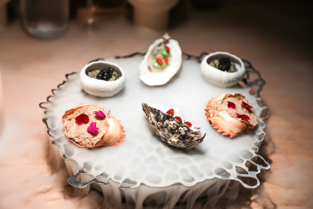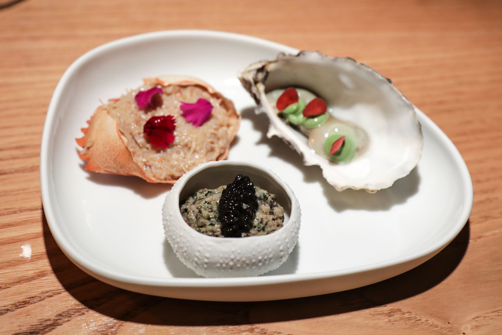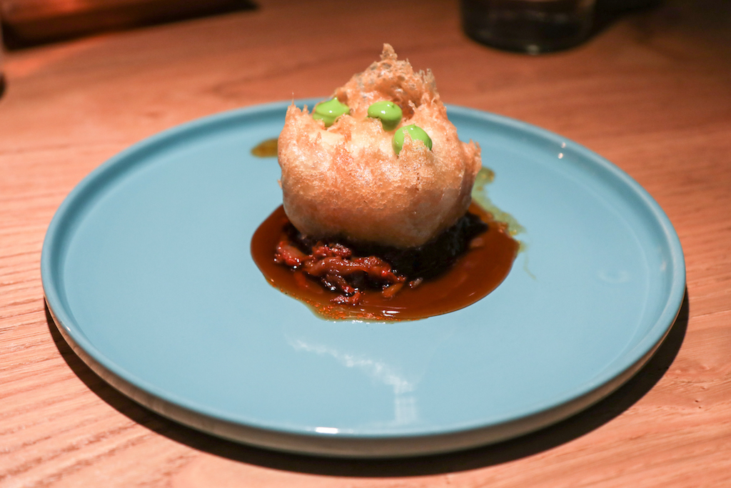 The dining area is beautiful and spacious – for once the tables are comfortable – matching the restaurant’s concept and food style. Tonight Atxa is in the kitchen, but when he is not around head chef Edurne Martín Delgado fills his shoes seamlessly having worked with him for 11 years. As a starter we have the most iconic dishes: Memories of the Bay of Biscay and Txerri Boda Pork Festival. The Fat Duck-style Memory dish is the best culinary spectacle you can get for £14. Water gets poured on dry ice and sea weed to recreate the smell of the sea in the smoke. Of the three seafood components – oyster, crab and prawn tartare – the oyster with apple blossom is spectacular.