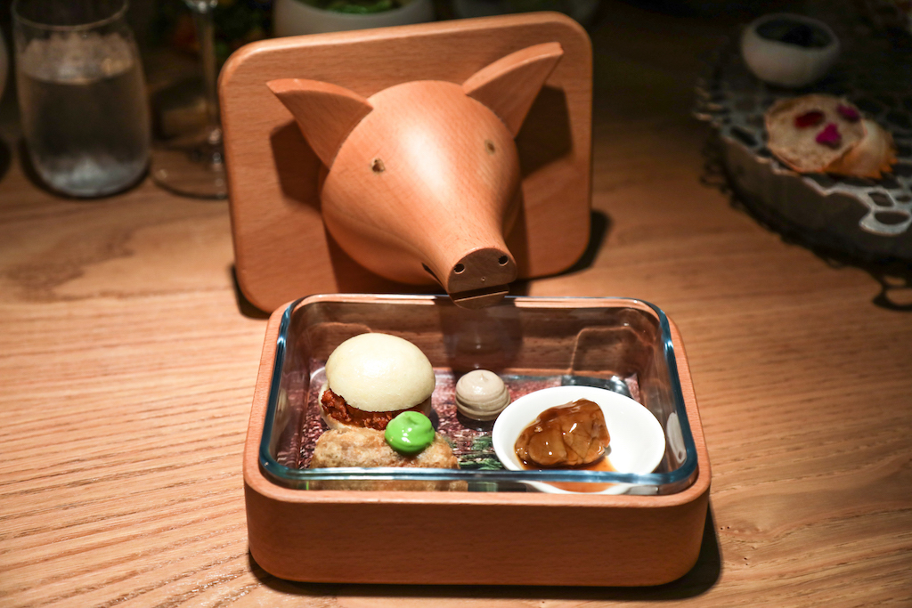 The Pork Festival, just like the other starter, features three different components too – chorizo on milk bread, glazed sweetbread, suckling pig tempura – and it comes in a box with a wooden pig face on it. As a main we try the Hake, another tempura dish. The batter is light and crisp but it lacks a bit of punchiness; however, the delicious red pepper sauce it sits on makes up for that shortfall. The seared duck breast, another talked-about dish, is generous in quantity; it’s served with a fine julienne of king oyster mushrooms. It’s so fine that, without knowing, it would be practically impossible to guess they are mushrooms (similar to the mushroom spaghetti recipe Albert Adrià shared with us last January).
