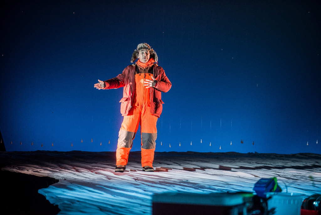 Claire van Kampen’s bold direction and Todd Rosenthal’s set make Nice Fish an eye-widening spectacle. The action happens on an expansive sheet of ice against an ever-changing sky. In order to give a sense of perspective, the horizon is populated with tiny trees and the occasional miniscule passing train. A detailed puppet takes the place of a character who has travelled into the far background.