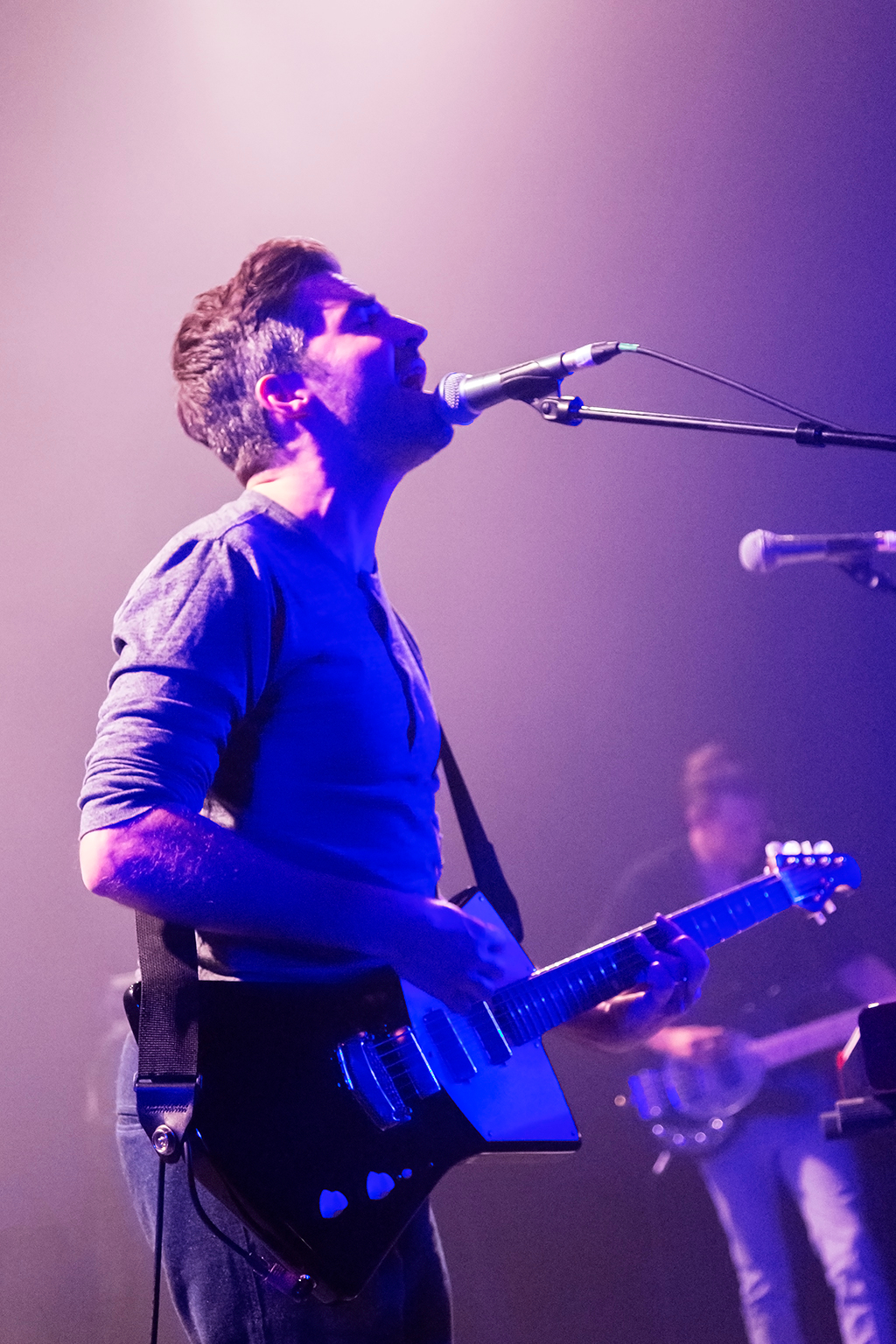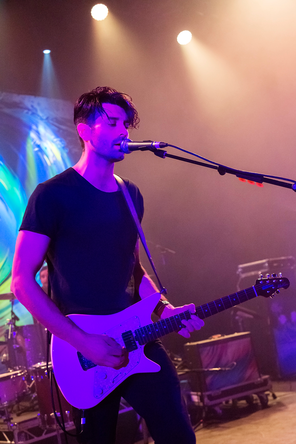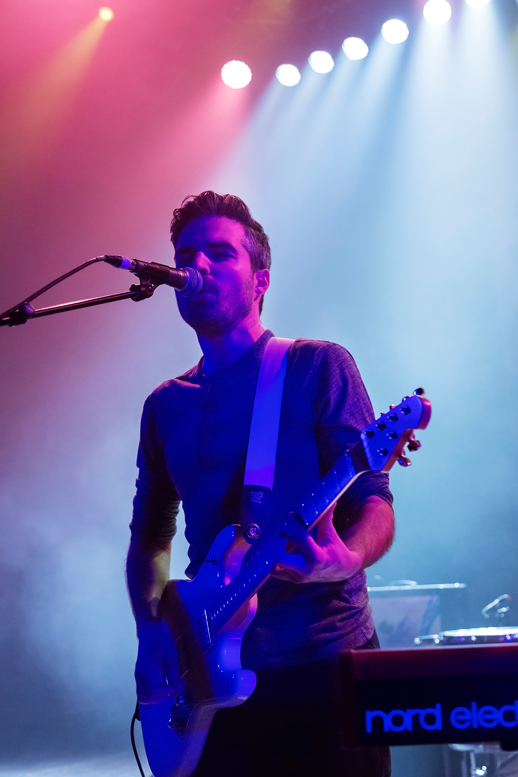 Appropriately for a band that’s seeped into the public consciousness more through their inclusion on movie, TV, and video game soundtracks than breakthrough chart success, opening numbers Let It Go and Big Ideas combine to establish an atmospheric mood that remains in place throughout the 90-minute set. With the influence of more famous noughties indie acts such as Coldplay and Biffy Clyro immediately apparent in the woozy waves of echoing melodies and sweetly pealing harmonic guitar that singer Nathan Nicholson’s falsetto soars over, there’s a comfortable familiarity to The Boxer Rebellion’s sound. This accessibility does perhaps come at the expense of much in the way of sonic variety. The unilateral MOR tone seems to keep the not-quite-sell-out crowd in a quietly contemplative state for a while before they fully warm up.