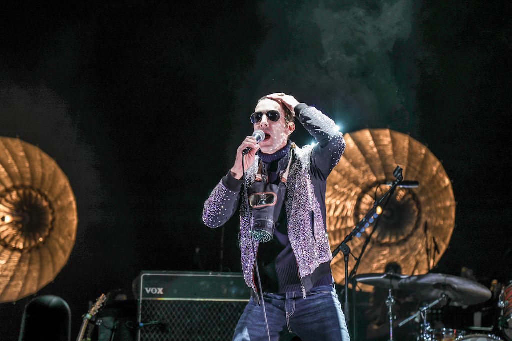 His flamboyant personality comes out right away as he enters the stage with an all-glittery jacket and his 2016 signature gas mask. He then puts on a red leather jacket before taking his acoustic guitar and launching into a fantastic rendition of Sonnet. The bang continues with This Is How It Feels, one of his best recent songs and yet another manifesto of his character.