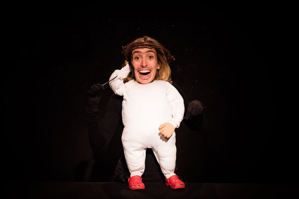 Holy Presents is that special happening: a simple idea, well executed to great effect. Here, each member of the Holy Trinity is a humanette – a human head with a puppet body. The show’s three performers adroitly create a host of detailed and endearing caricatures thanks to larger-than-life facial expression and loving manipulation of their stuffed Babygro bodies and foam hands. The props and set are suitably adorable: a tiny kitchen worktop, toilet, and sofas as well as doll-sized Croc sandals. It’s a high-energy and superbly funny romp throughout which the actors look like they’re having as much fun as their audience.