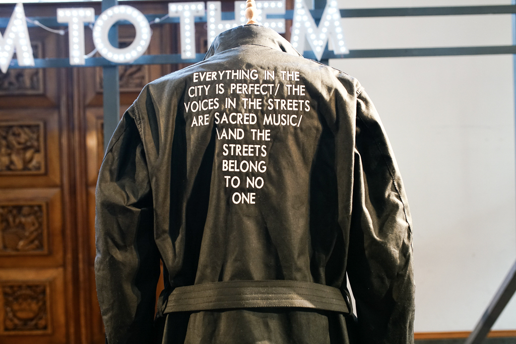 The focal point of the display was a collection of their iconic A7 International jackets, customised in collaboration with Scottish artist Robert Montgomery. Quotes from his poems, such as, “The fields must have dreamed the roads from the wind in their grass,” was written across the back of six of the jackets in luminous thread, all hung against a backdrop of one of Montgomery’s light sculptures. The one-off pieces, available exclusively to Selfridges customers, aimed to capture what the retailer called “the free spirit and essence of the brand.”