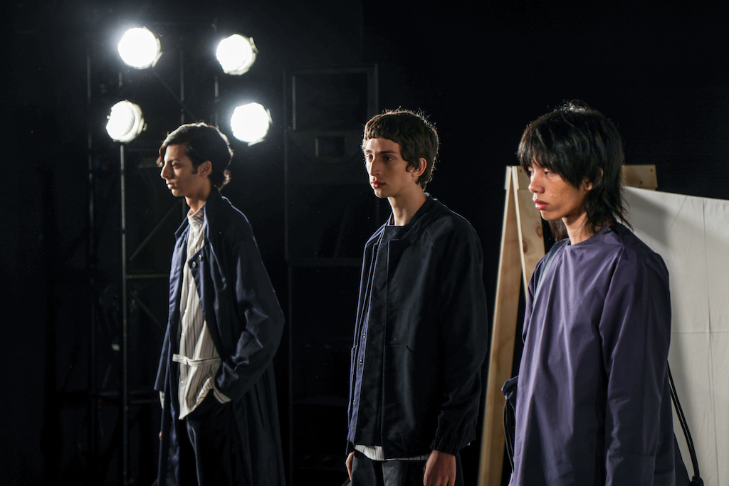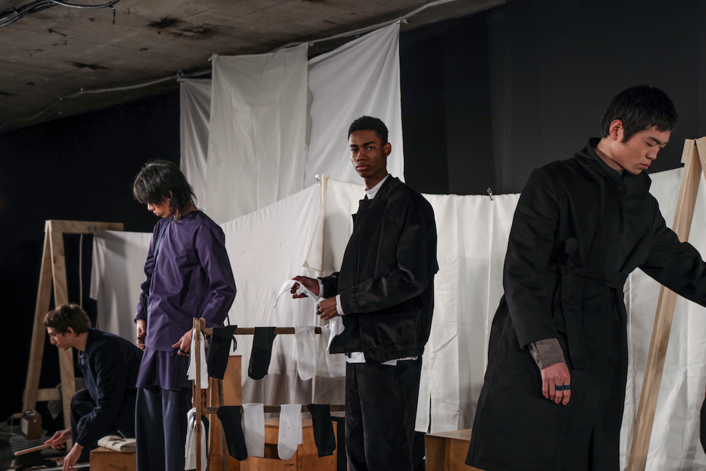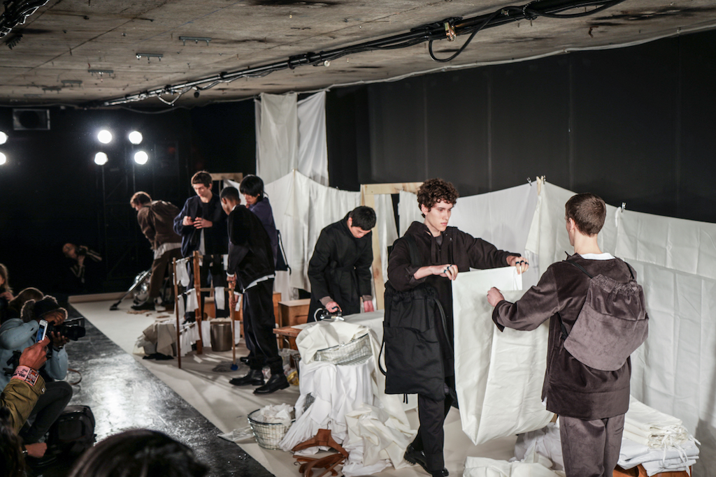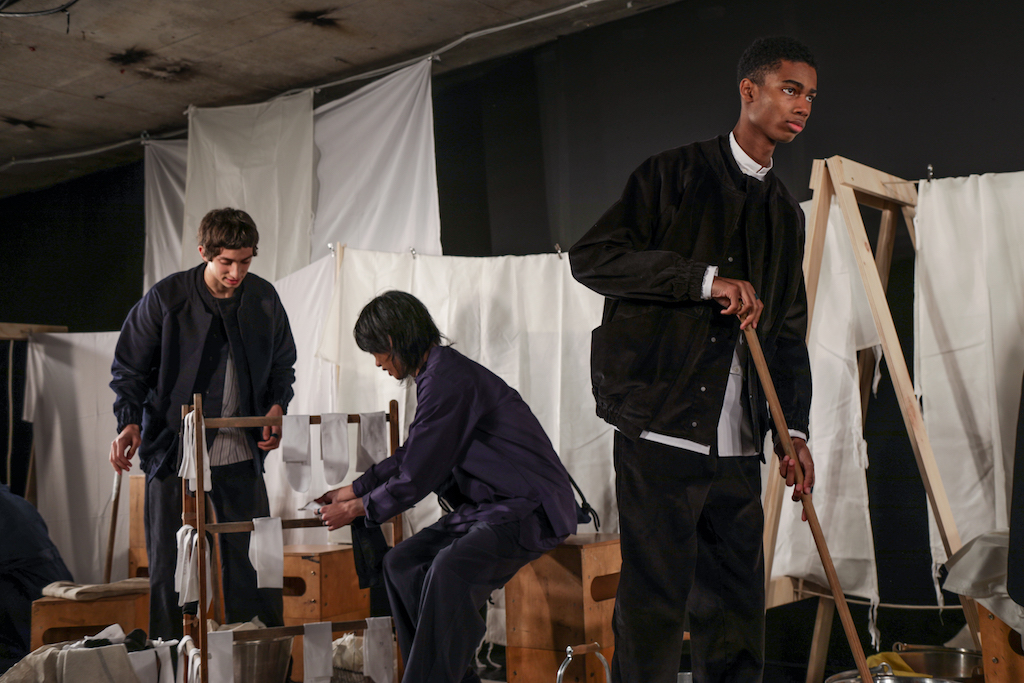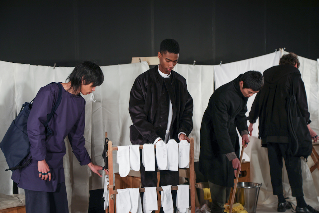 The expressionless men going through the repetitive motions of sweeping pegs, ironing and folding white sheets, and hanging socks in endless rotation to a trip-hop beat, brought a comic but surreal reality to the presentation. The deadpan performance, though, set off perfectly the down-to-earth collection they modelled.