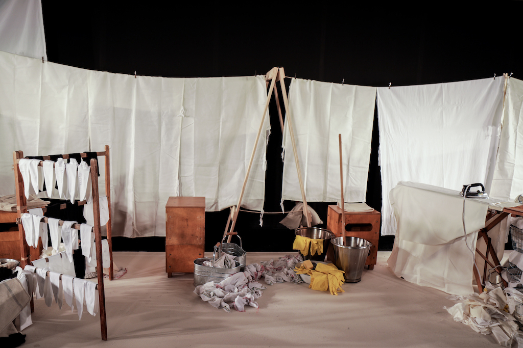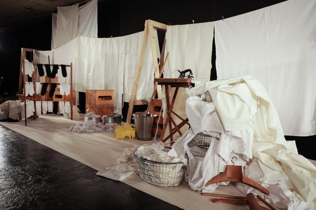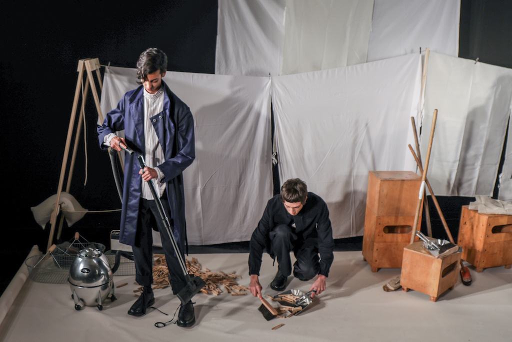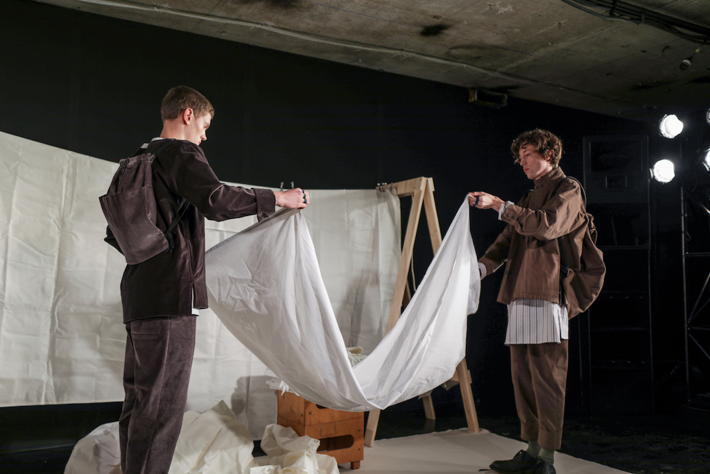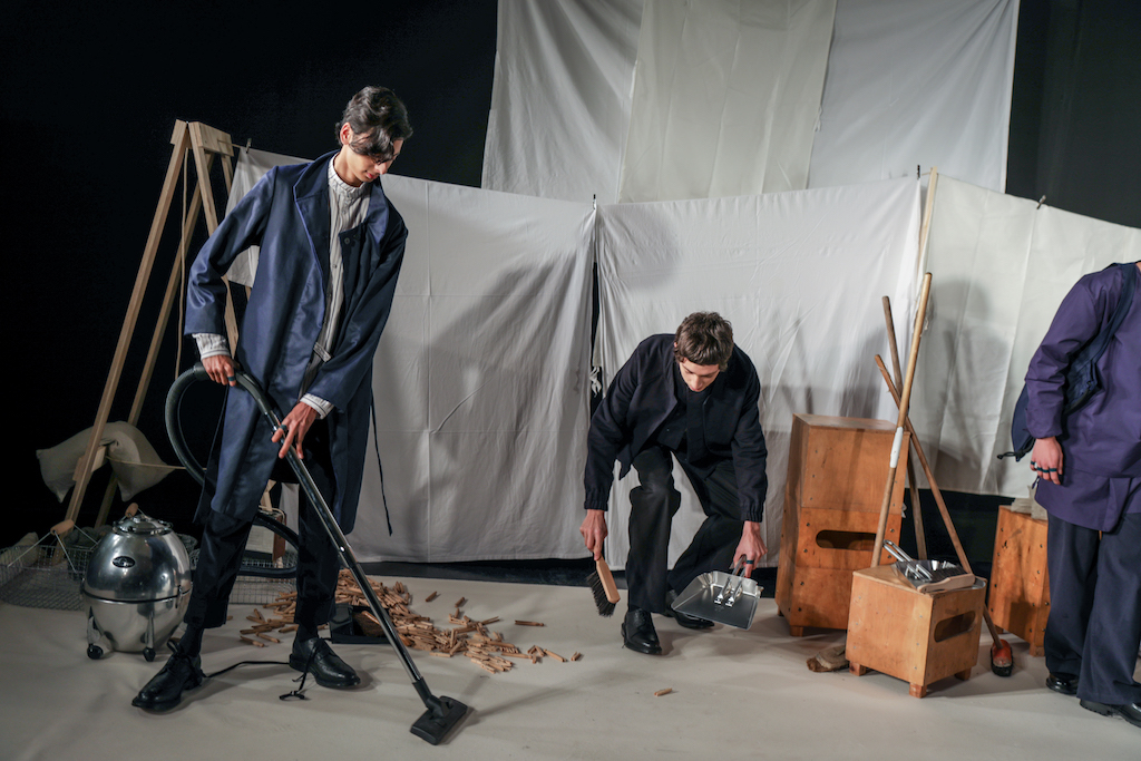 The expressionless men going through the repetitive motions of sweeping pegs, ironing and folding white sheets, and hanging socks in endless rotation to a trip-hop beat, brought a comic but surreal reality to the presentation. The deadpan performance, though, set off perfectly the down-to-earth collection they modelled.