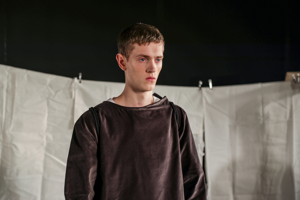 Phoebe English unveiled their menswear autumn/winter collection at the BFC Presentation Space for London Fashion Week Men’s. Making quite the visual spectacle with eight male models all out on domestic chores, the collection’s focus was clearly on practicality above overstatement; however, as result it produced an extremely wearable and durable set of separates.