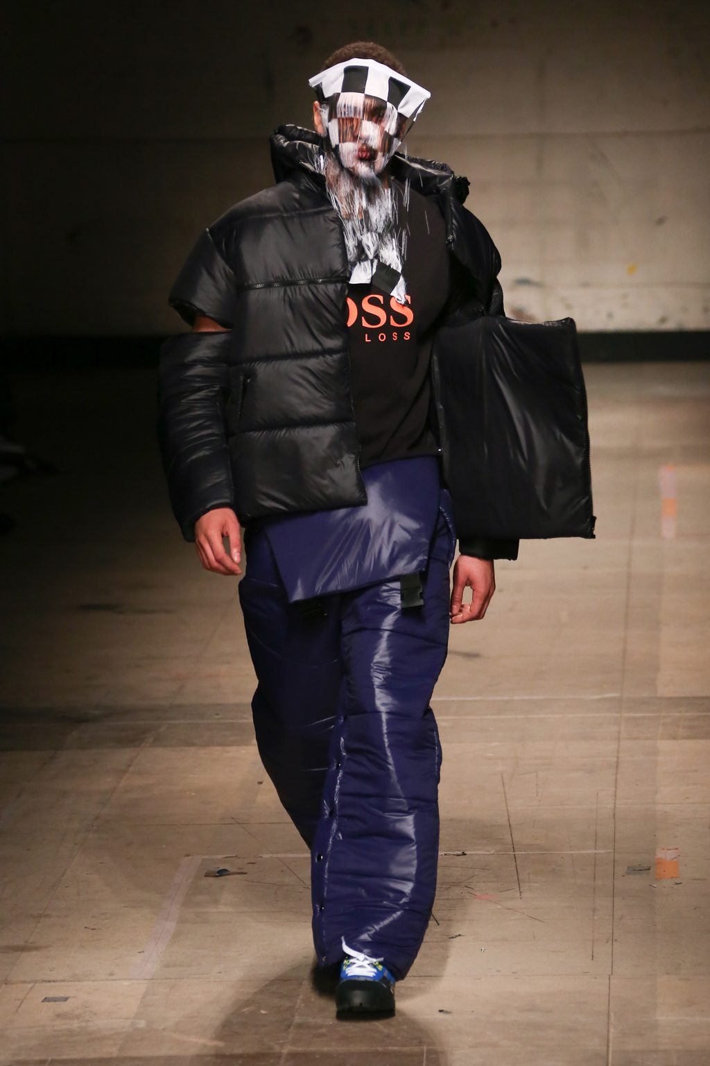 Text and brand adorned jumpers, joggers and quilted trousers and jackets brought a contemporary twist to classic British street style. Trailing torn fabrics, loose straps and punky safety-pin fastenings ensured a messy, rebellious aesthetic, posing a retort to the sleek traditional tailoring that dominates menswear design.