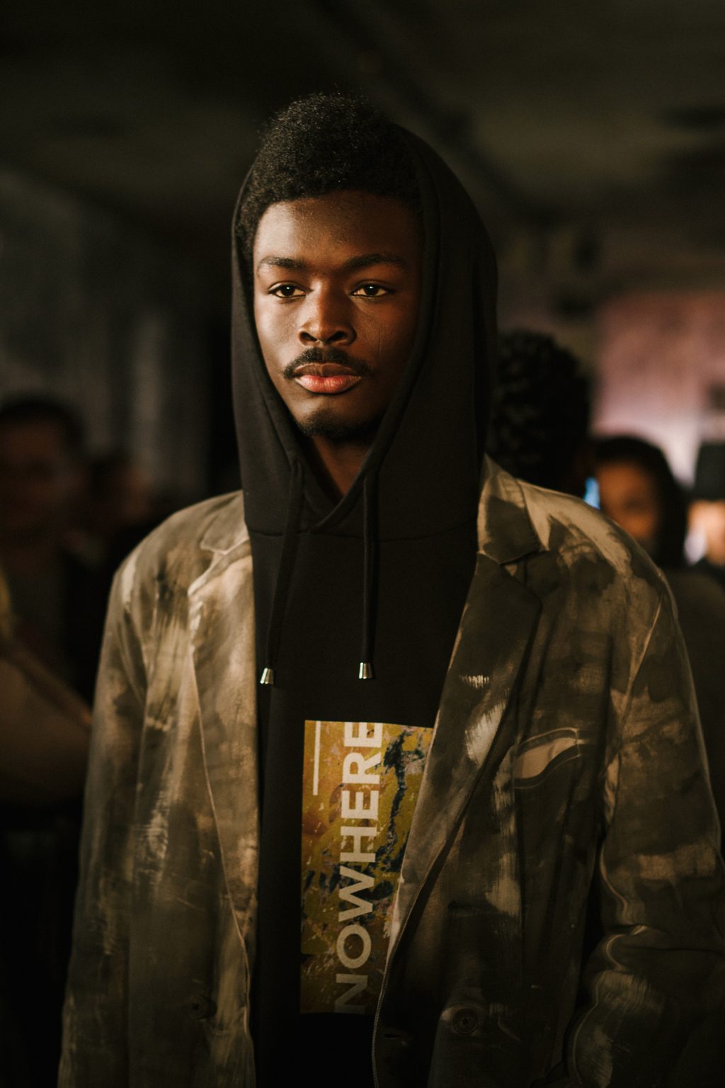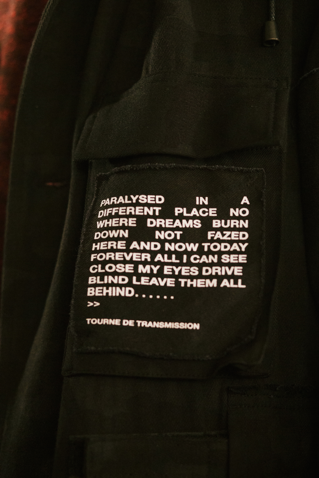This approach of combining and reacting to words and ingraining a form of social consciousness in his work characterises his idiosyncratic approach. The brand name Tourne de Transmission itself (literally translating as “rotating transmission”) aims to analogise a process of combining word and image to create a message. The presentation of the collection encapsulated this with rows of models displaying his separates against a light installation illuminating text around the concept of “nowhere”.