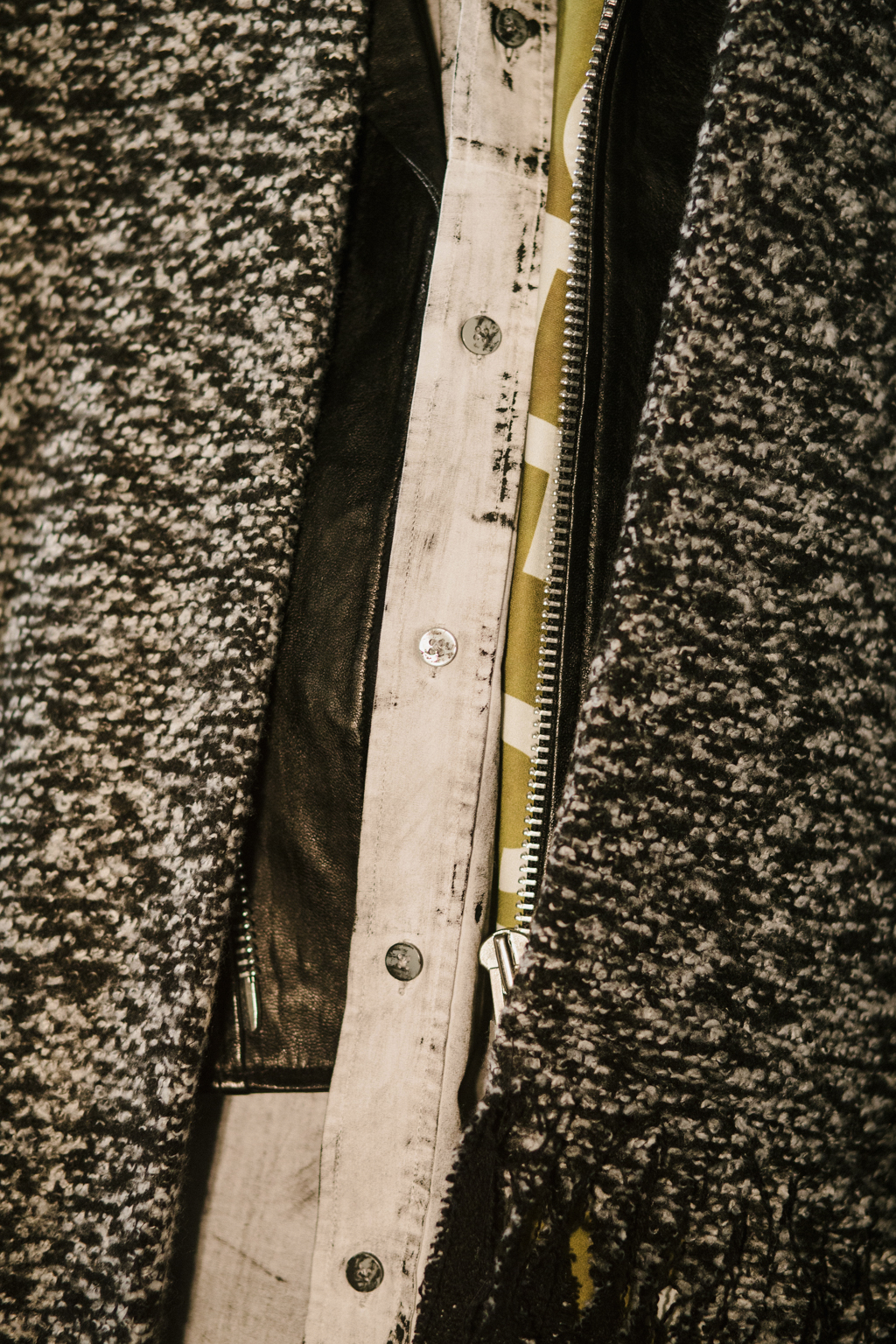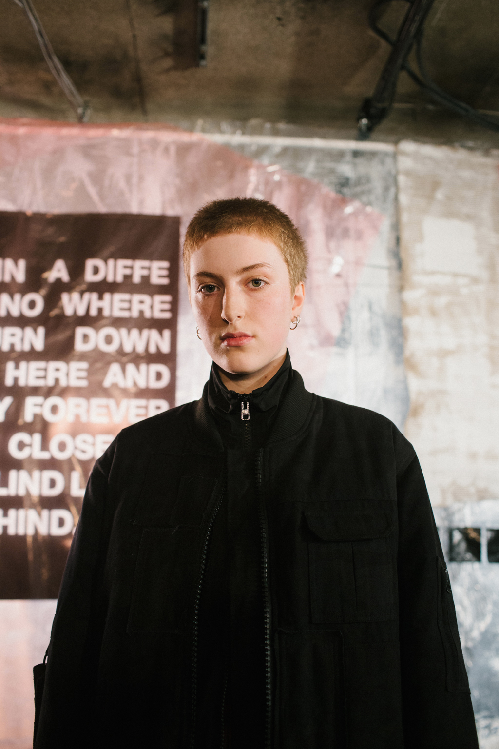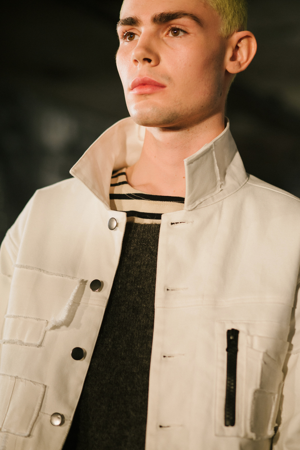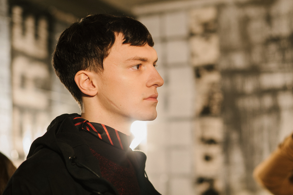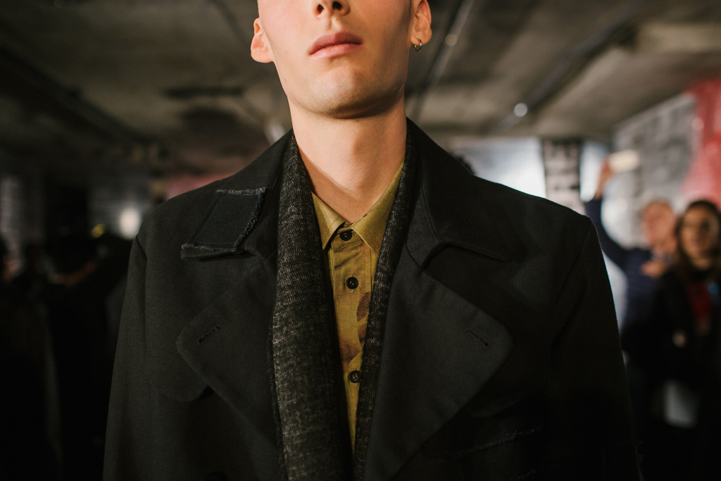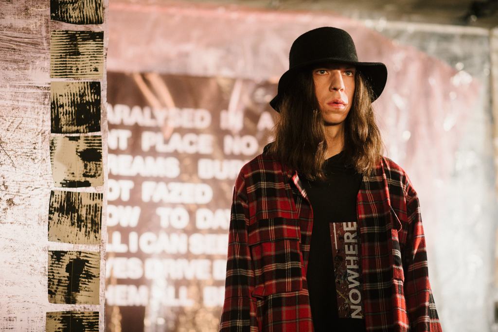 Intentionally-crumpled handouts detailed the ethos and inspiration for the new line, namely creative director, Graeme Gaughan, cited his own renewed introspection as a point of departure. In particular he harked back to the lyrics of track Nowhere from band Ride, capturing a “frustrated inability to change a bigger situation” he felt then and now: “And all that’s left is you and me and here we are…nowhere.” It is this theme of nowhere that permeates the selection, a new look in the present through the eyes of the past, Gaughan’s adolescent self reflecting on the political division and loss of cultural icons of the current day.