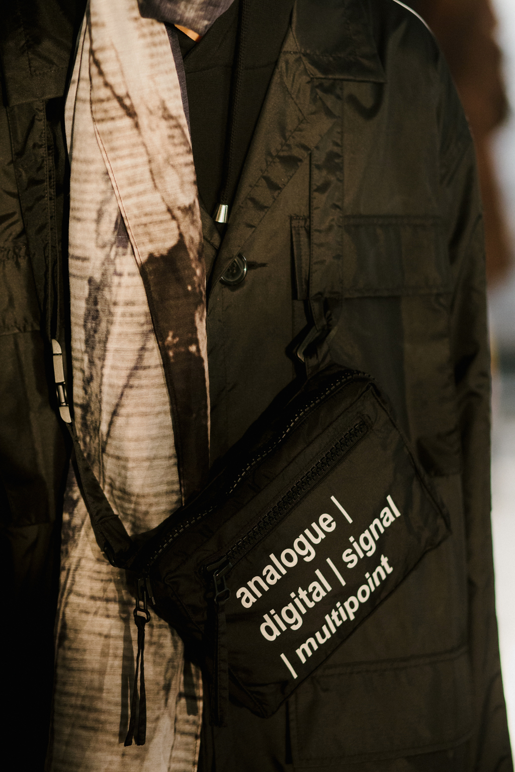 His statement look comprised a super lightweight floor-length white mac, matching trousers and a sheer white roll neck. Other outfits were more explicit in their messaging, incorporating capitalised “NOWHERE” in bold, white lettering or his trademark “analogue | digital | signal | multipoint” text.