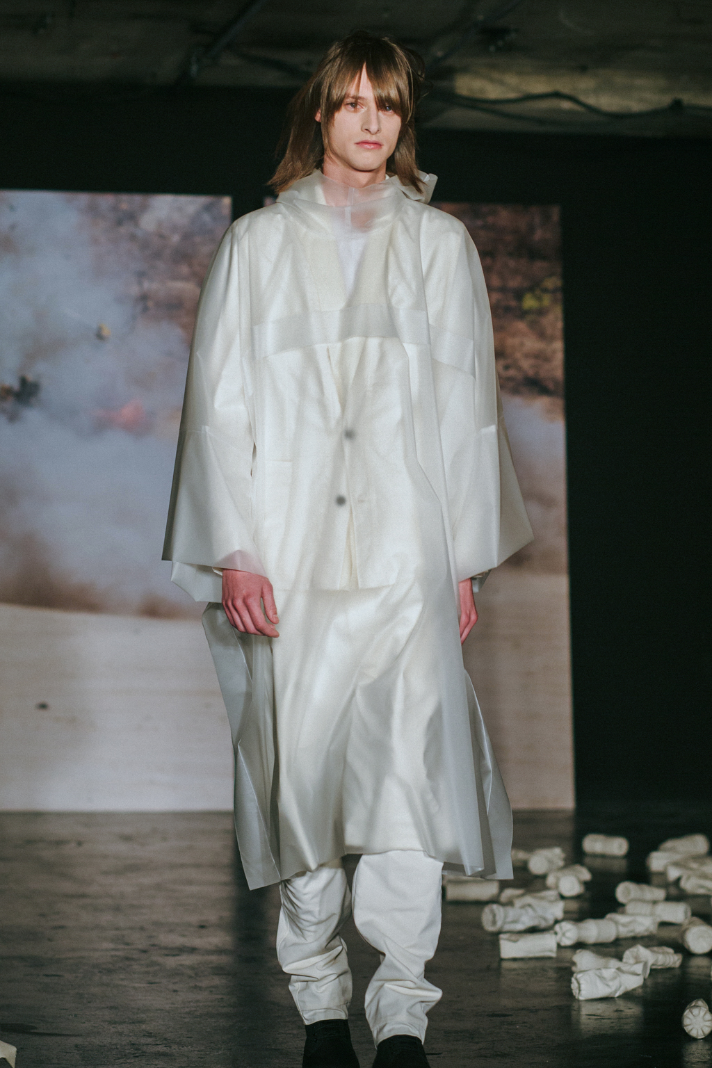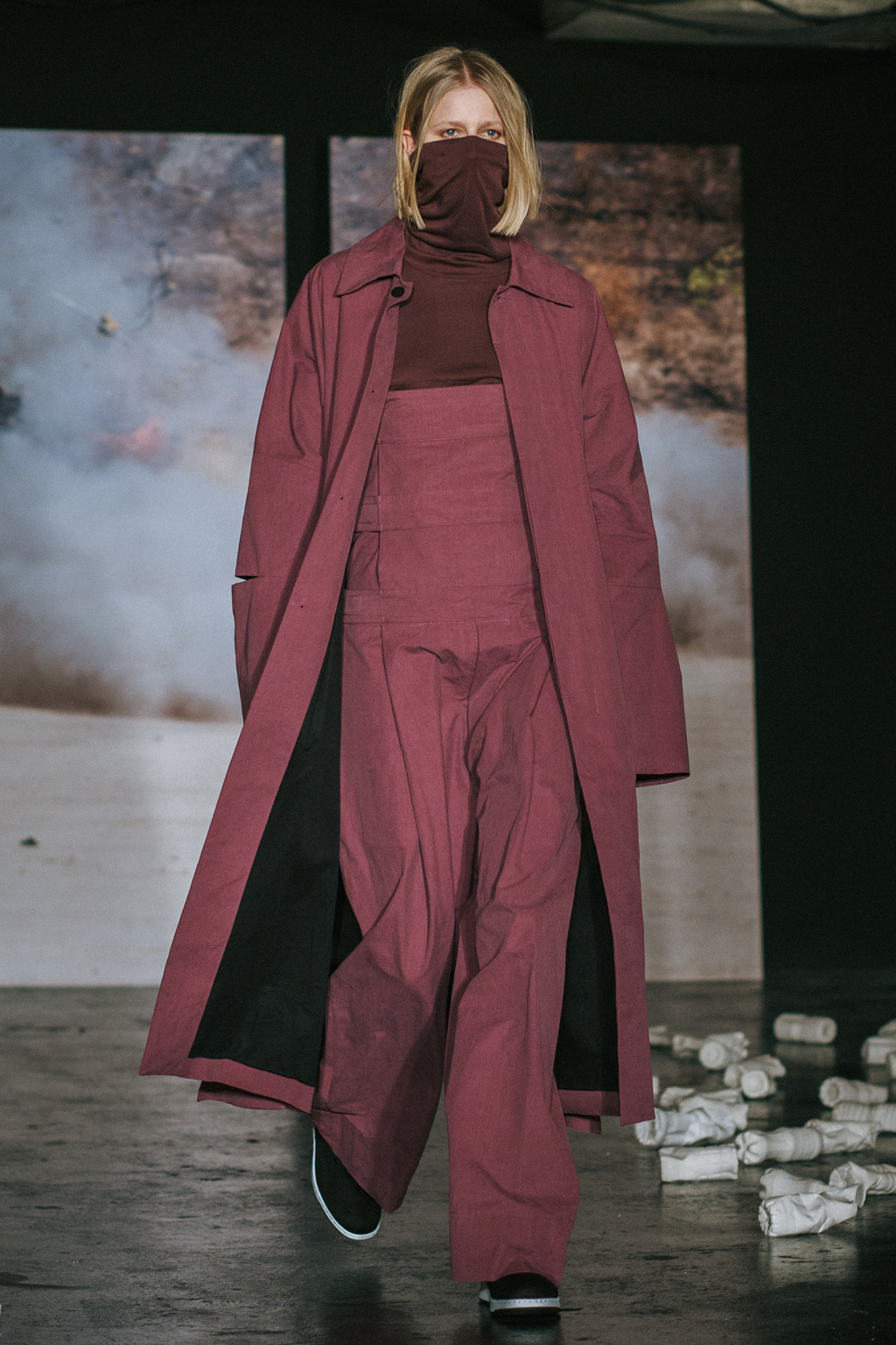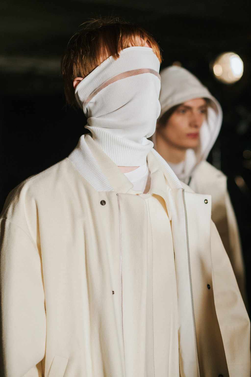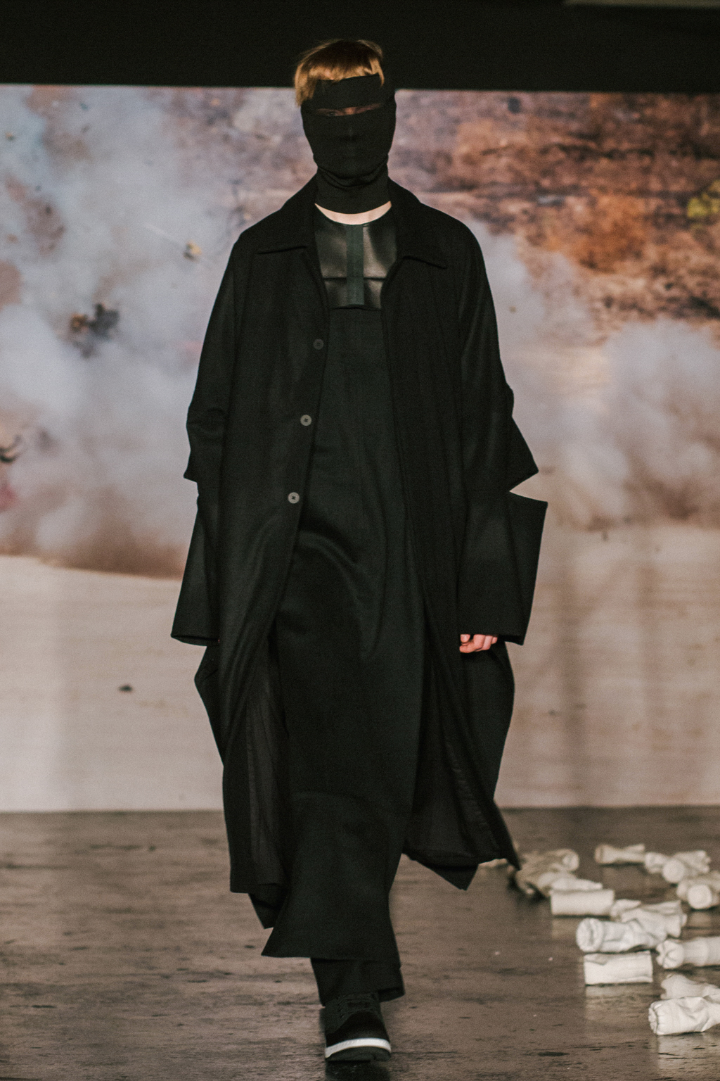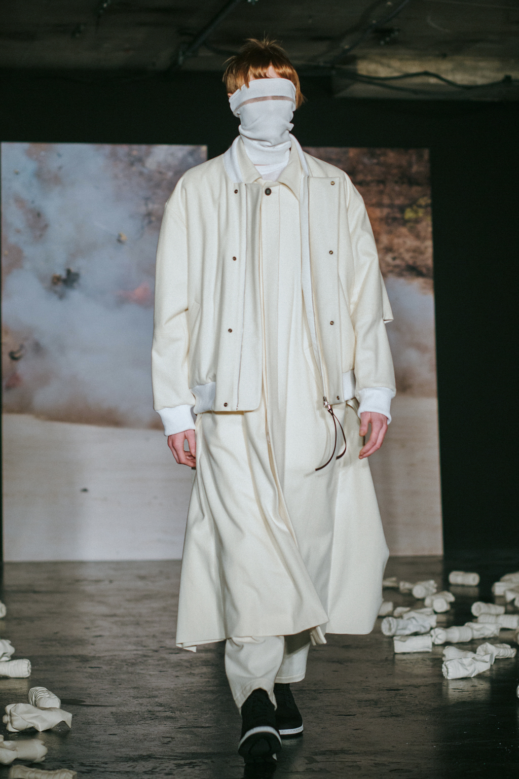 Expressionless models aped inpatients walking aimlessly through corridors, with a blocking of colours creating an illusion of indistinguishability between them. Only on closer inspection were varied textures of mohair, felted wool and soft leather visible. Bandages were wrapped around heads, eliminating identity and gender. Legs of trousers were split and sleeves slit open. Billowing jackets contrasted with corset-like body gloves.