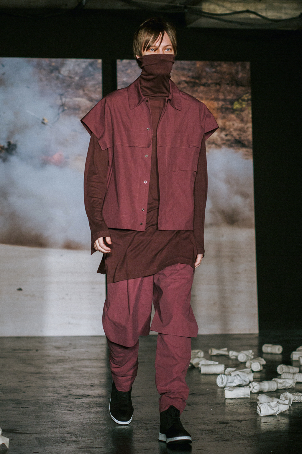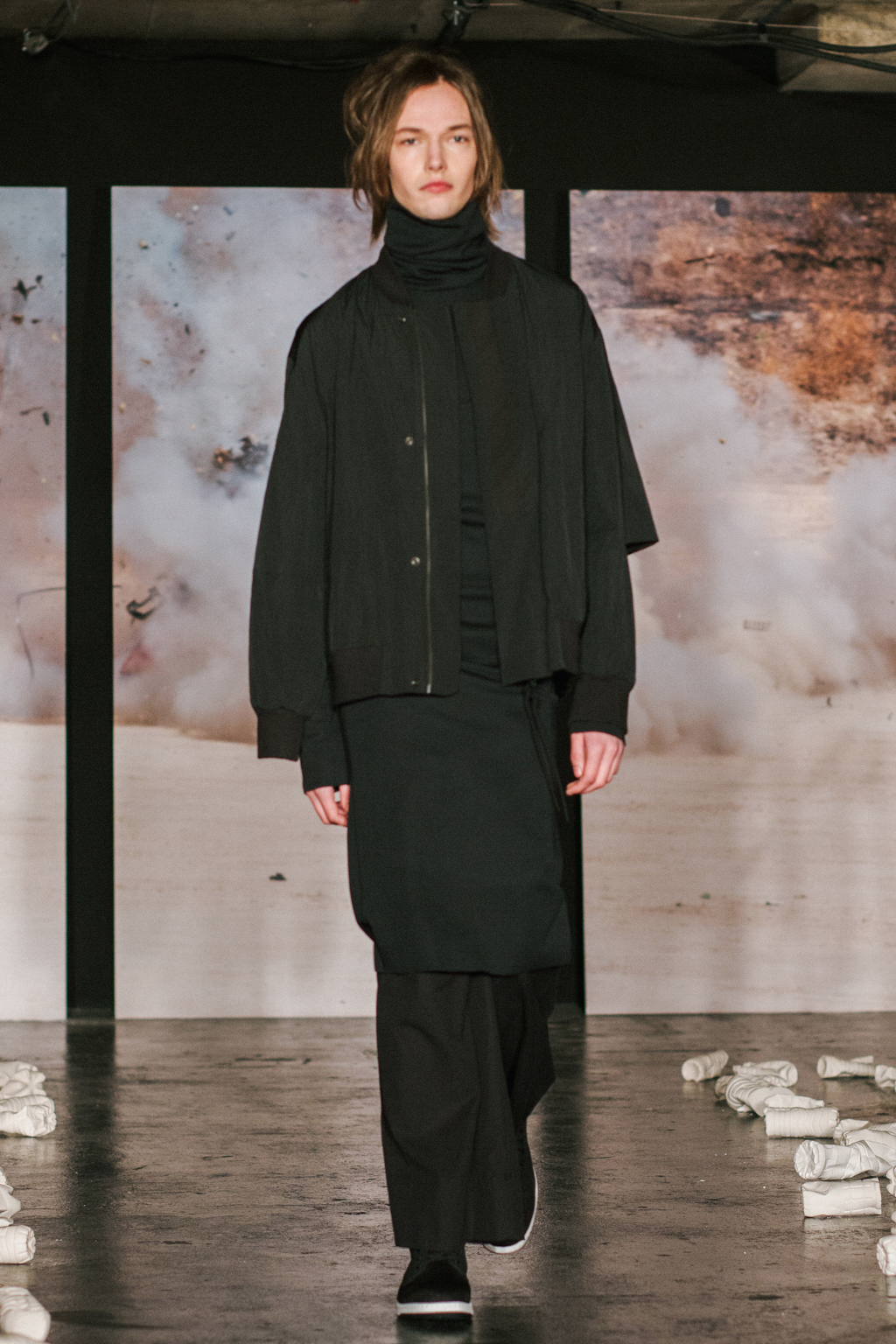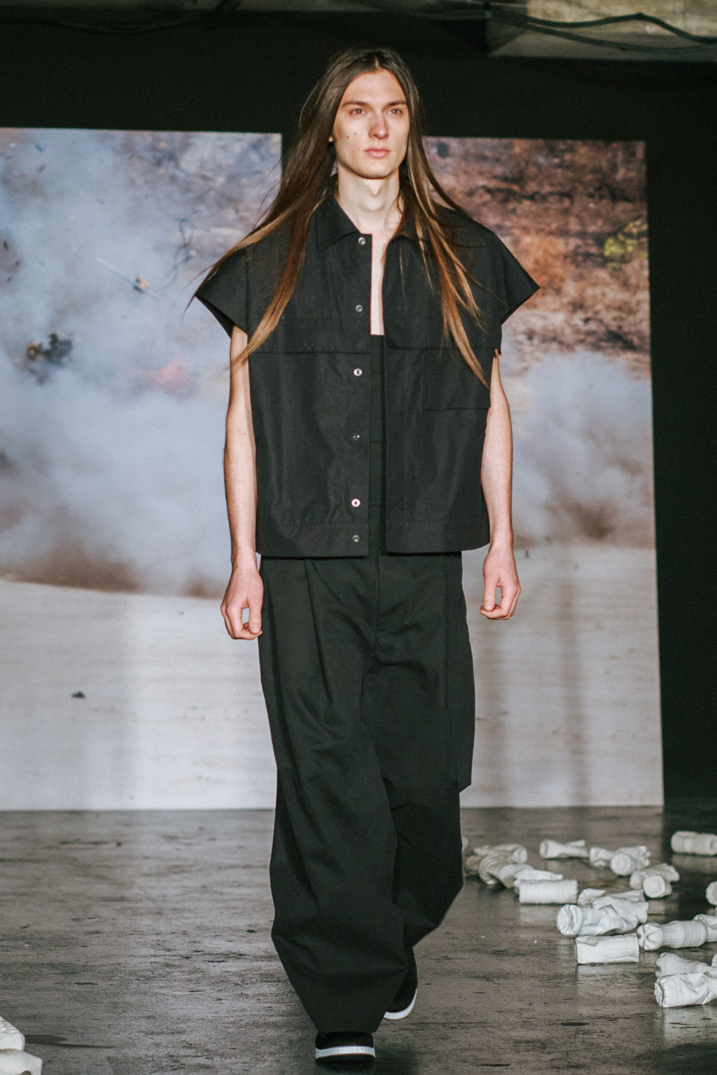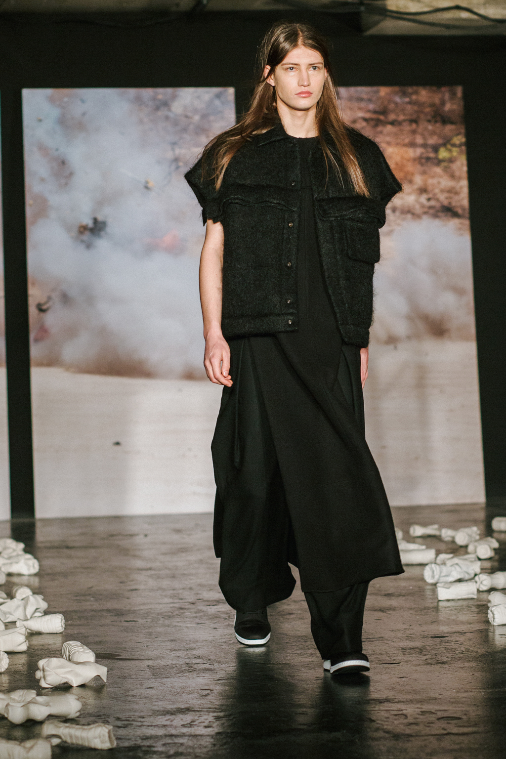 Expressionless models aped inpatients walking aimlessly through corridors, with a blocking of colours creating an illusion of indistinguishability between them. Only on closer inspection were varied textures of mohair, felted wool and soft leather visible. Bandages were wrapped around heads, eliminating identity and gender. Legs of trousers were split and sleeves slit open. Billowing jackets contrasted with corset-like body gloves.