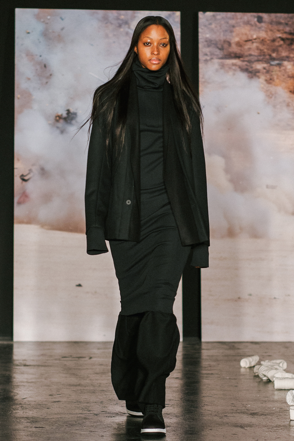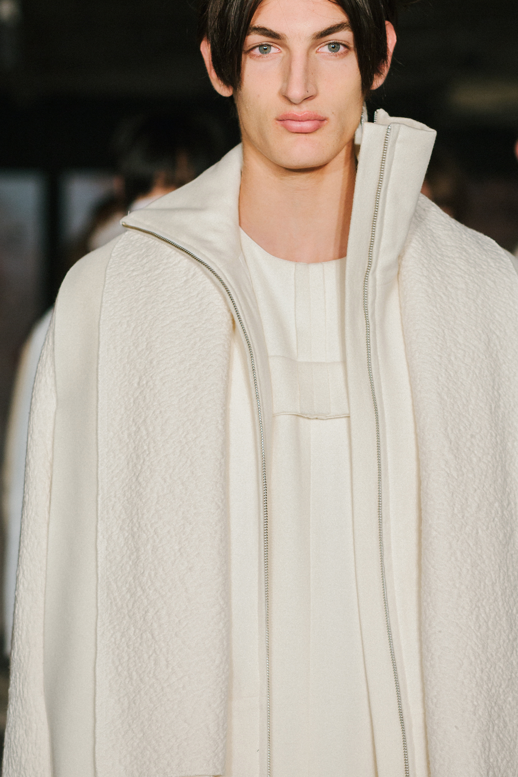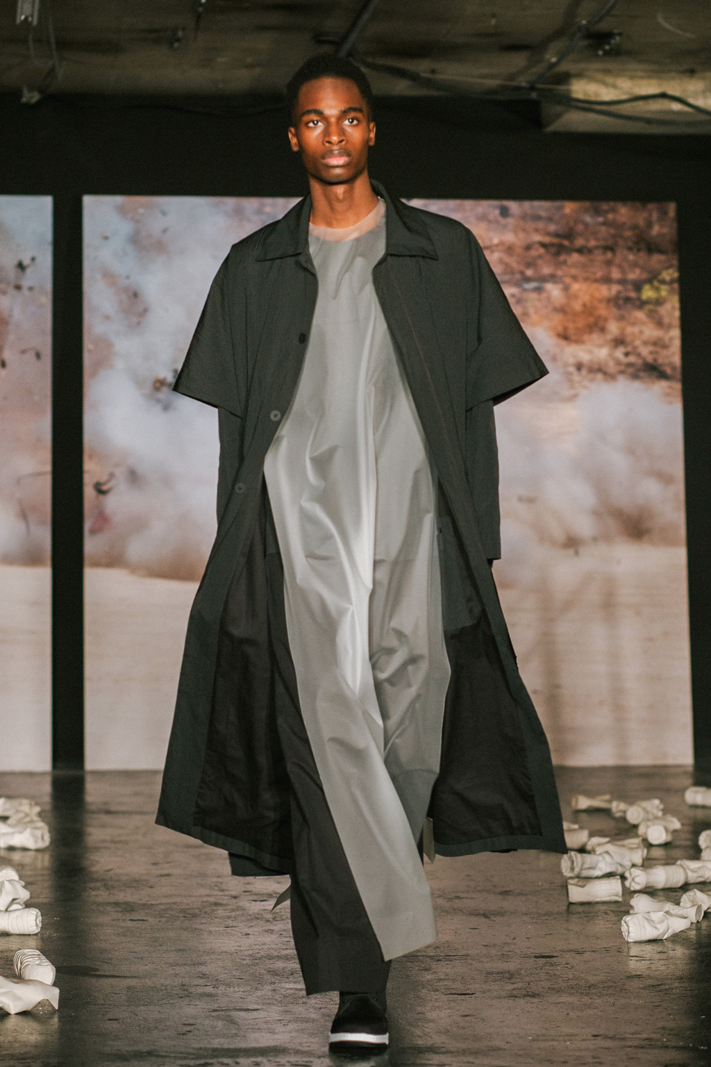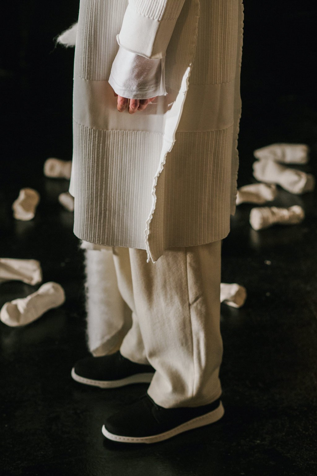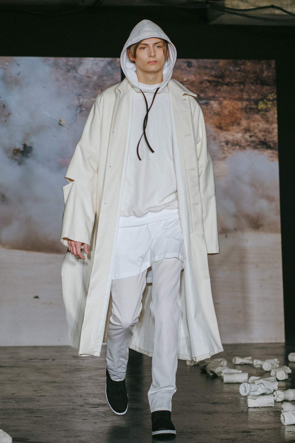 Expressionless models aped inpatients walking aimlessly through corridors, with a blocking of colours creating an illusion of indistinguishability between them. Only on closer inspection were varied textures of mohair, felted wool and soft leather visible. Bandages were wrapped around heads, eliminating identity and gender. Legs of trousers were split and sleeves slit open. Billowing jackets contrasted with corset-like body gloves.