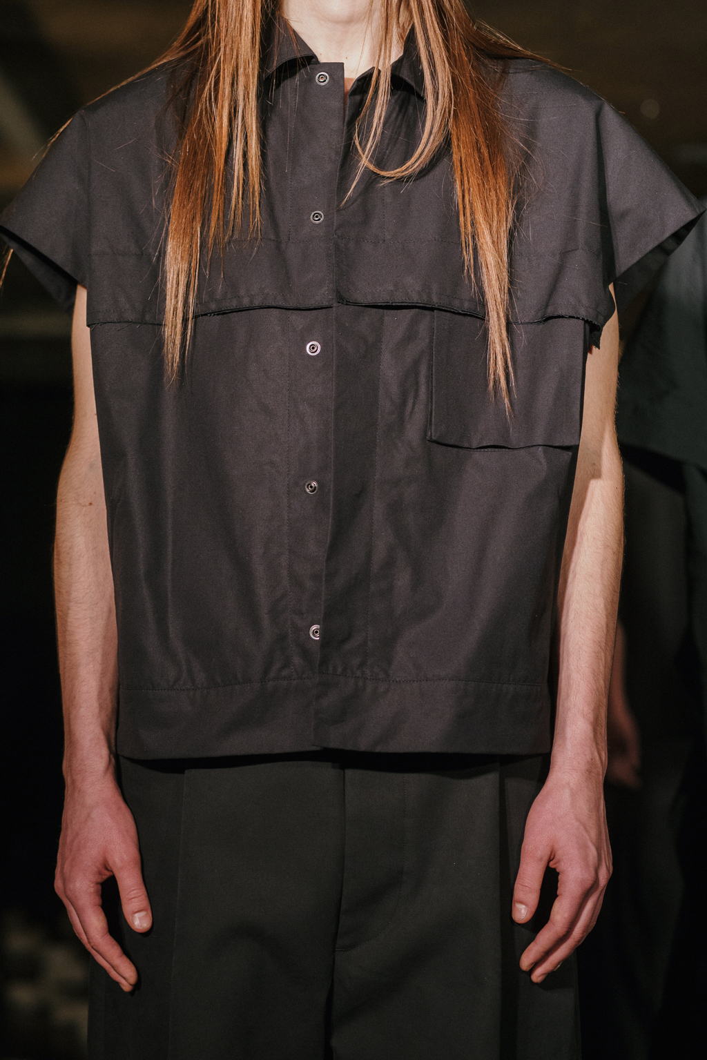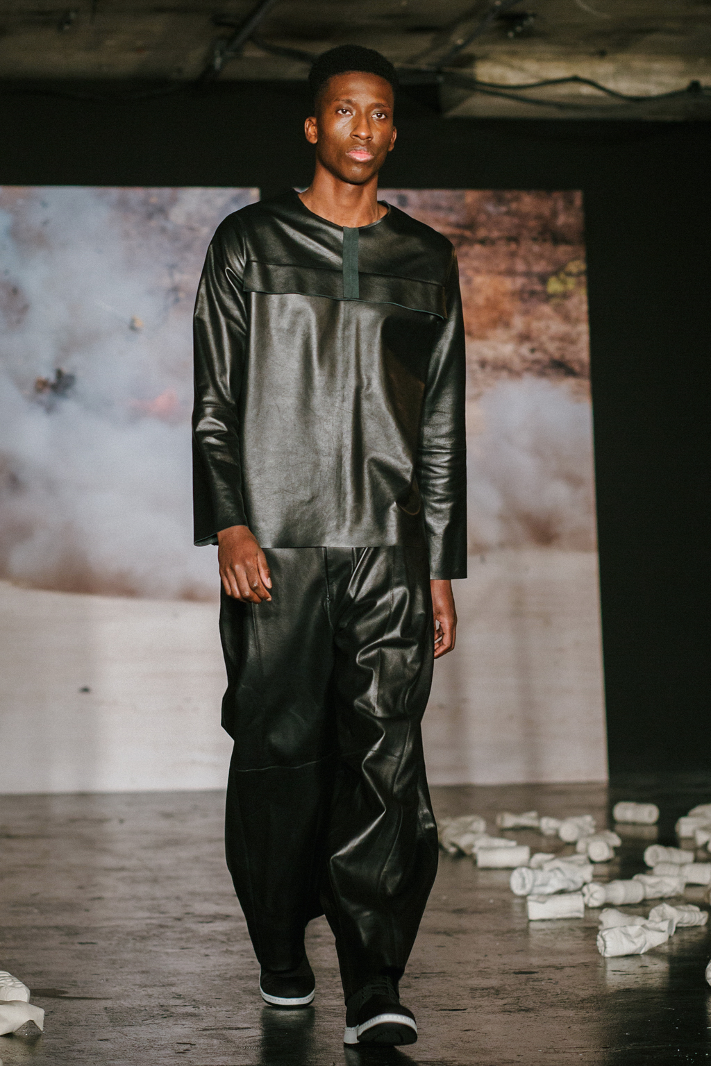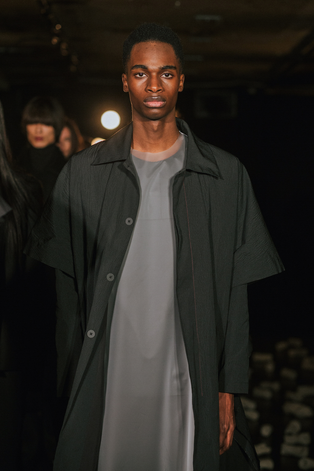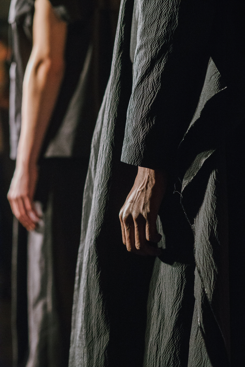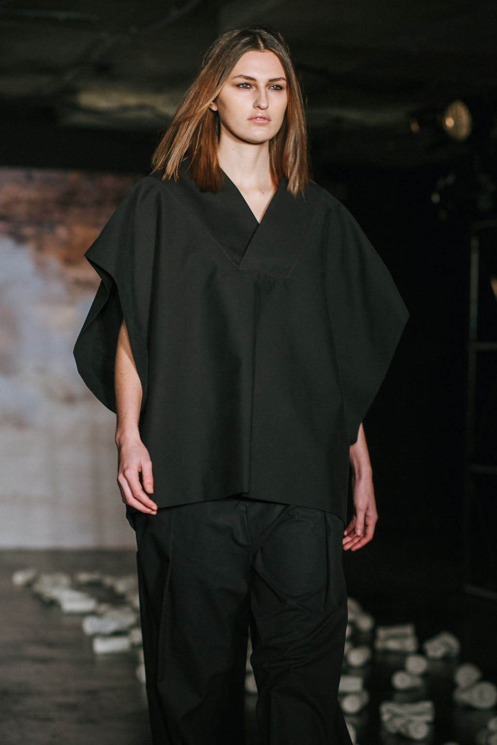 Expressionless models aped inpatients walking aimlessly through corridors, with a blocking of colours creating an illusion of indistinguishability between them. Only on closer inspection were varied textures of mohair, felted wool and soft leather visible. Bandages were wrapped around heads, eliminating identity and gender. Legs of trousers were split and sleeves slit open. Billowing jackets contrasted with corset-like body gloves.