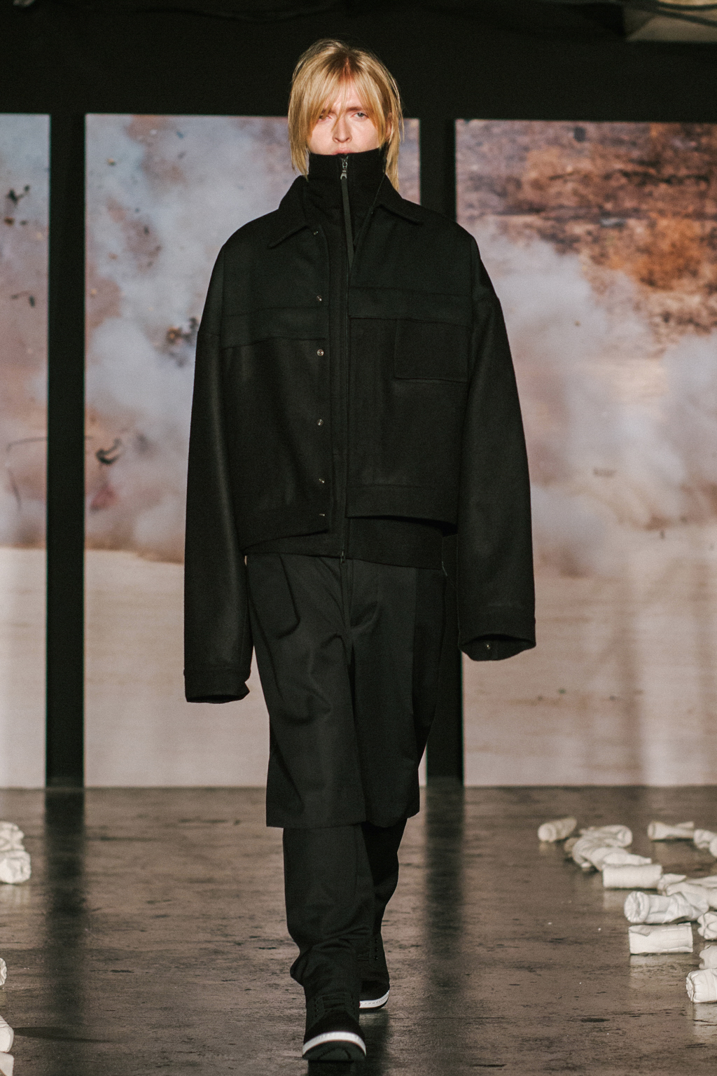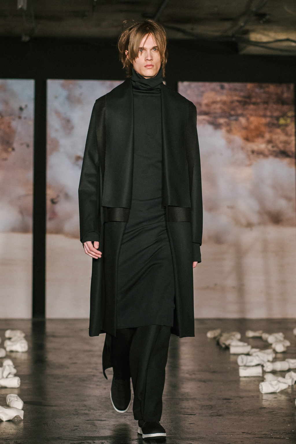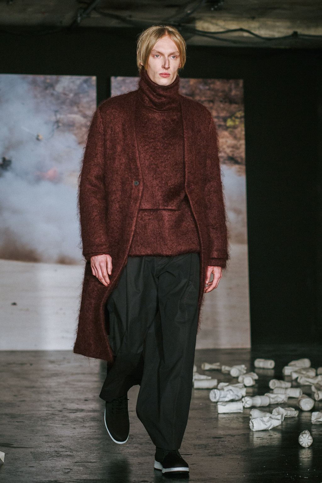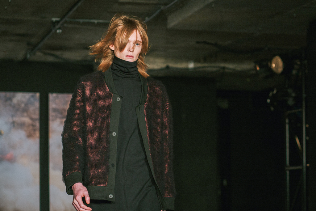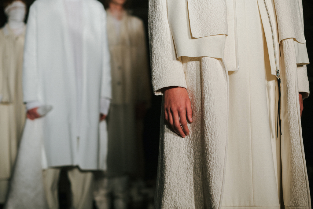 Minimalist in fabric and colour choice, models were dressed head-to-toe in heavy black, white or red; the impact of the aesthetic became most apparent when the full cast stood together in final formation. Behind the distressed overall styling lay wearable and understated overcoats, wide-legged trousers and woollen separates. A striking exploration into minimalism.