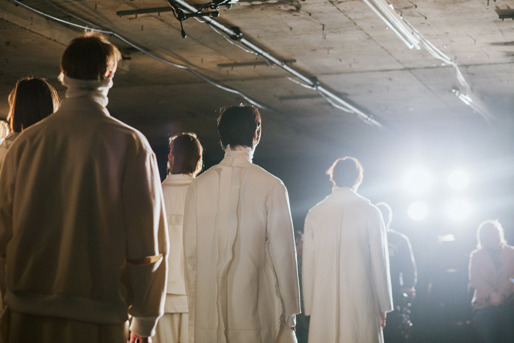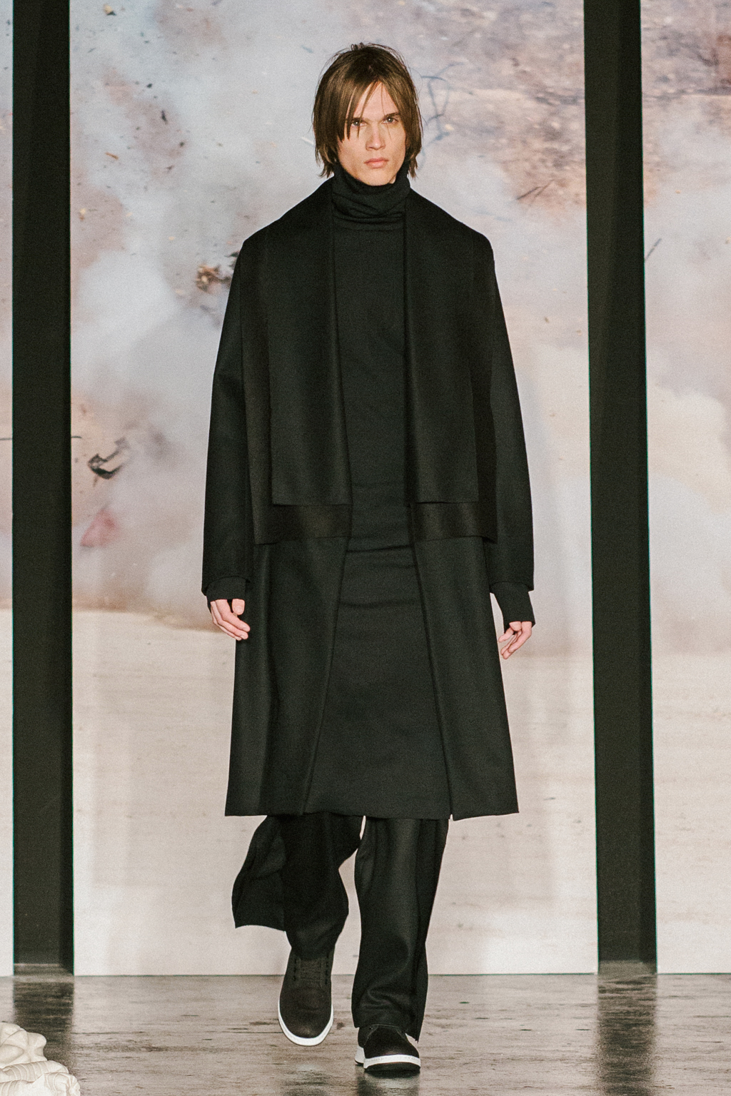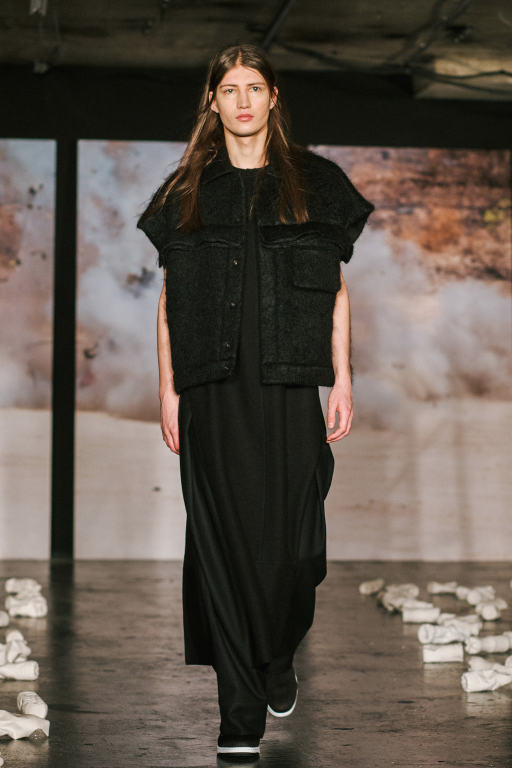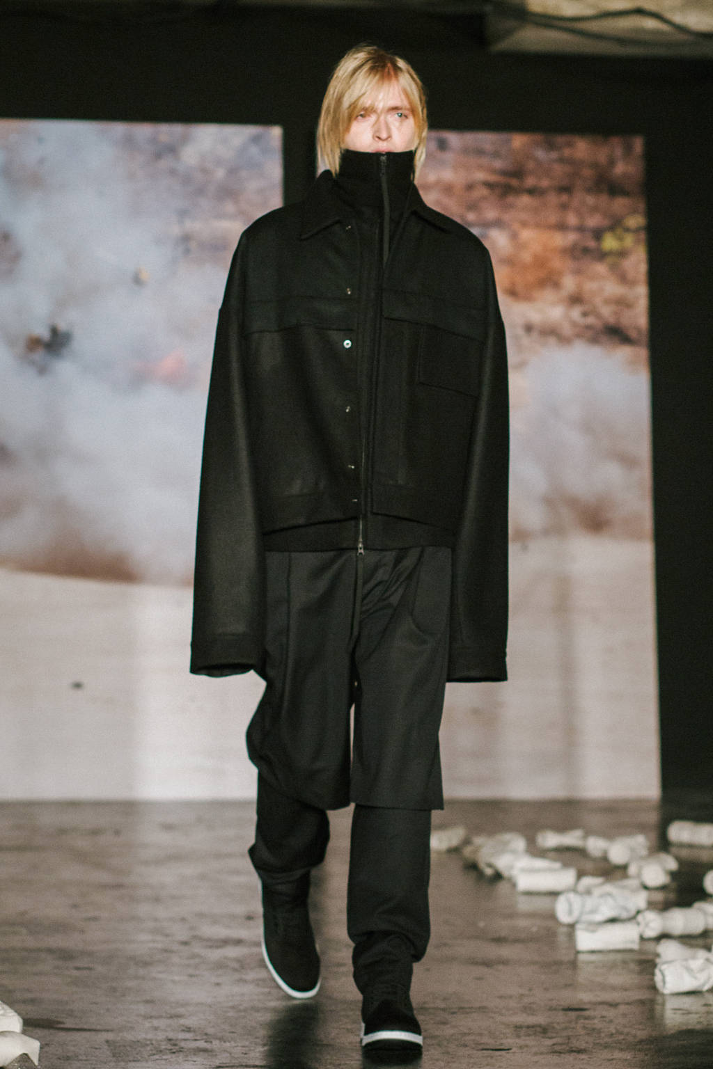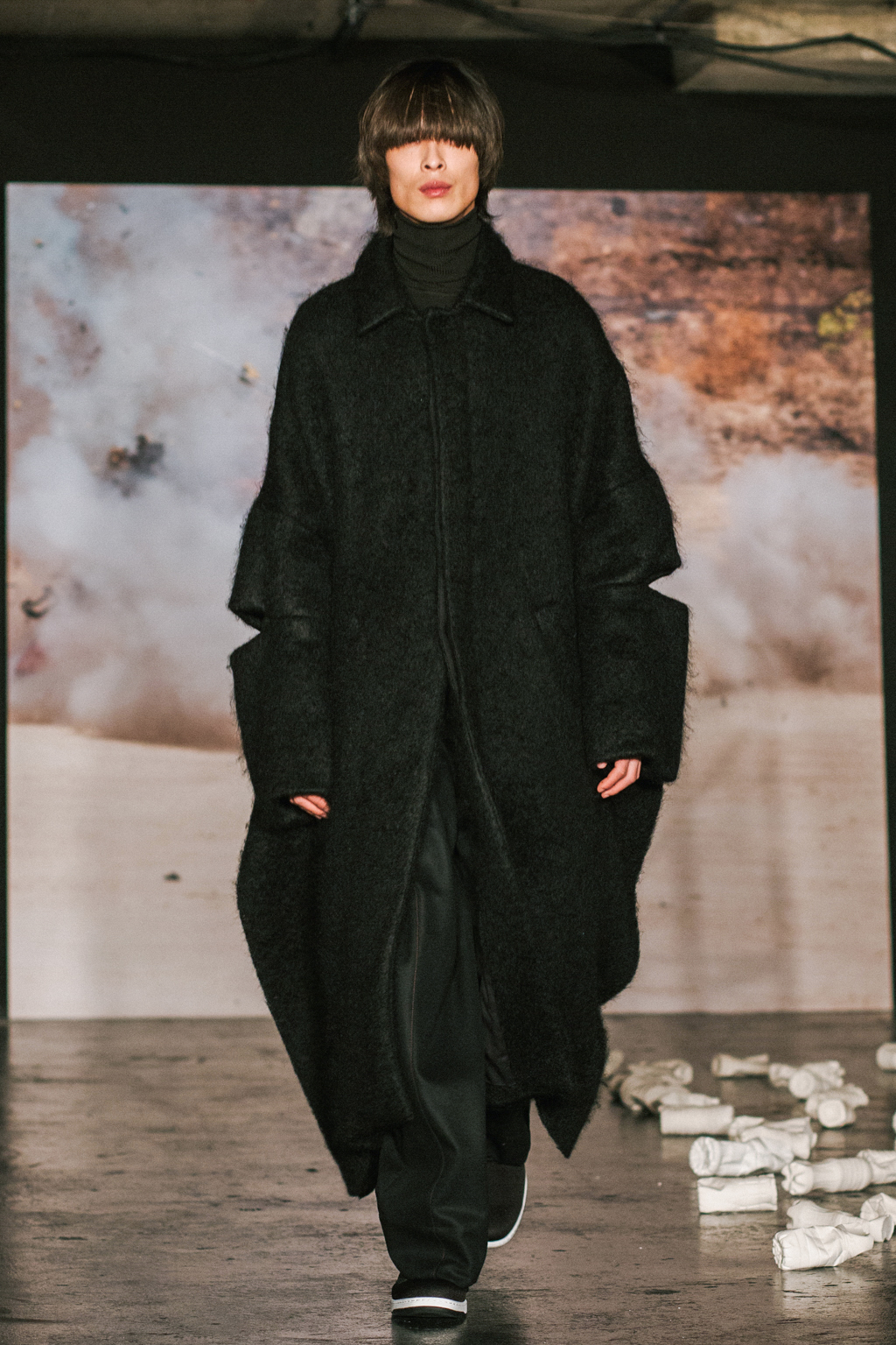 Minimalist in fabric and colour choice, models were dressed head-to-toe in heavy black, white or red; the impact of the aesthetic became most apparent when the full cast stood together in final formation. Behind the distressed overall styling lay wearable and understated overcoats, wide-legged trousers and woollen separates. A striking exploration into minimalism.