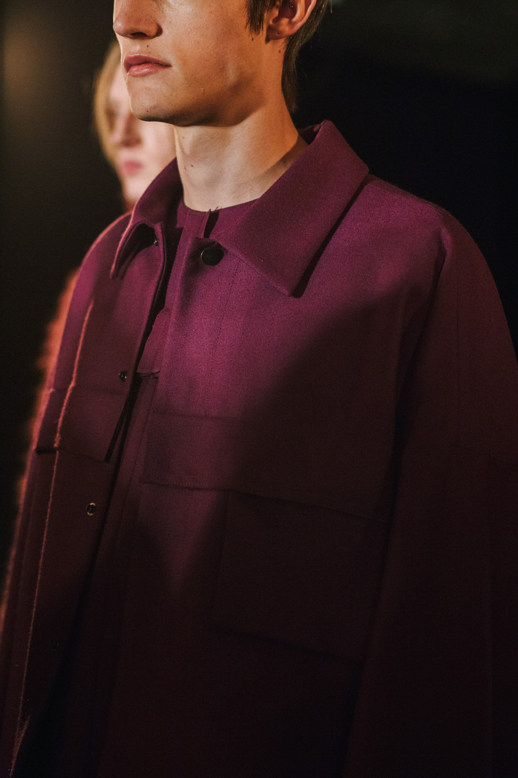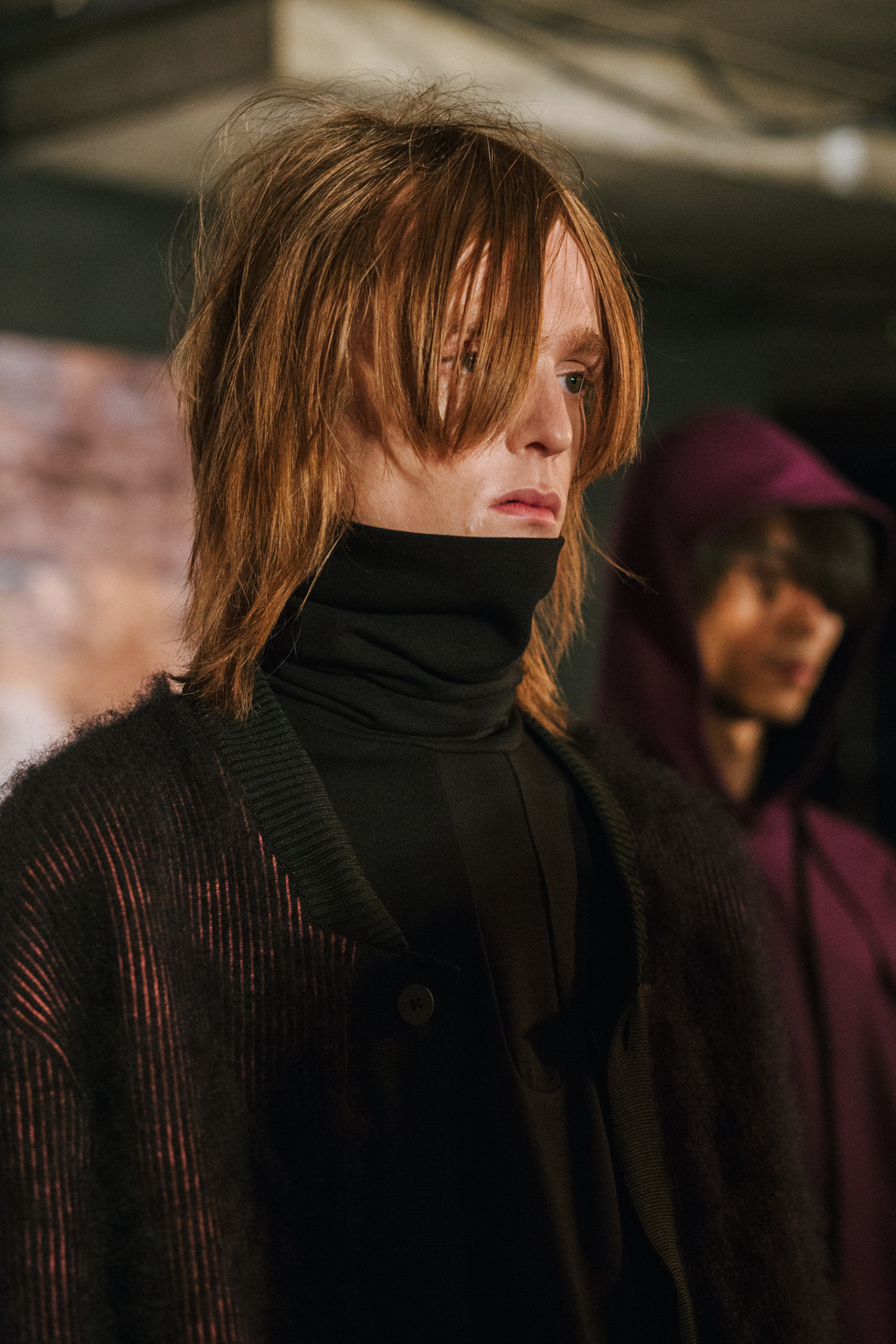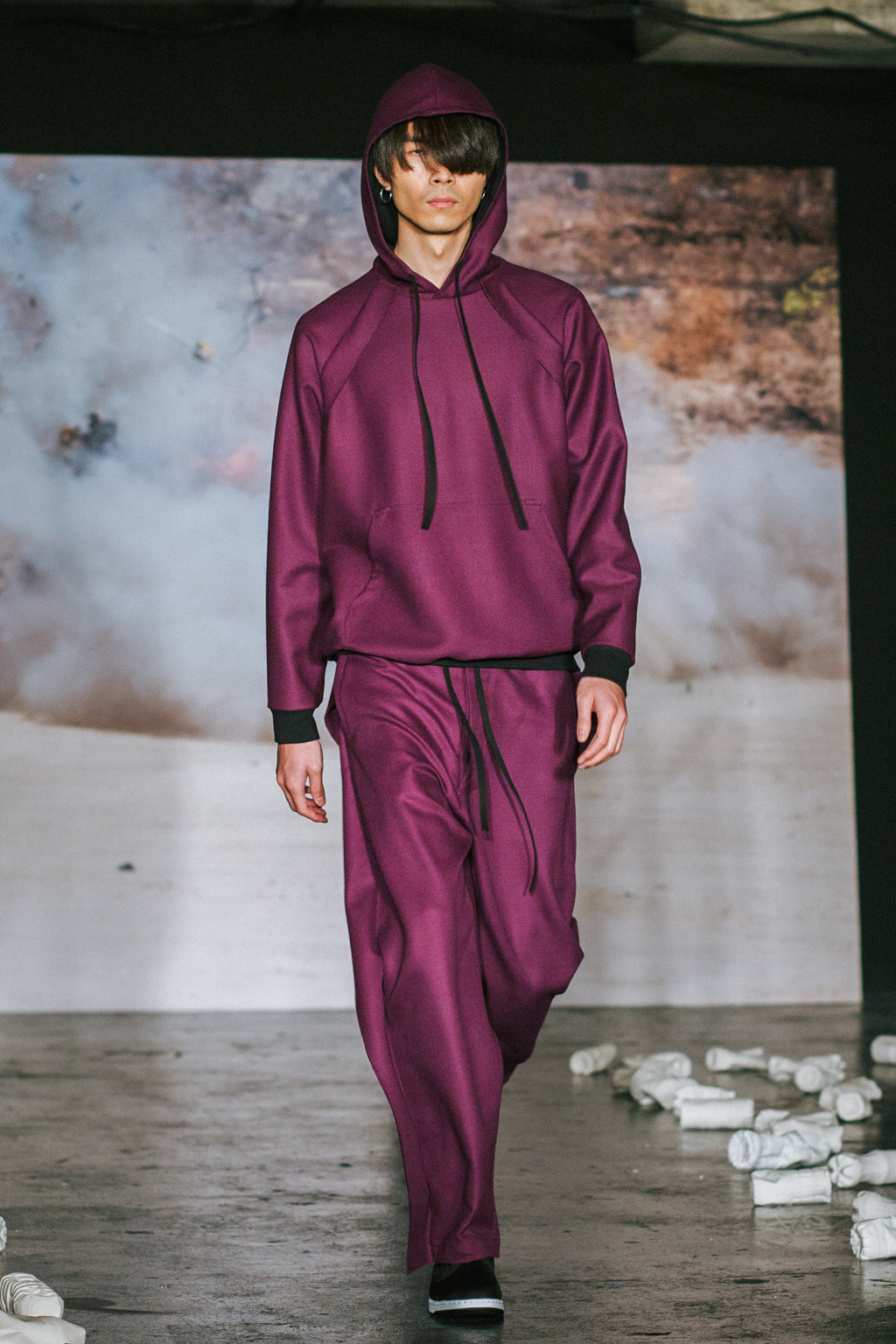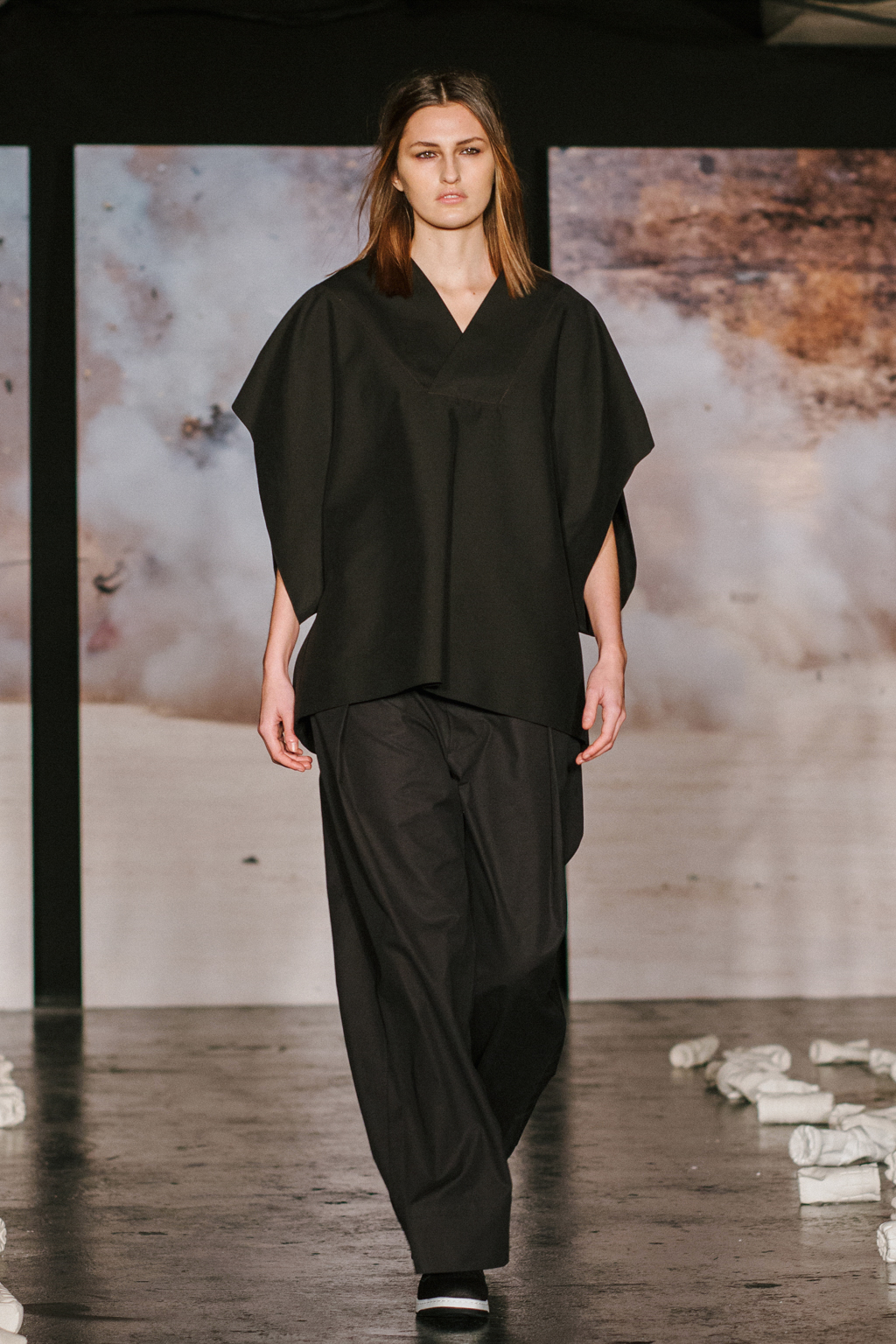 Minimalist in fabric and colour choice, models were dressed head-to-toe in heavy black, white or red; the impact of the aesthetic became most apparent when the full cast stood together in final formation. Behind the distressed overall styling lay wearable and understated overcoats, wide-legged trousers and woollen separates. A striking exploration into minimalism.