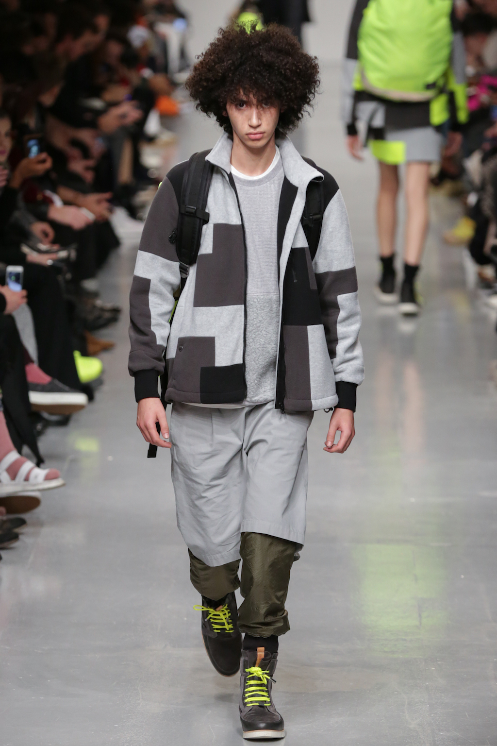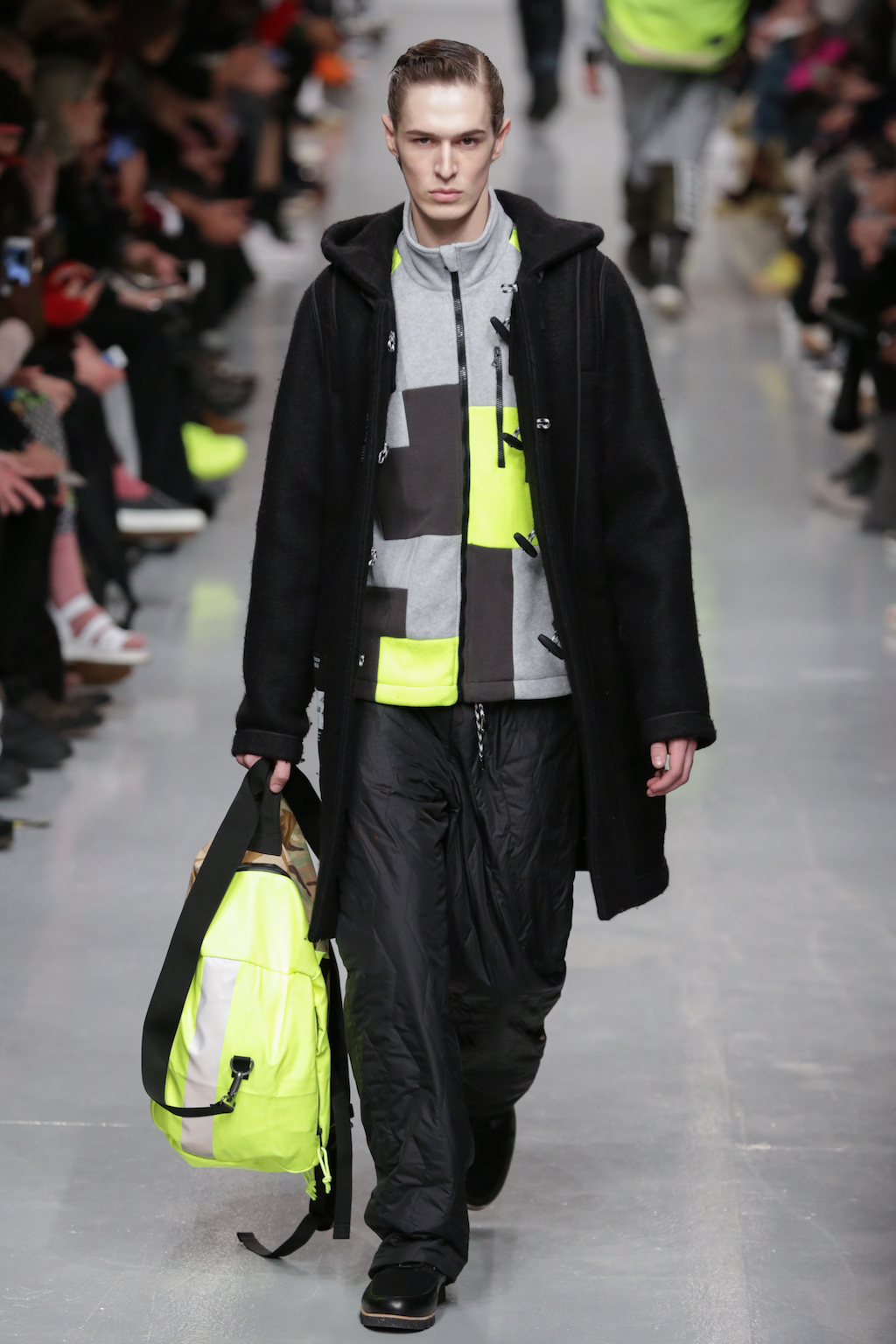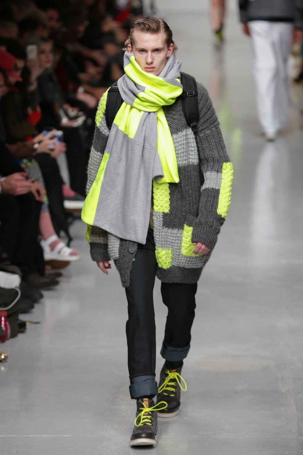 Womenswear pieces informed by the aesthetic present an extended unisex range. From a wintery base of charcoal, pale grey, black and khaki, an exhilarating flash of fluorescent yellow and turquoise shoots through the collection, a brazen repost to the subdued tones of the season.