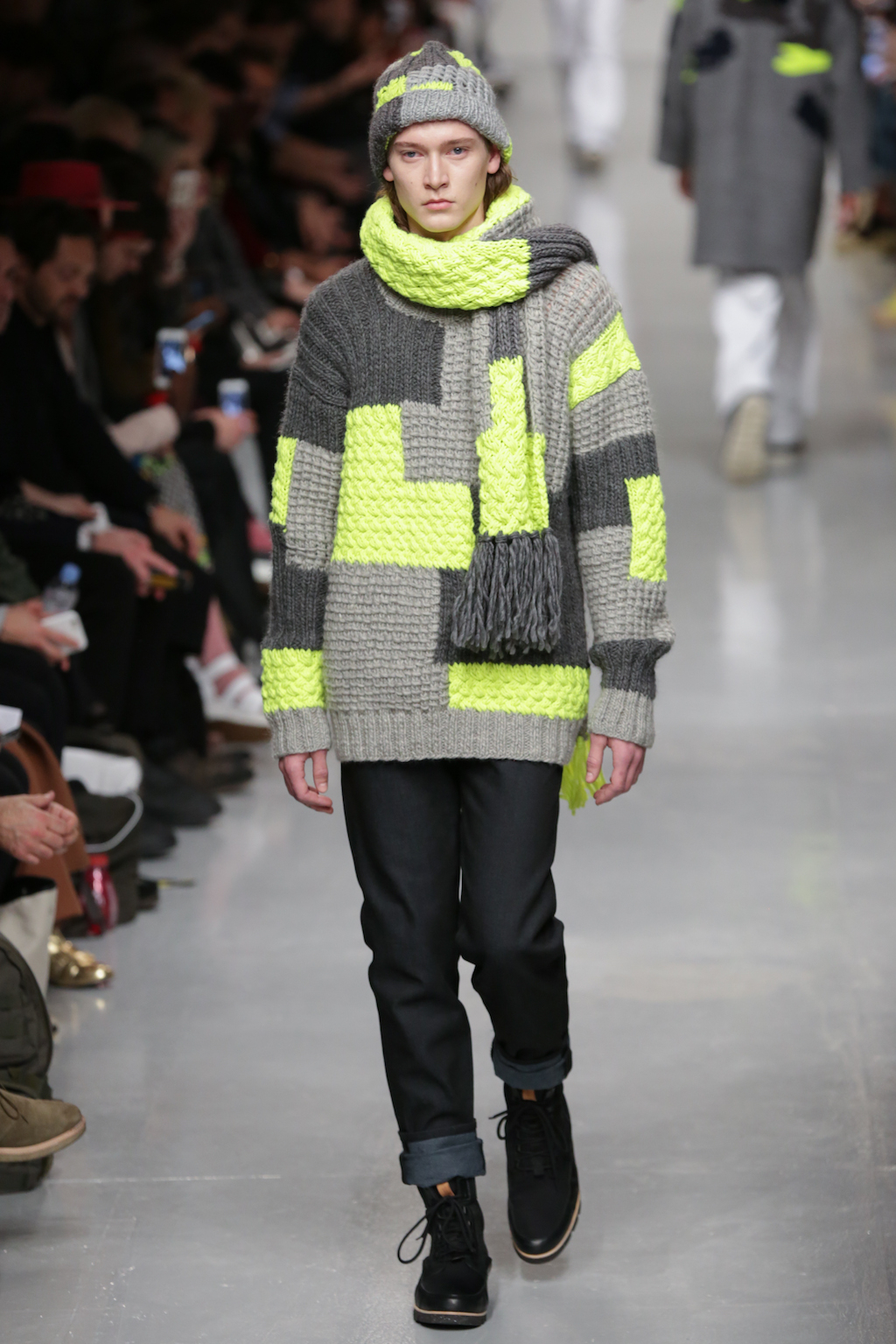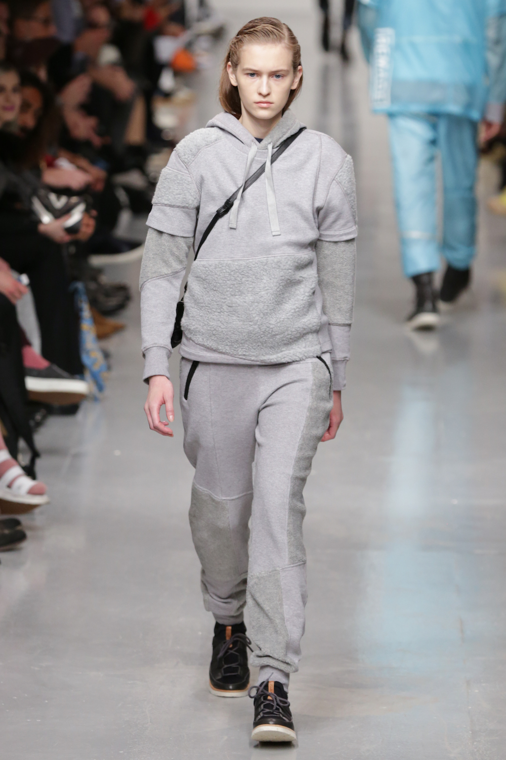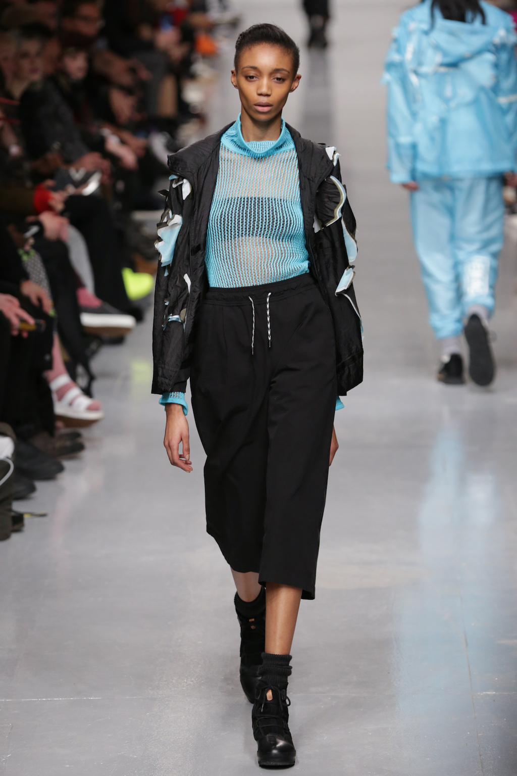 Womenswear pieces informed by the aesthetic present an extended unisex range. From a wintery base of charcoal, pale grey, black and khaki, an exhilarating flash of fluorescent yellow and turquoise shoots through the collection, a brazen repost to the subdued tones of the season.