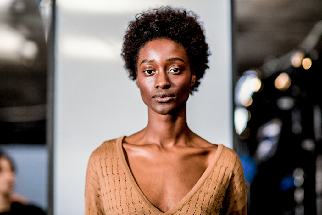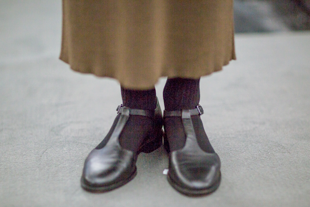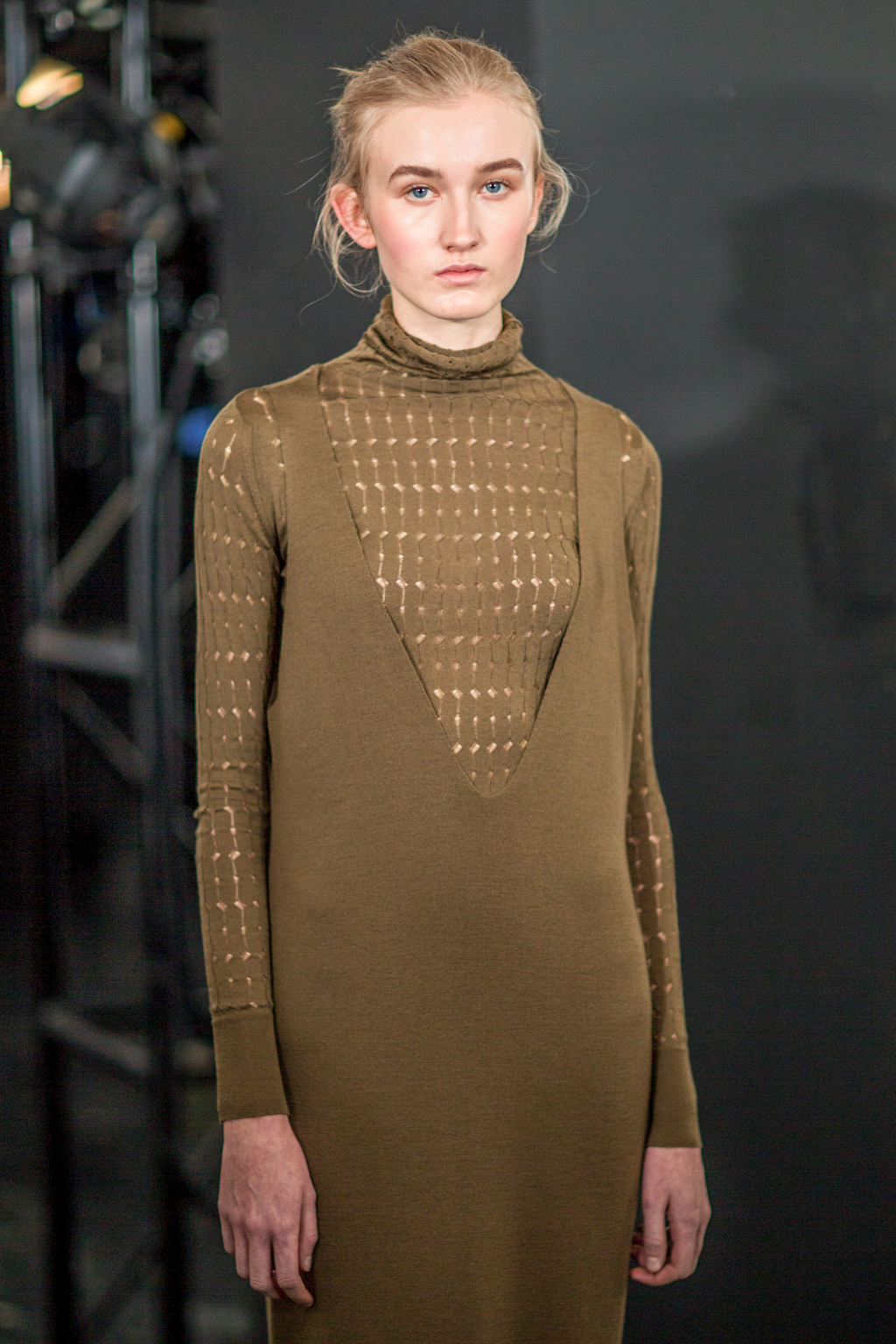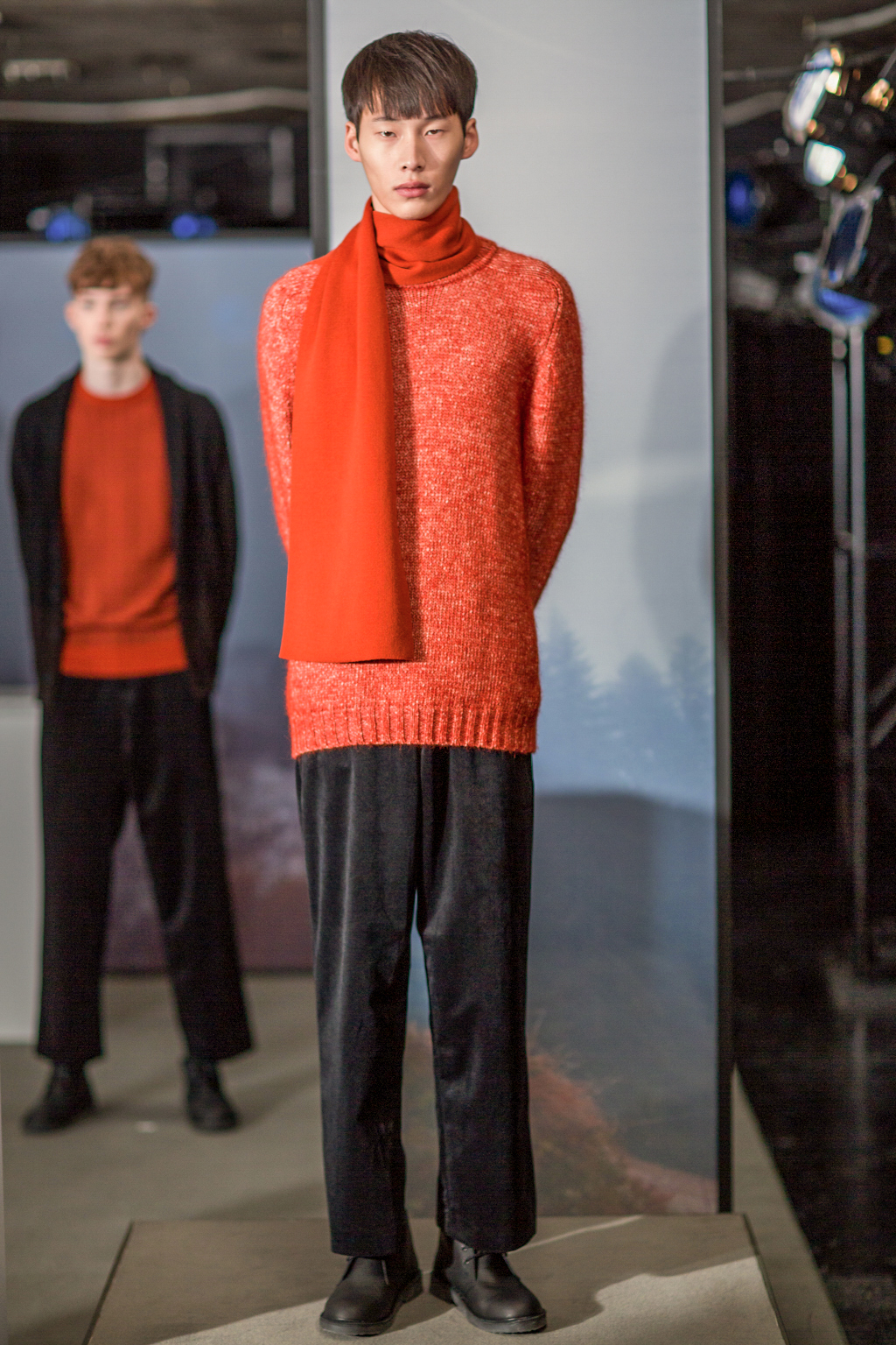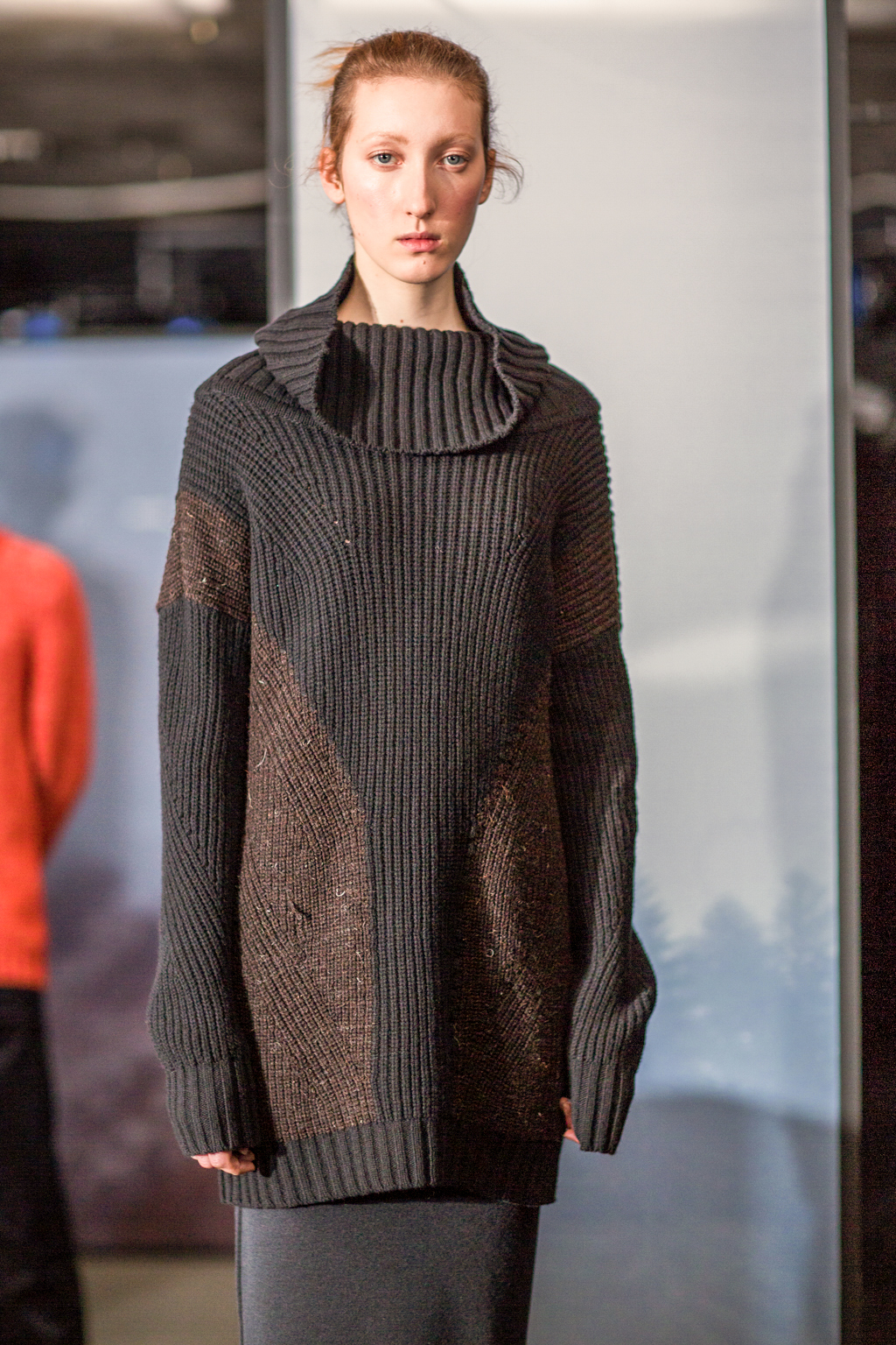 Far from confining, a singular dedication to knitwear provokes an-depth investigation into its varying aesthetics and effects. The choice of knit becomes a storyteller through the pieces: abstract patterns and textures represent landscapes, contrasting with fuller, chunkier textures and ribs, and fluid silk silhouettes. The colour palette consists of shades within the autumnal spectrum, showcasing orange and green set off against black.