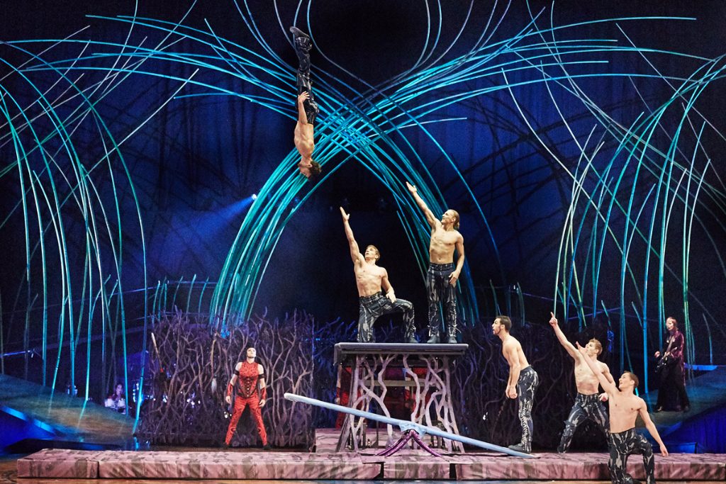Some of the standout stunts are the aerial straps and the “Balance Goddess”, who builds and balances a giant mobile of palm ribs; while it might not sound that exciting to those unfamiliar with this kind of act, the tension it builds is palpable. Though it is not always apparent how these performances are serving the narrative, they are certainly impressive. Complete with the most soulful pole routine that has been seen since Liv Tyler in the Crazy video, Amaluna is an audiovisual feast full of wonder.