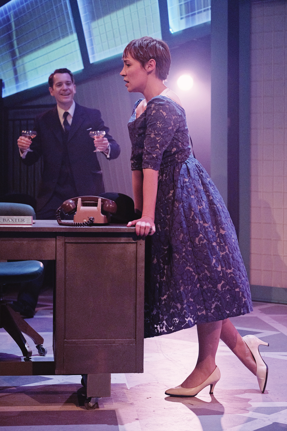 The recreation of the 60s New York office and Chuck’s bachelor apartment, which emerges from the back of the stage, are brilliantly done and superbly set off by a creative use of lighting, allowing Chuck to step out of his reality to speak directly with the audience at intervals. And a band tucked in the corner of the playhouse space give the songs and frivolities the immediacy of a live gig.