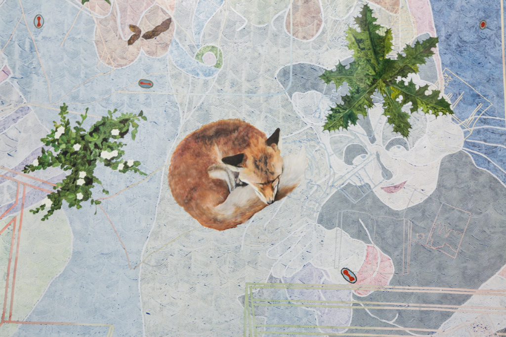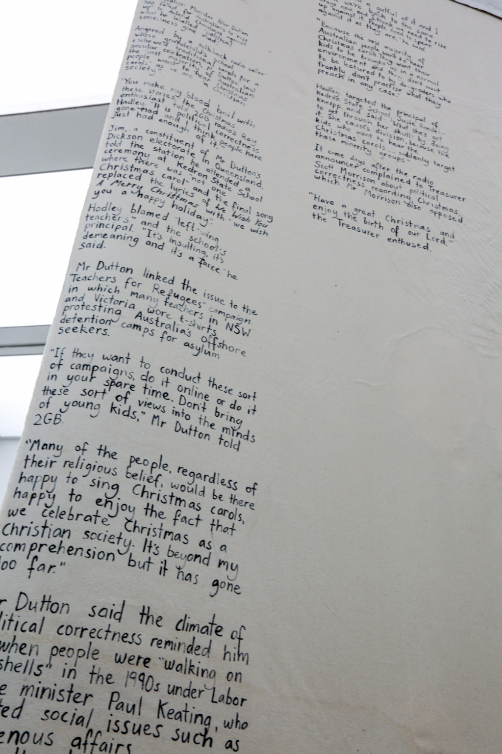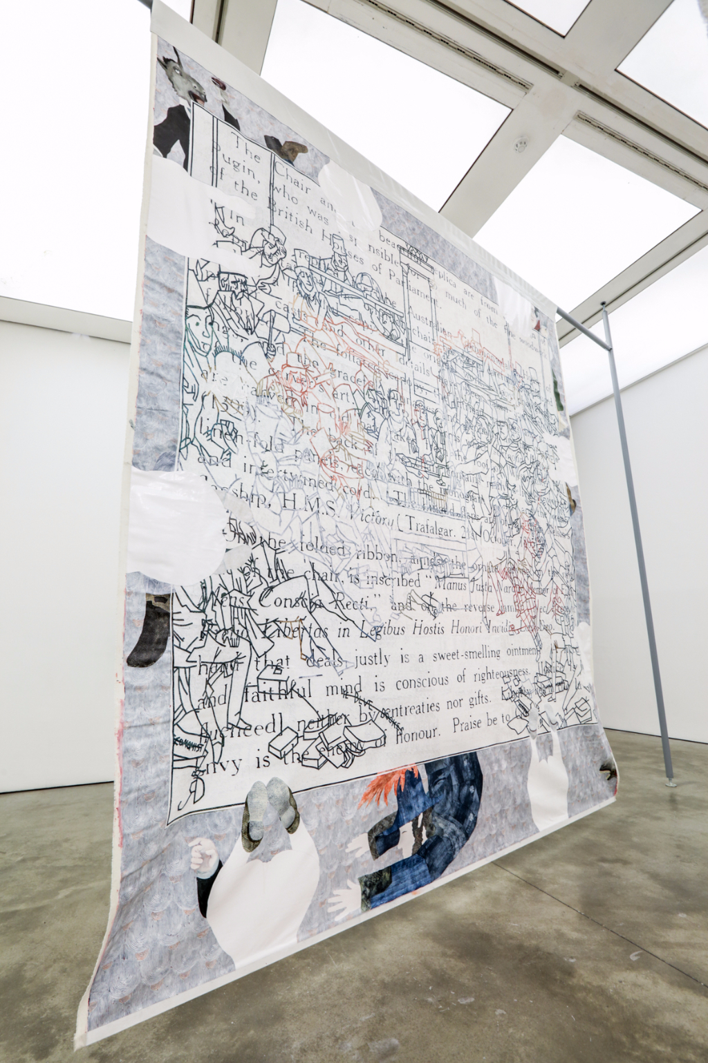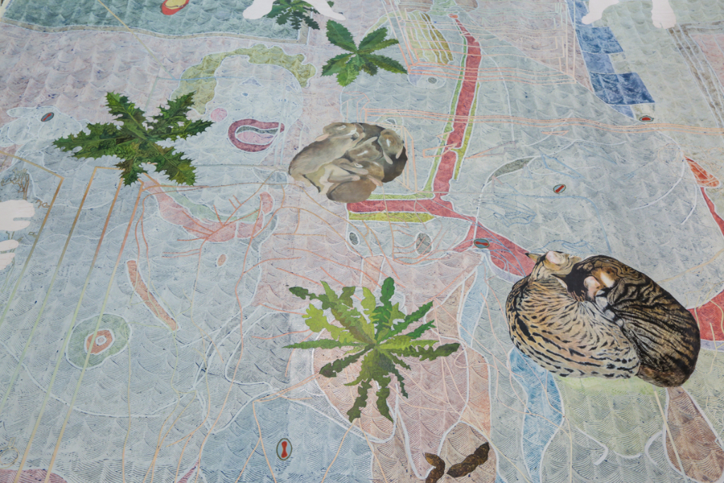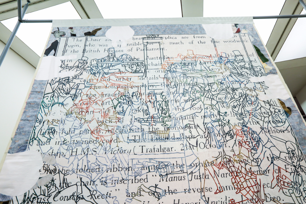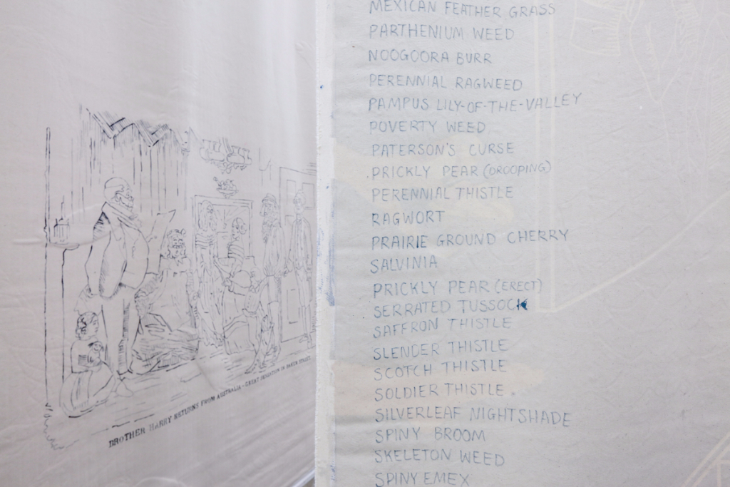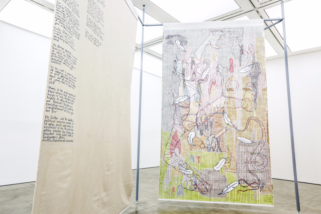 But Warm Ties doesn’t limit itself to the obvious comparisons. Johnson attempts to highlight, and potentially mock, efforts to conjure a modern identity. In one piece, she reprints in its entirety an article by the Sydney Morning Herald regarding Immigration Minister Peter Dutton’s “calls for a pro-Christmas uprising” and his rally against political correctness. In another painting, a man visibly pleasures himself whilst the lyrics of the country’s national anthem are sung into his ear. Johnson uses large theatre backdrop-sized canvases for her paintings, which veer into almost appearing like a modern Australian medieval-inspired tapestry, chronicling the history of a “young-ish” nation.