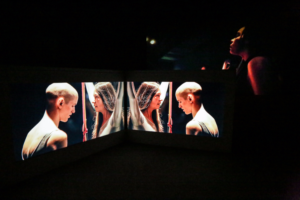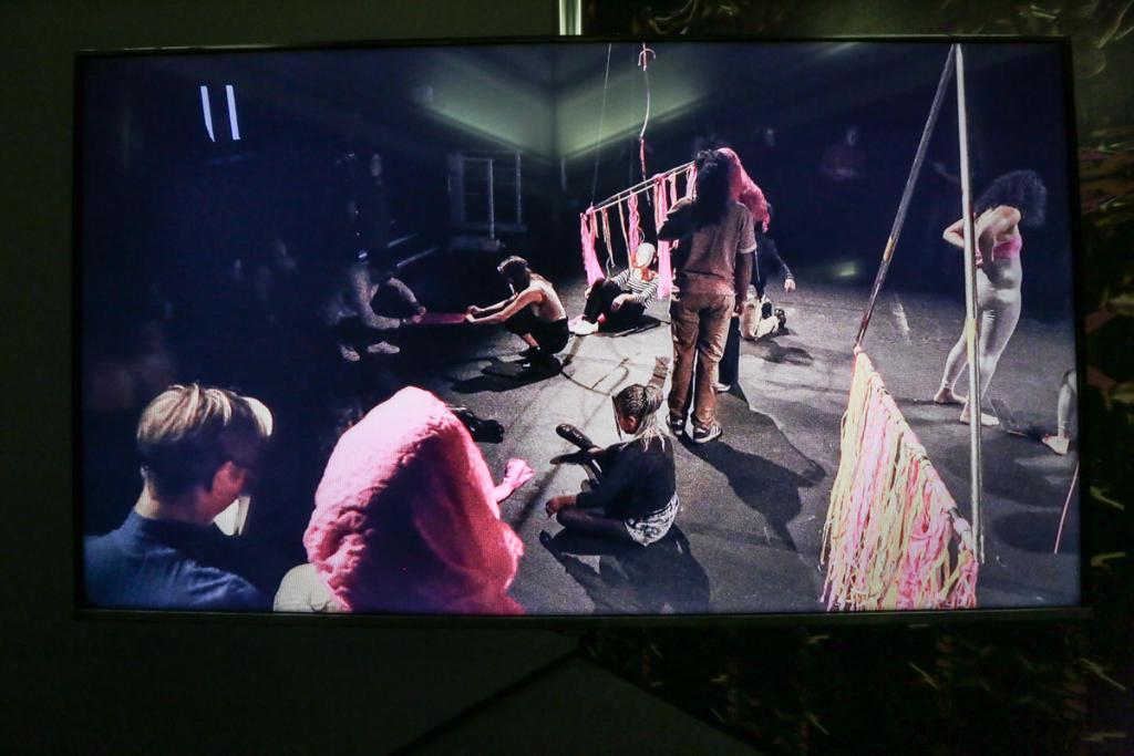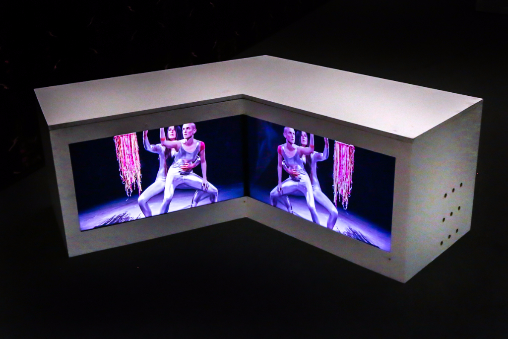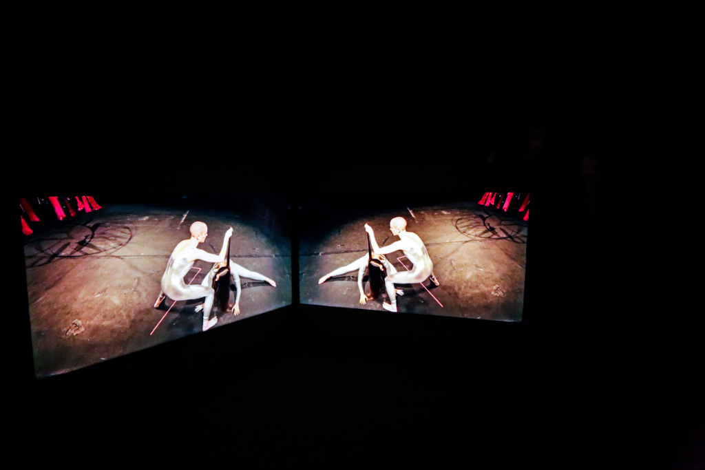 Boyce’s We Move In Her Way is a multimedia presentation of the moving form. Dancers in her installation make childish and playful movements – many of them are masked or wearing tight silver spandex and spontaneously break out into fervent clapping. The videos are on loop in two separate rooms, with each screen displaying a specific area of the stage, which requires the viewer to actively move around to experience each aspect of Boyce’s piece. It’s odd, but also highly interactive. The work is actually a documentation of an initial live performance, where the audience could participate alongside the performers and follow an improvised pattern free from constraint.
